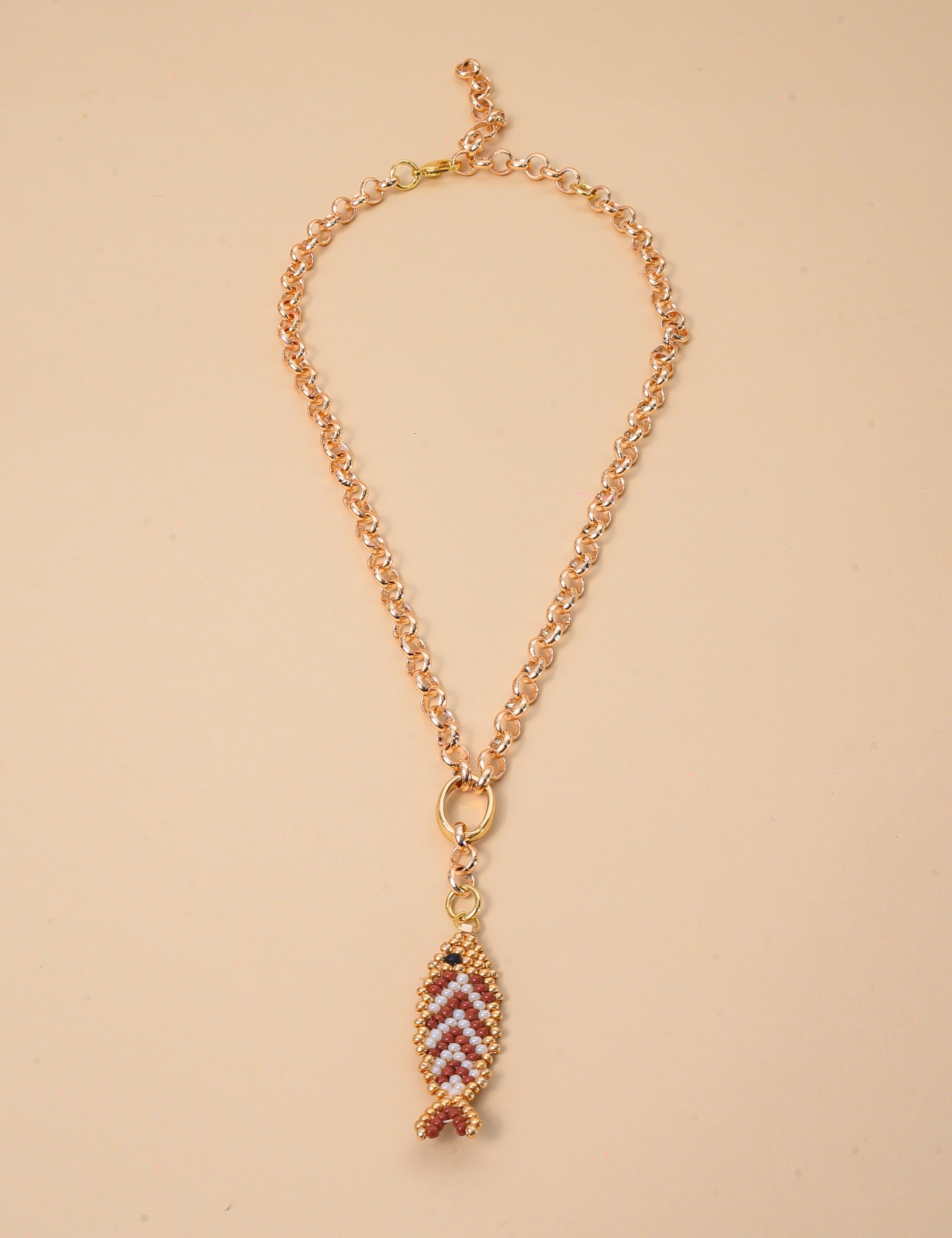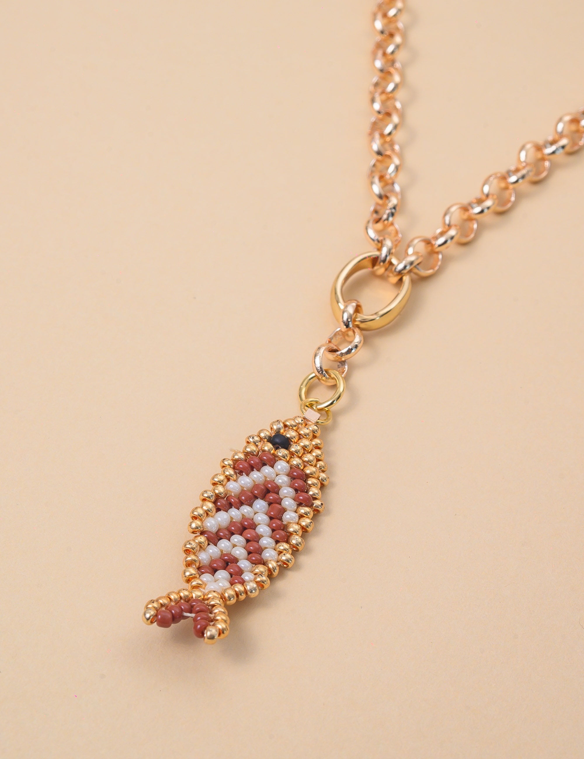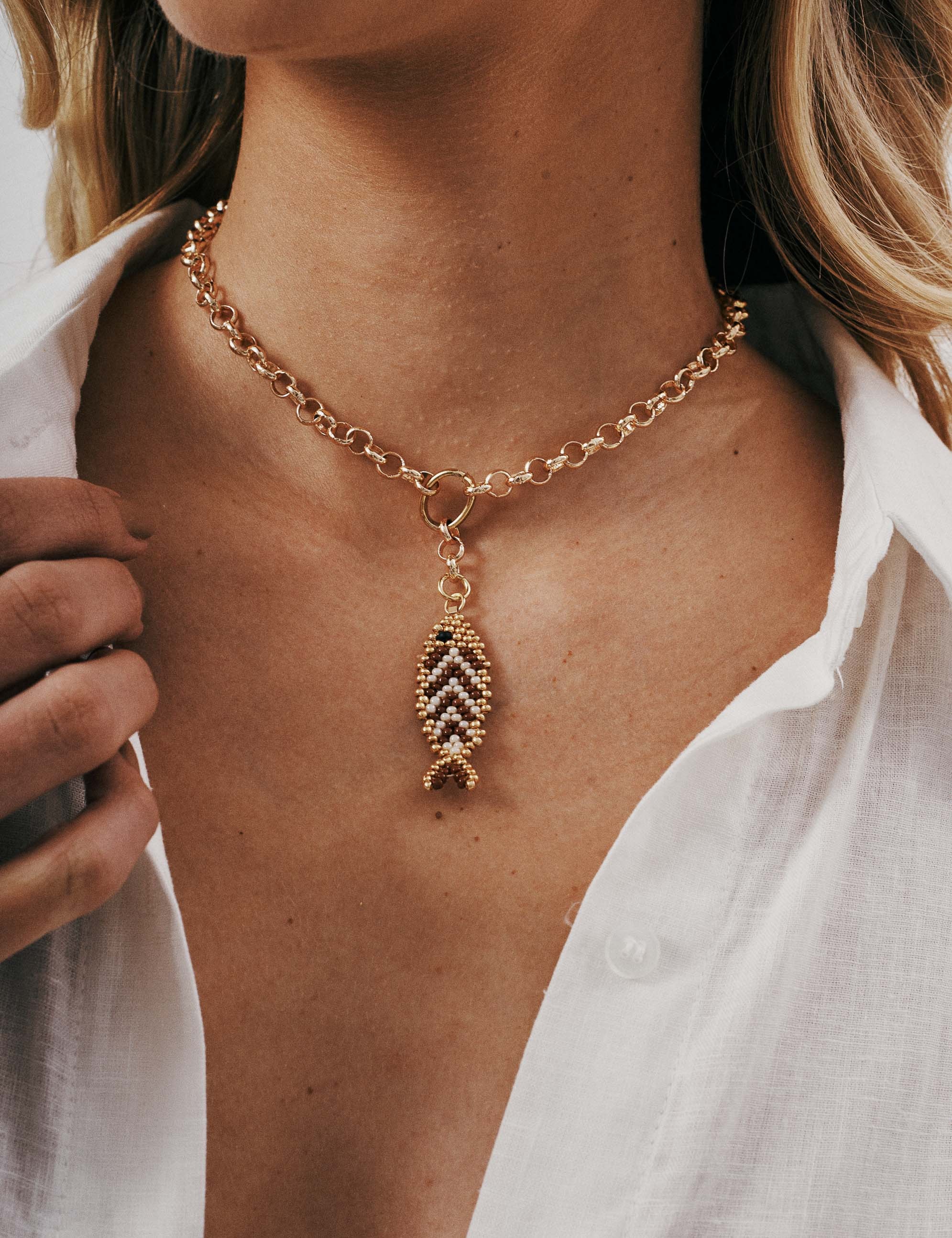 Colar com corrente elo português e pingente de peixe marrom, elegante e moderno. Ideal para compor looks com estilo e personalidade.