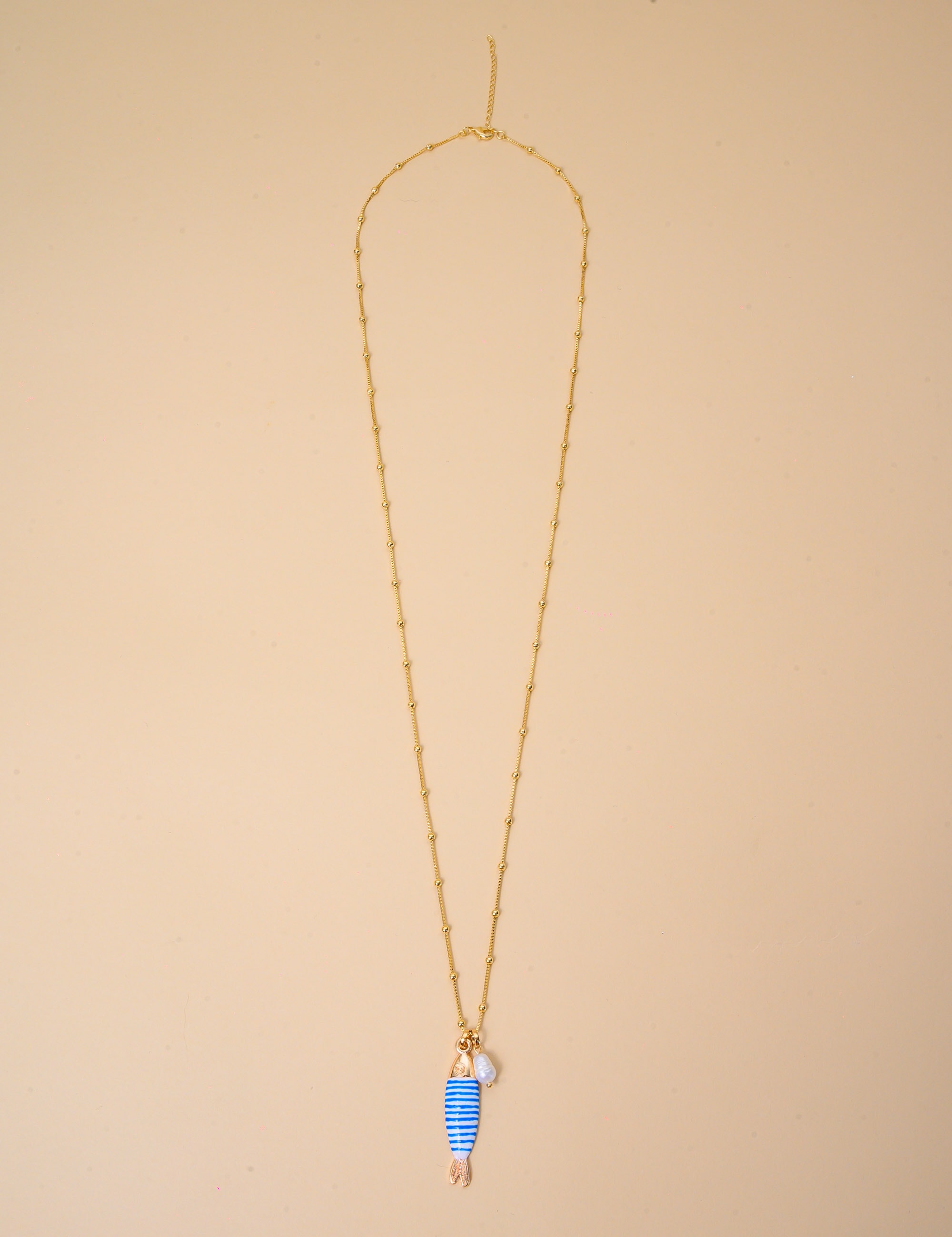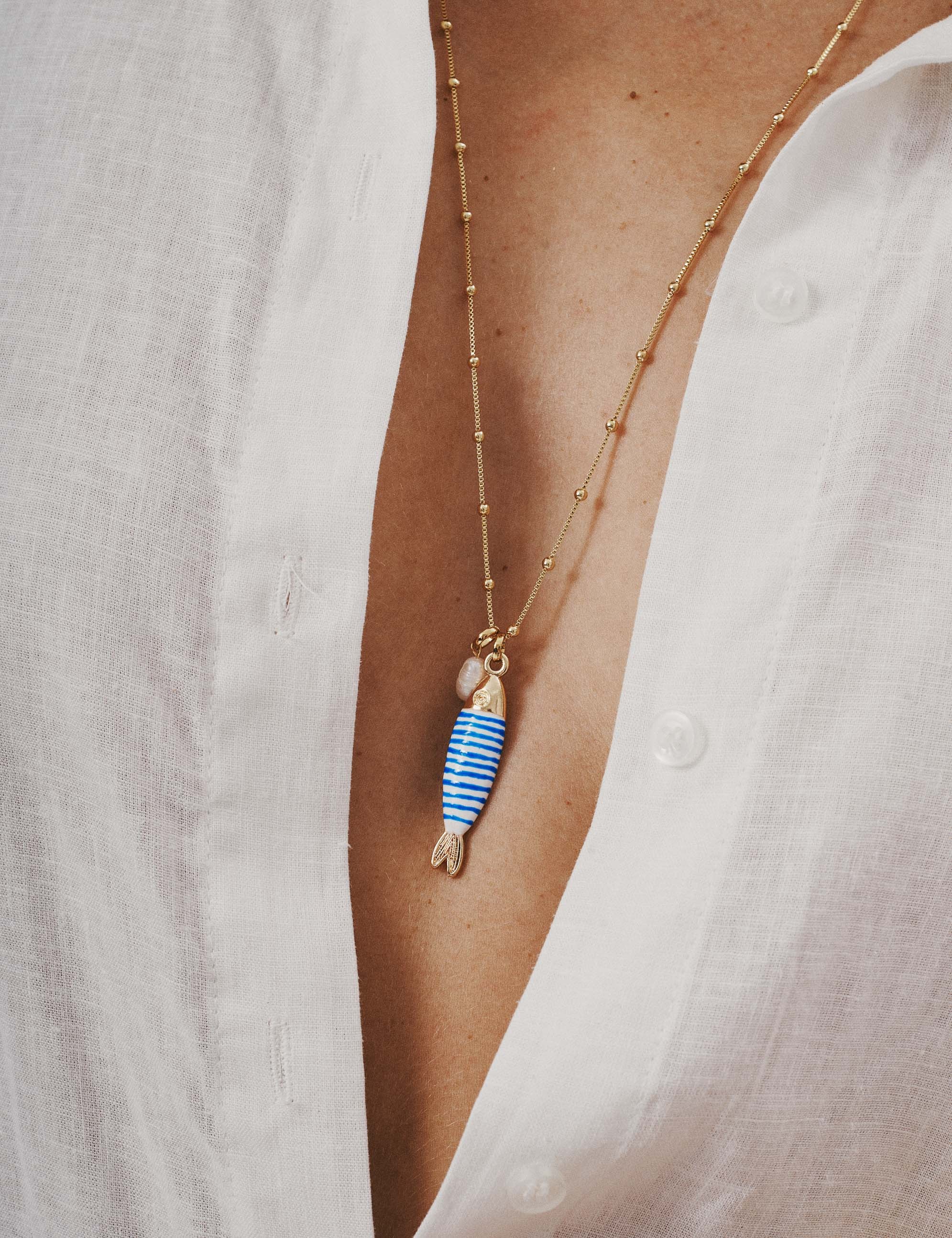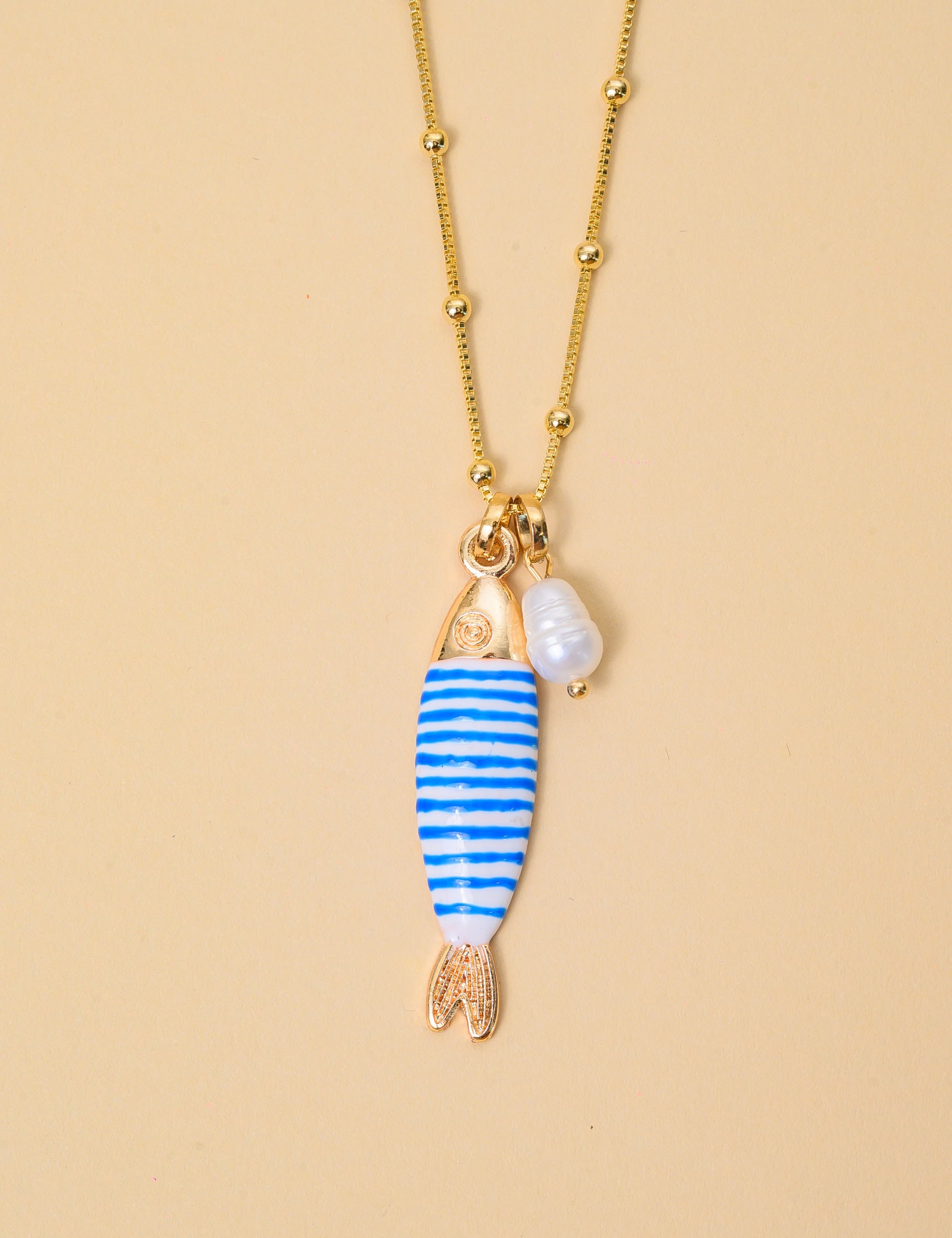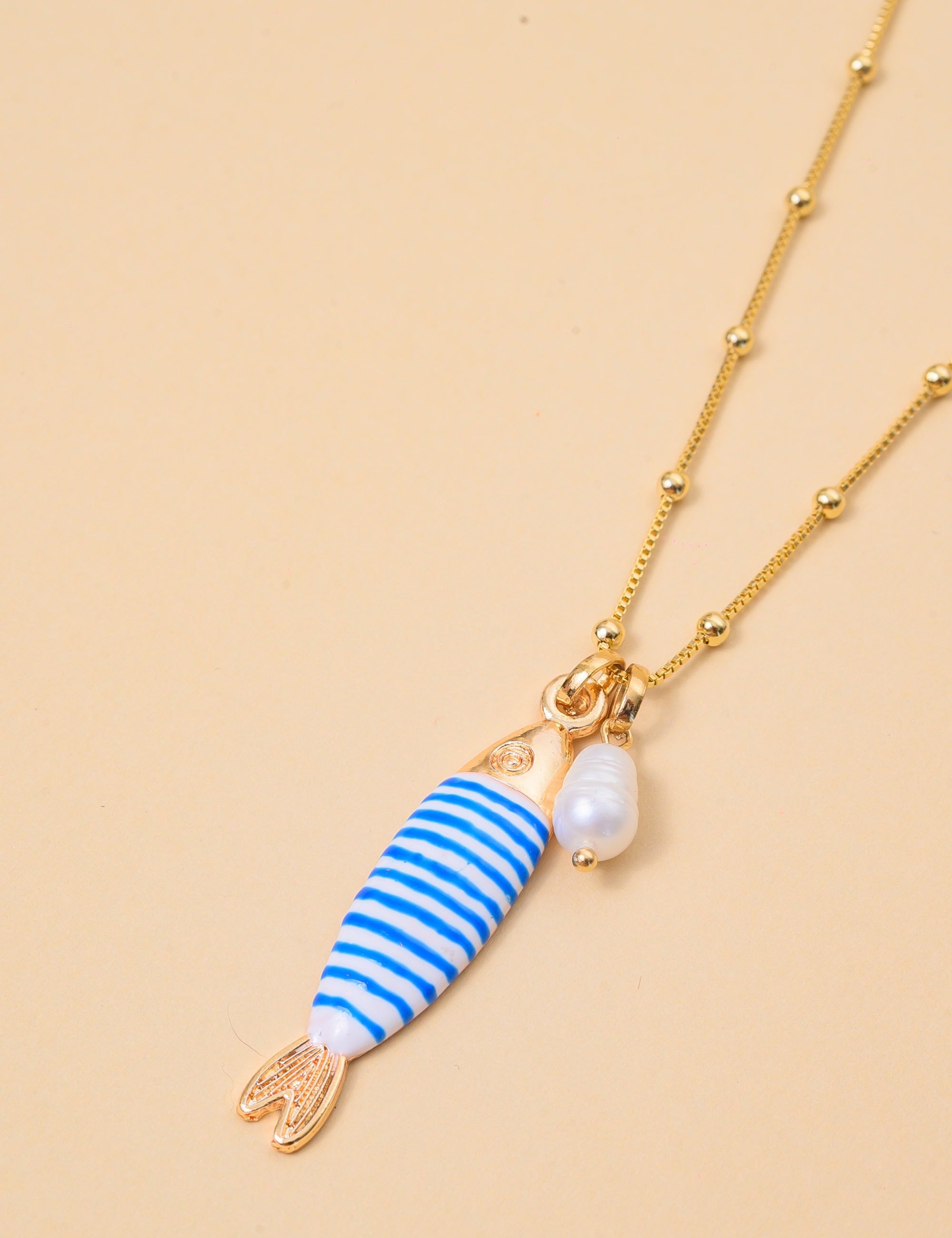 Colar de esferas com pingente de peixe listrado azul, leve e estiloso. Perfeito para um toque praiano e moderno no visual.