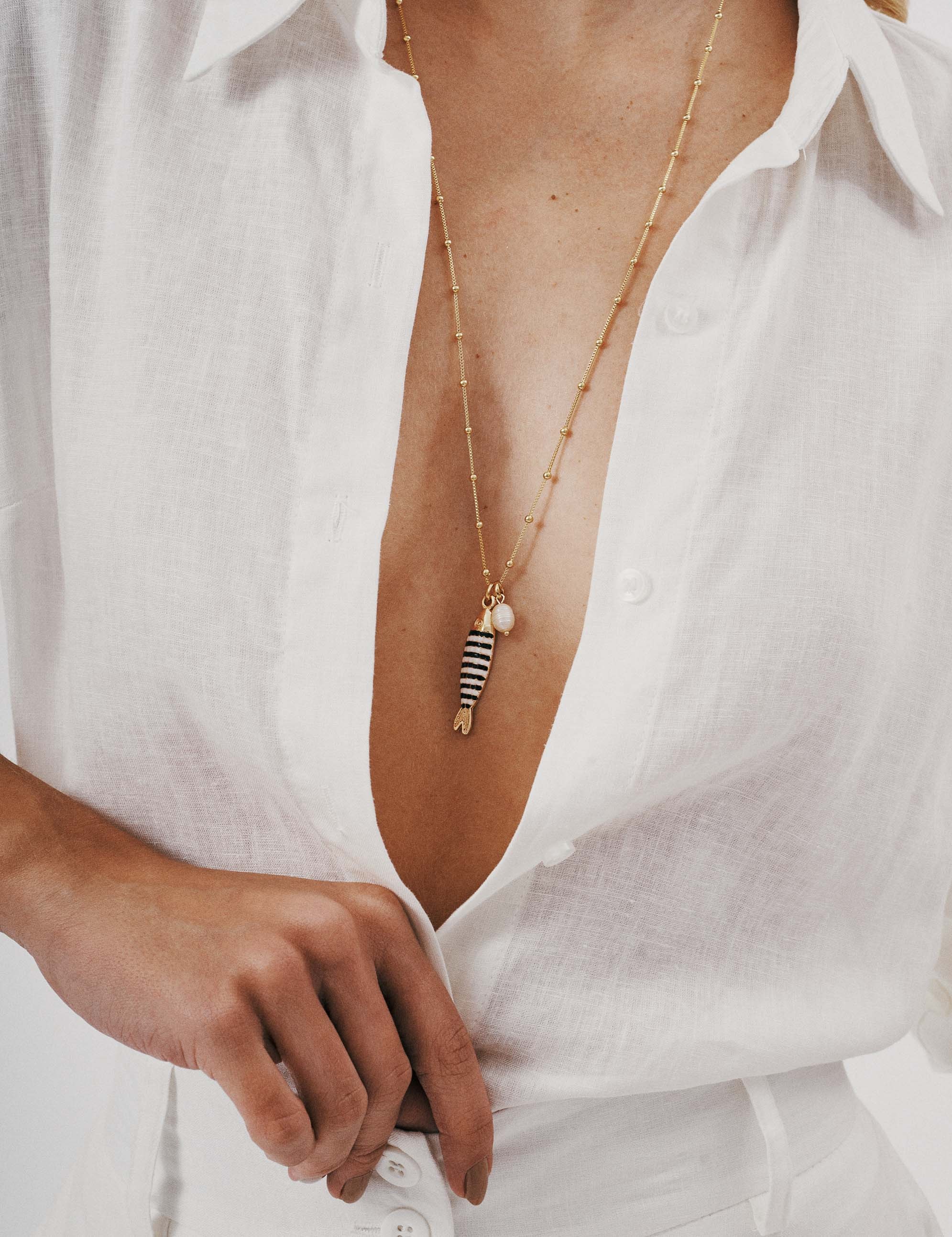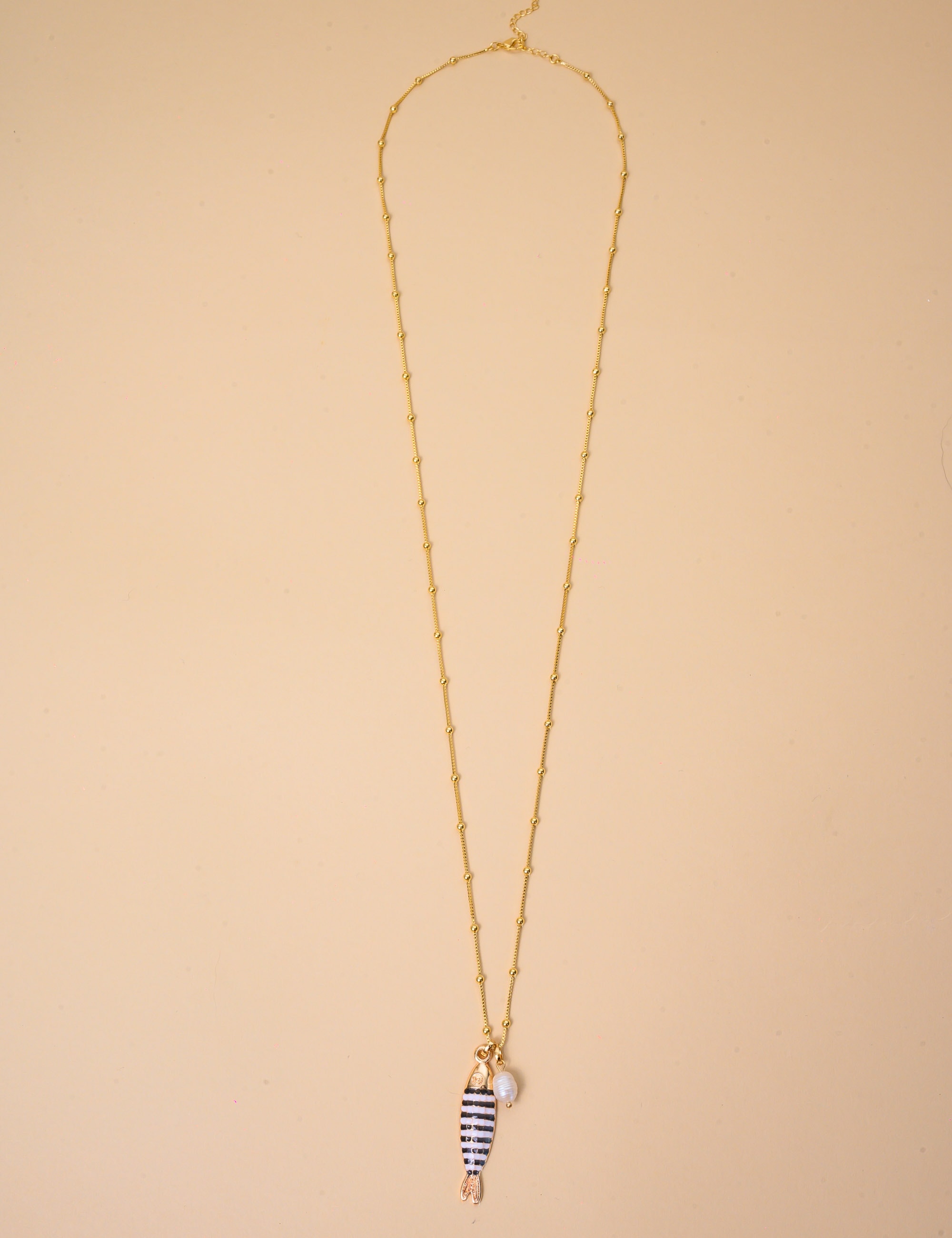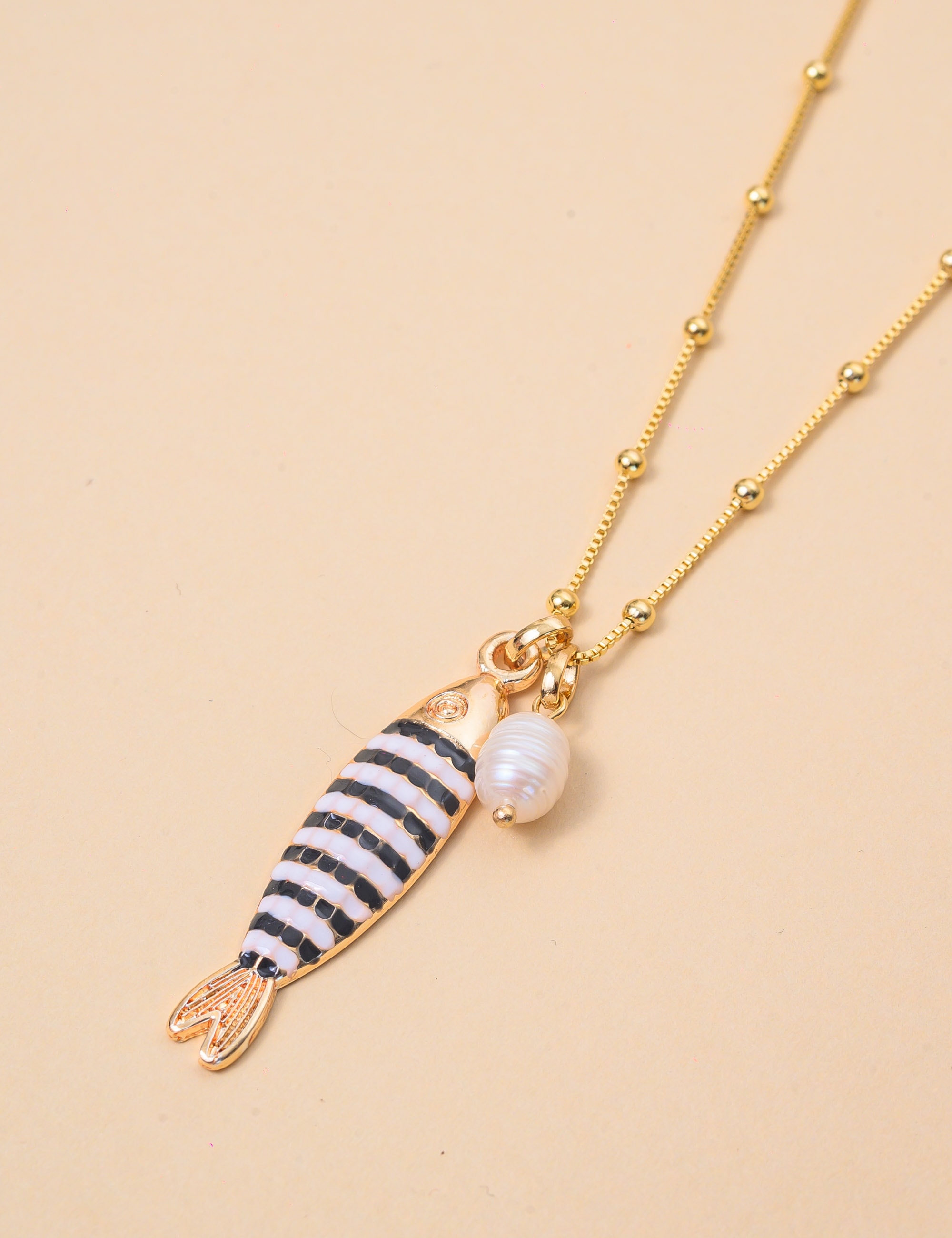 Colar de esferas com pingente de peixe listrado preto, leve e estiloso. Perfeito para um toque praiano e moderno no visual.