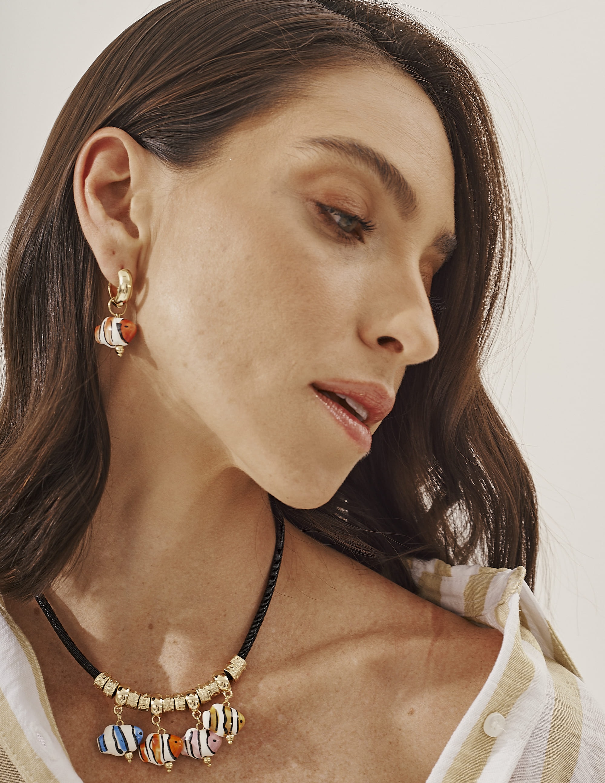 Colar de lurex com pingentes de peixinhos coloridos. Uma peça moderna e descontraída, que adiciona personalidade e um toque vibrante ao visual. Os detalhes dourados valorizam o design e destacam a composição.