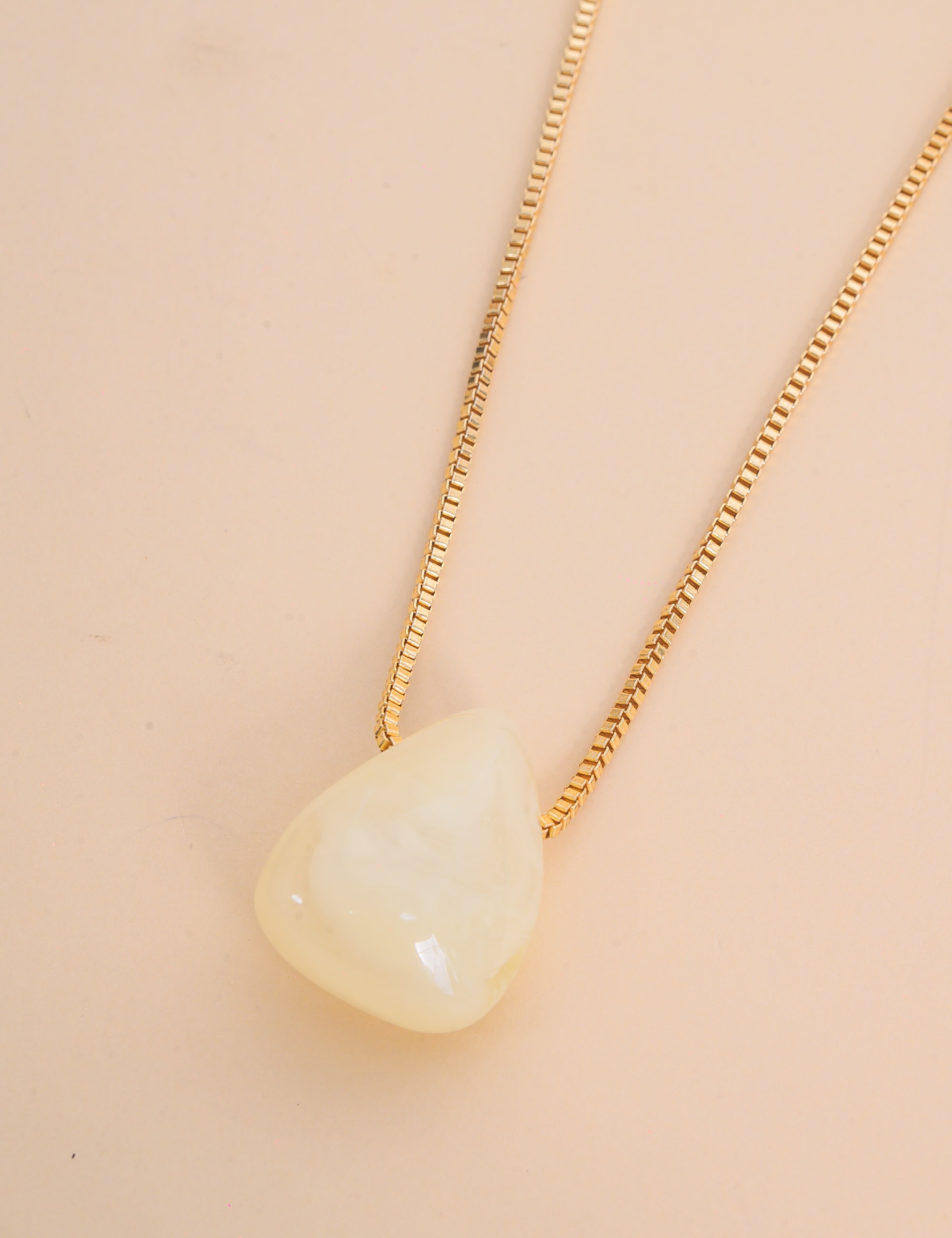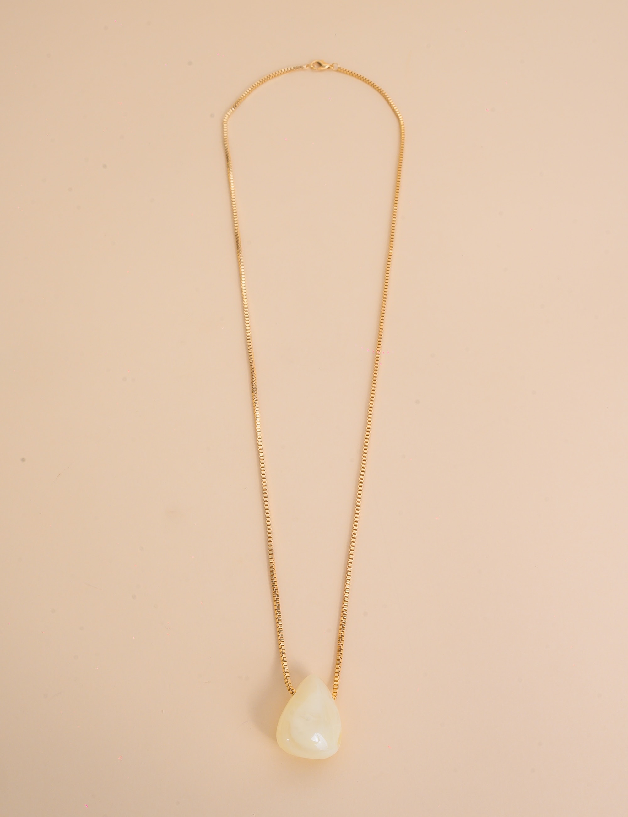 Colar de ouro com pingente de pedra resinada branca trazendo um visual moderno e descontraído. O acessório combina estilo casual com acabamento sofisticado, valorizando qualquer produção com um brilho delicado.