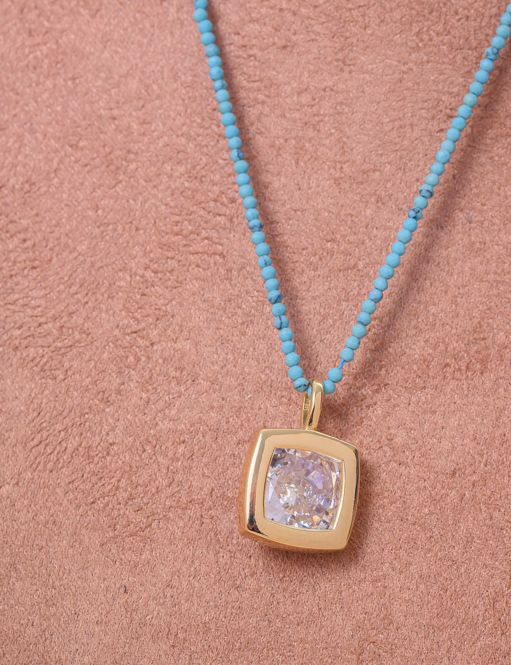 Colar com turquesa e espinélio, com pingente de cristal, peça sofisticada que combina cor e brilho para compor produções marcantes.