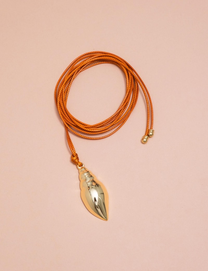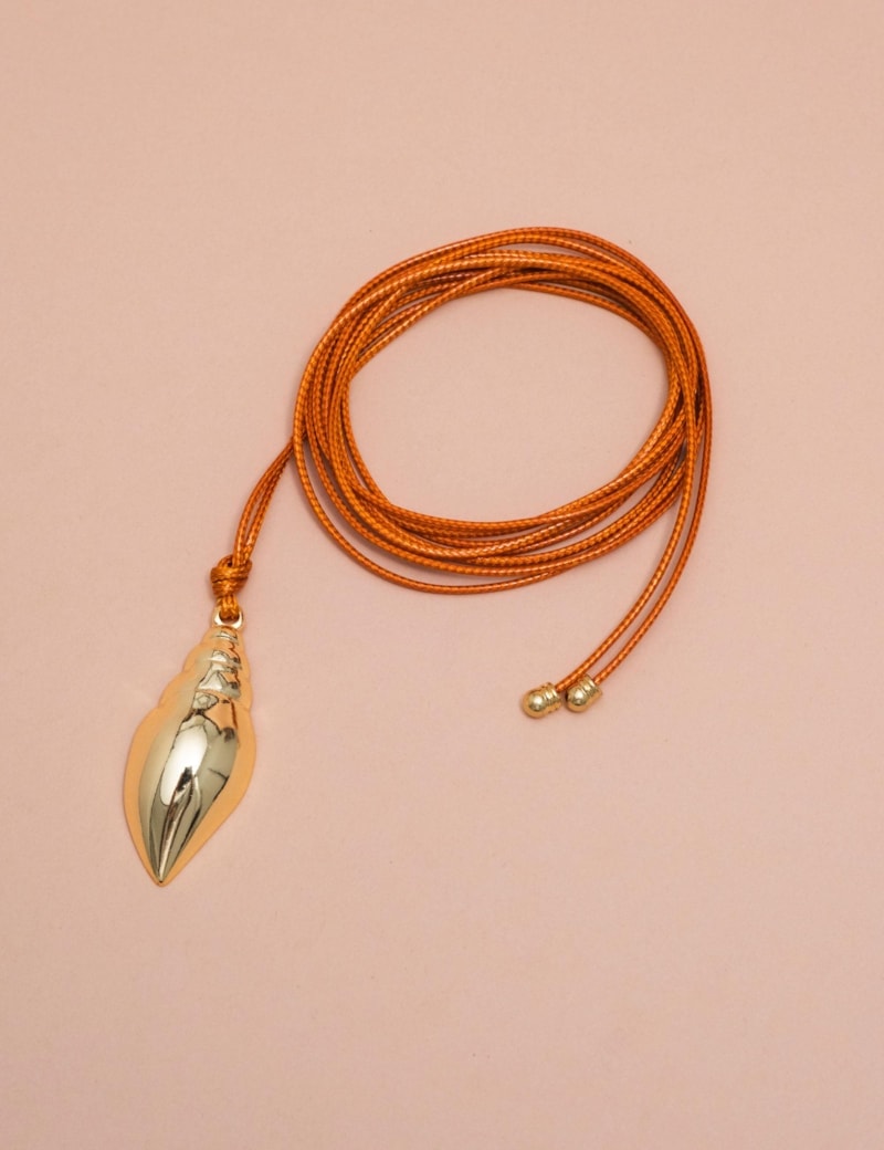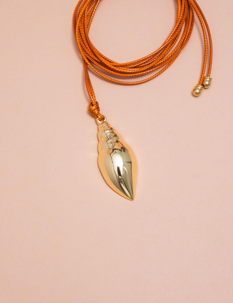 Colar em fio com detalhe de concha em acabamento dourado, peça versátil que combina elementos naturais e sofisticação.