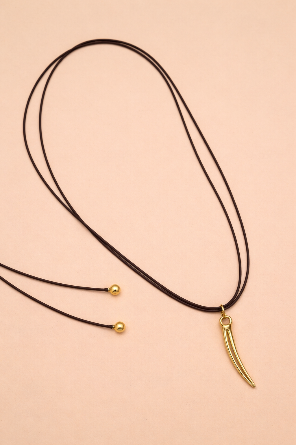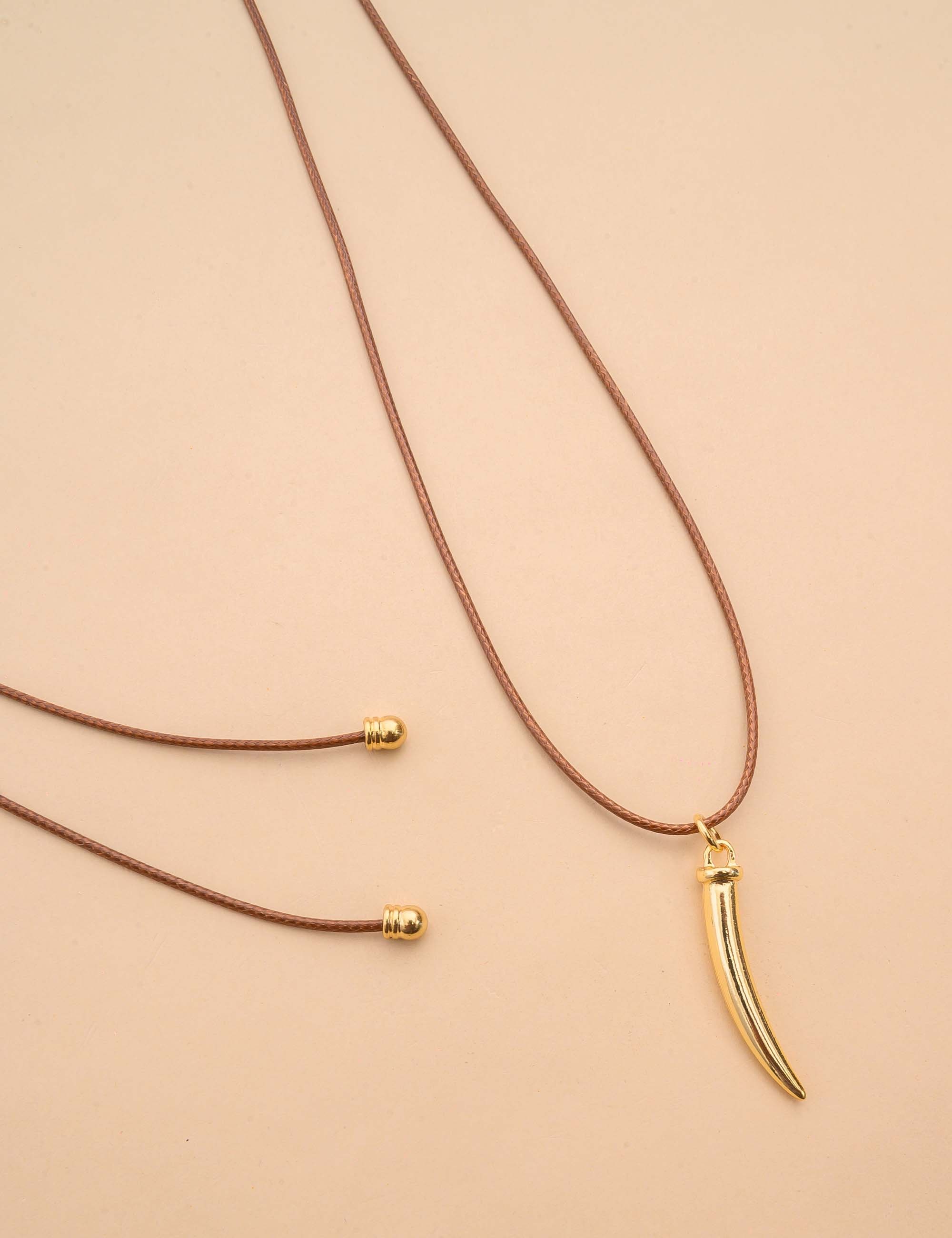 Colar com fio em tom marrom escuro e pingente modelo dente, peça versátil que traz um toque natural e moderno à composição.