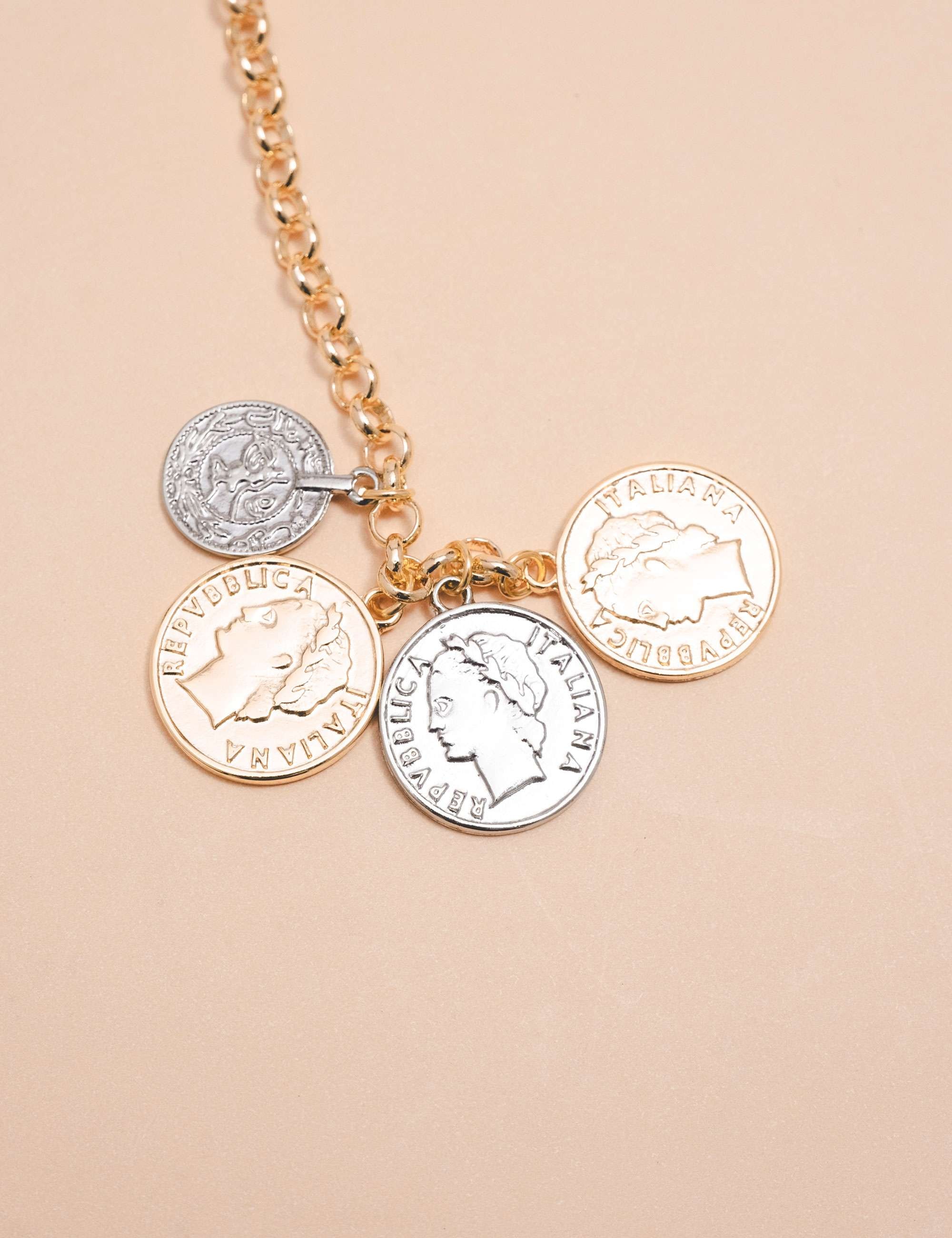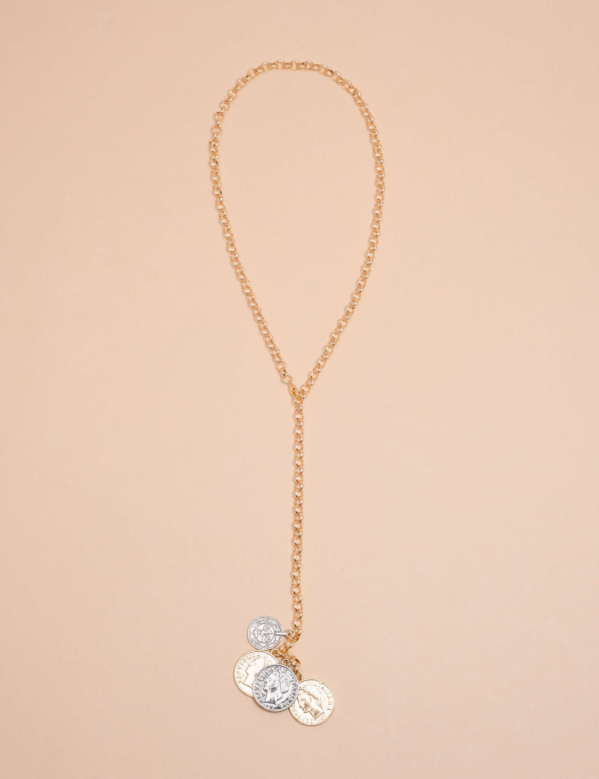 Peça: Colar gravata com detalhes de pingente de moedas duo. Seu design moderno e sofisticado é perfeito para destacar e complementar qualquer estilo com um toque único.
