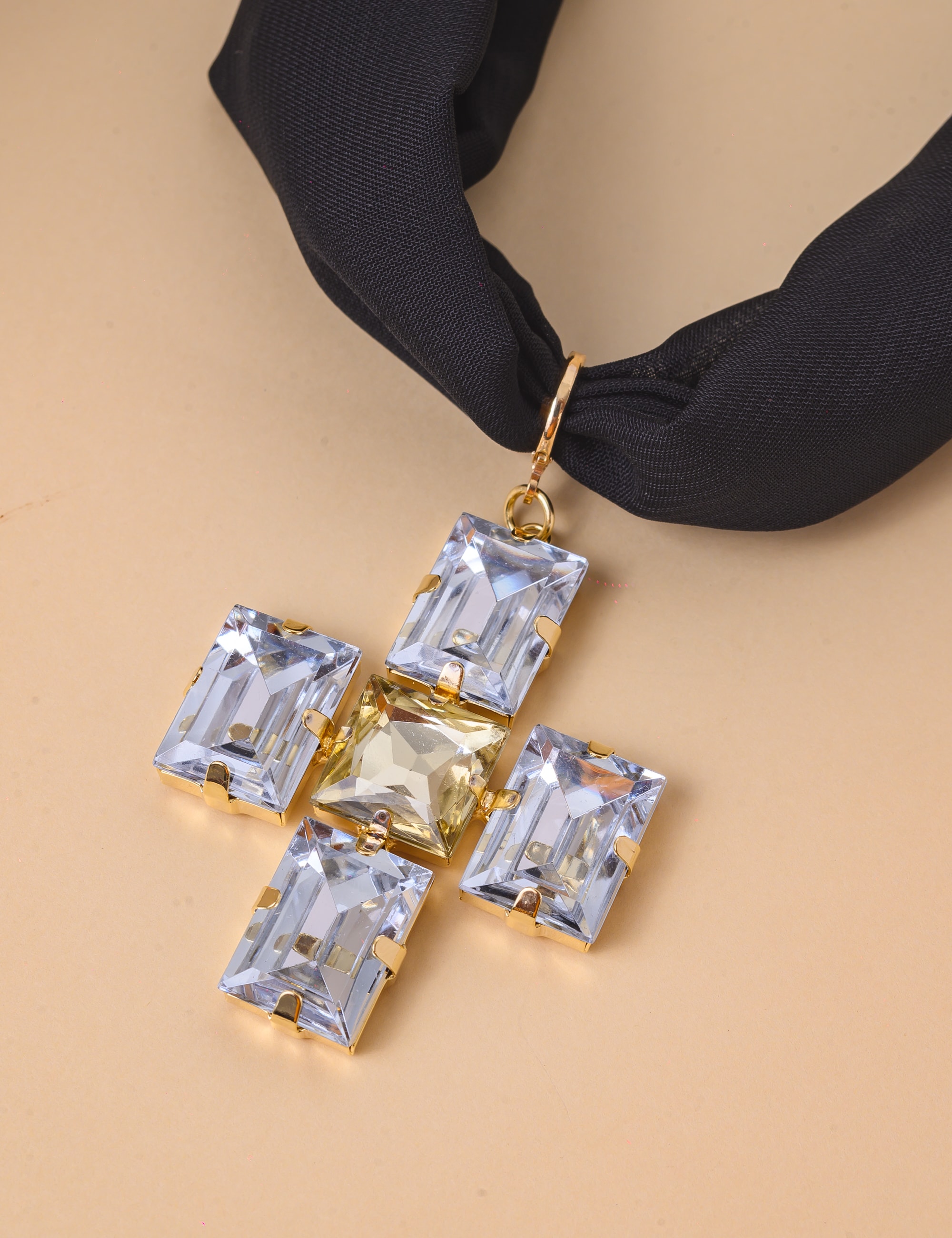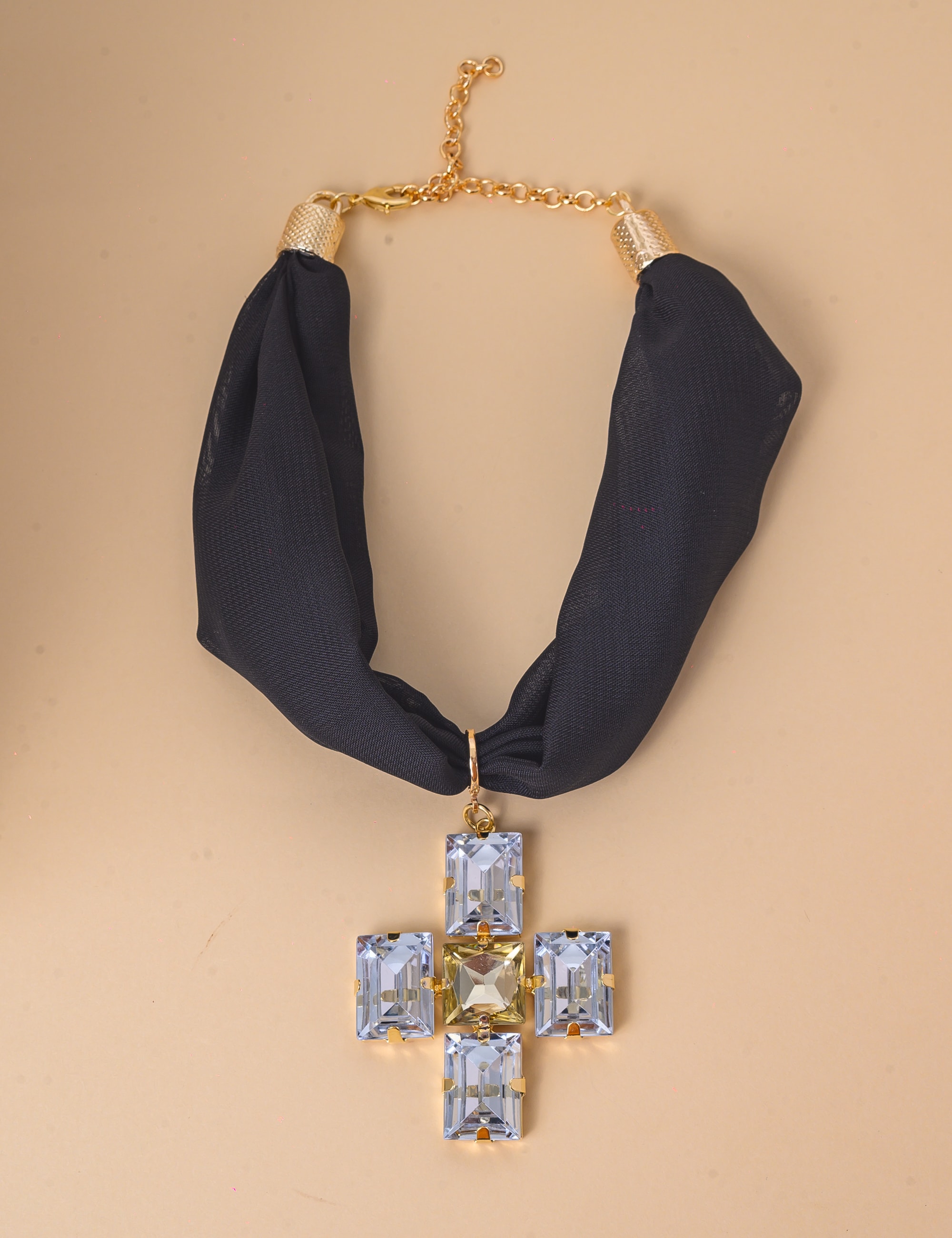 Adicione um toque de sofisticação e estilo ao seu visual com este colar de lenço preto, adornado com um pingente em formato de cruz. O design exclusivo combina a leveza do tecido com a imponência do pingente, que apresenta detalhes delicados em cristal, trazendo brilho na medida certa. Ideal para compor looks modernos, com personalidade e um toque de elegância atemporal.