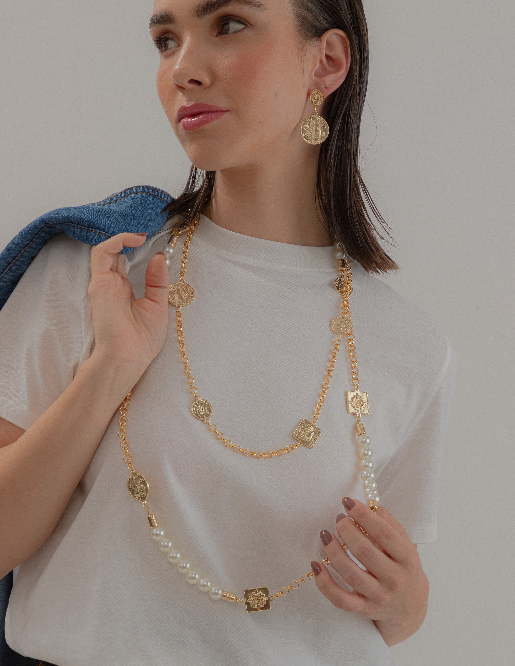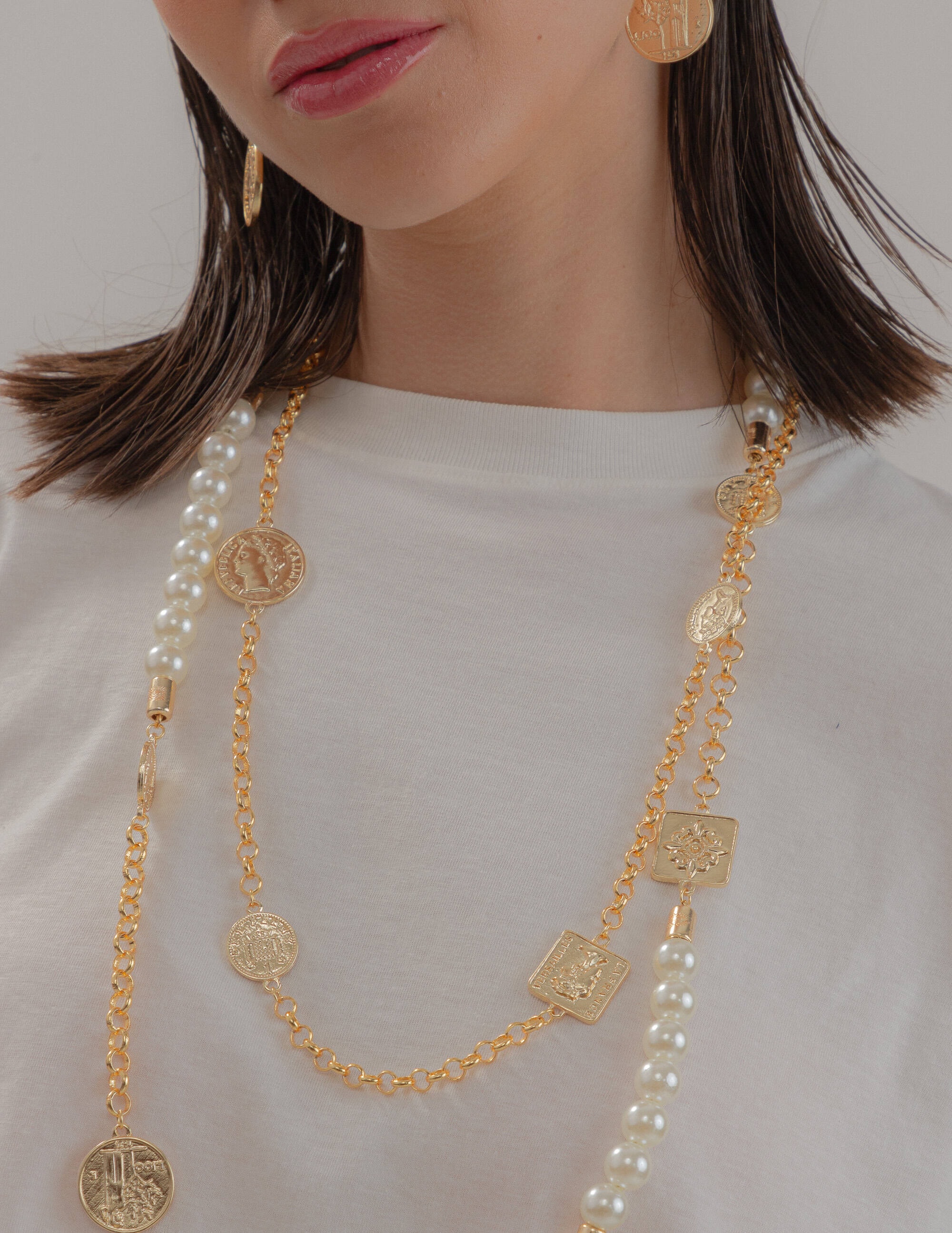 Elegância e sofisticação em uma peça única. Este colar longo combina delicadas pérolas com detalhes em moedas douradas, criando um visual clássico e atemporal. Perfeito para complementar looks do dia a dia ou ocasiões especiais, adicionando charme e personalidade ao seu estilo.