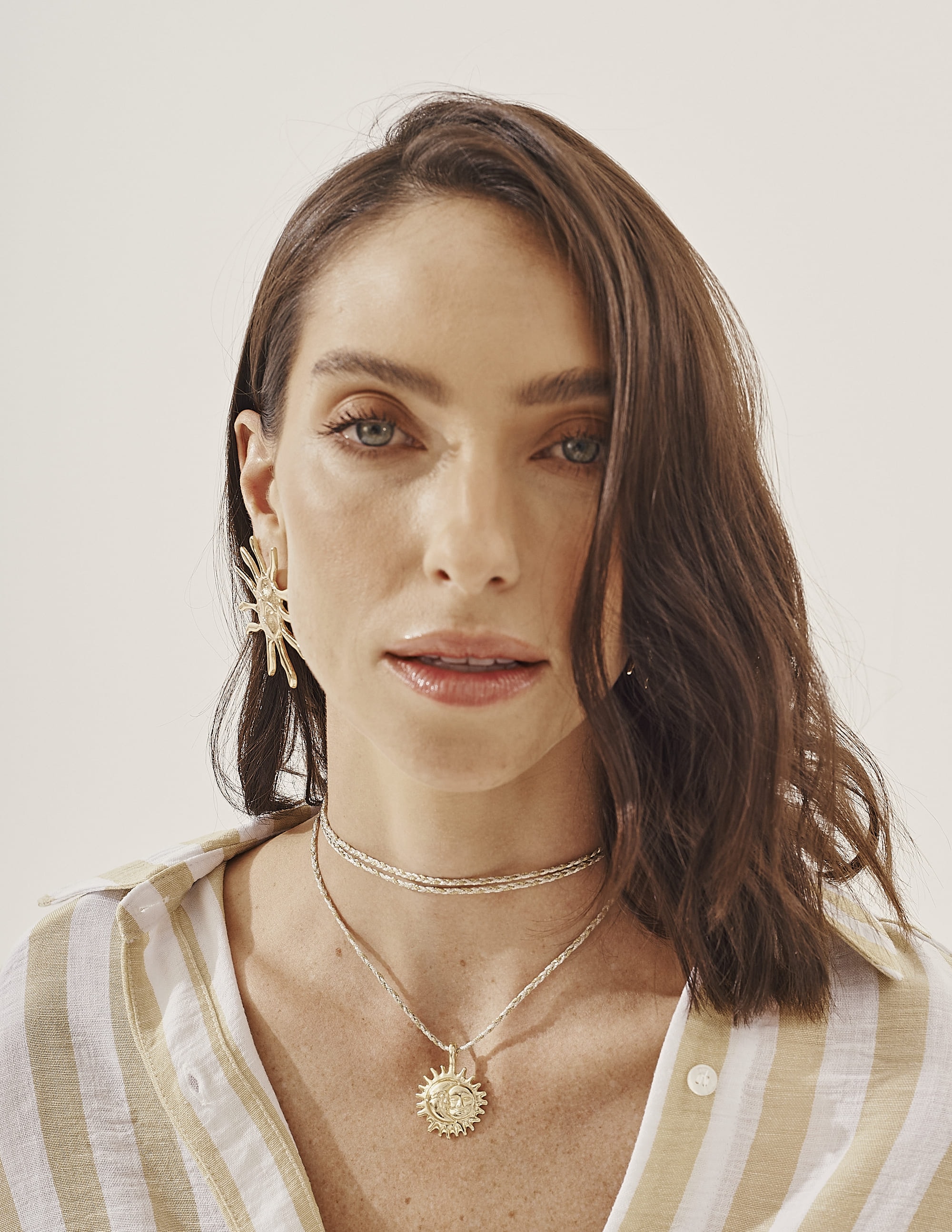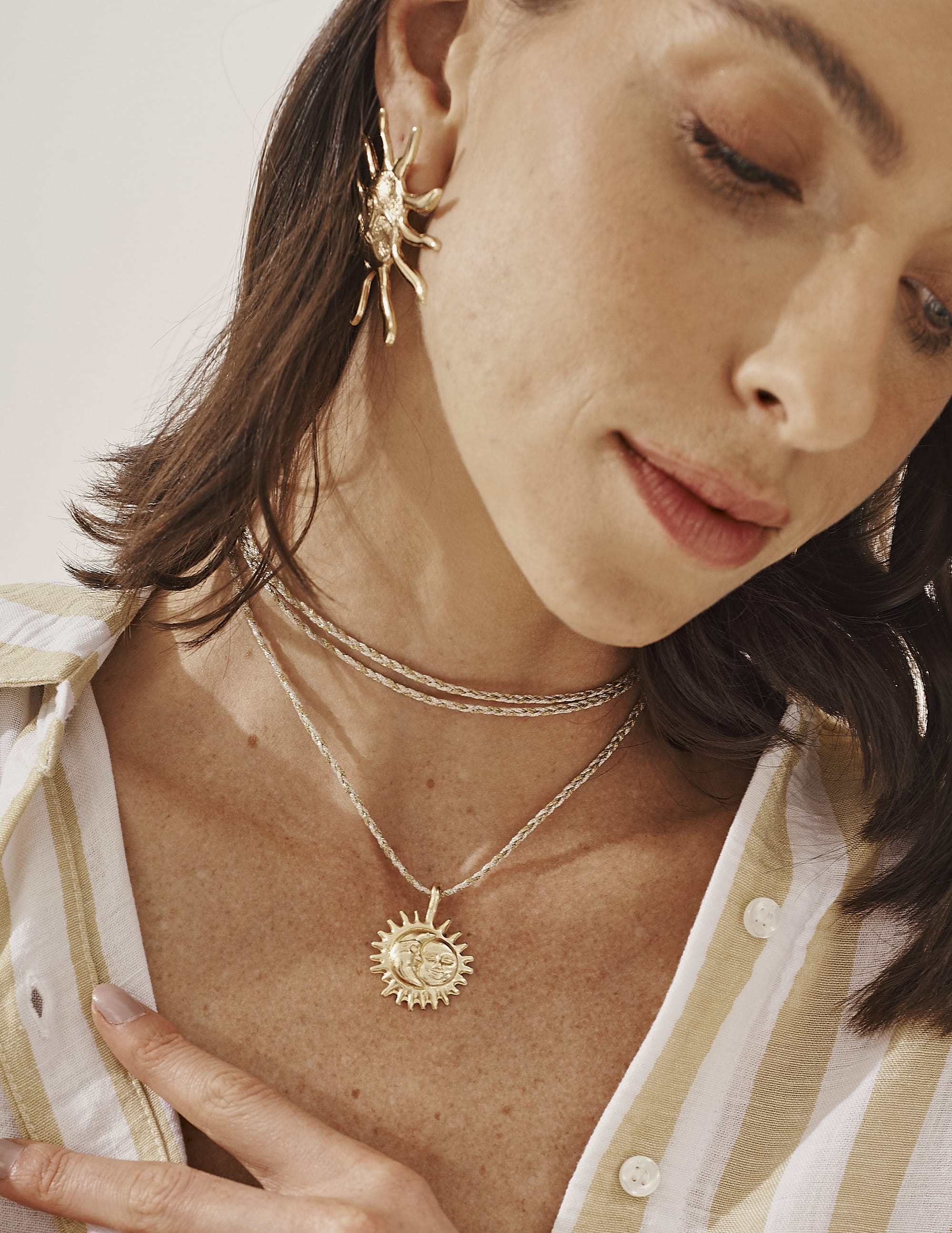 Colar longo pingente de ouro sol e lua trazendo um visual moderno e descontraído. O acessório combina estilo casual com acabamento sofisticado, valorizando qualquer produção com um brilho delicado.