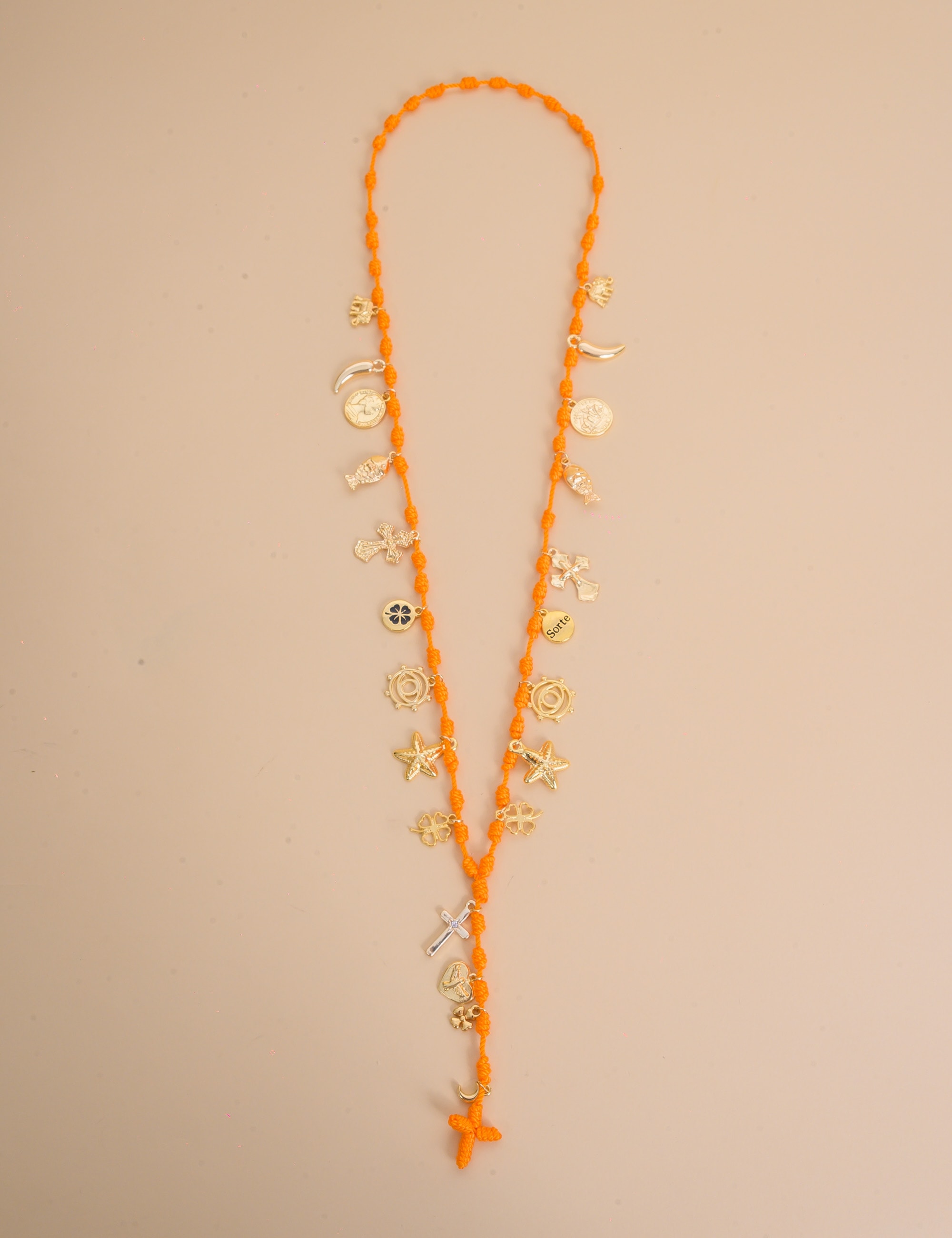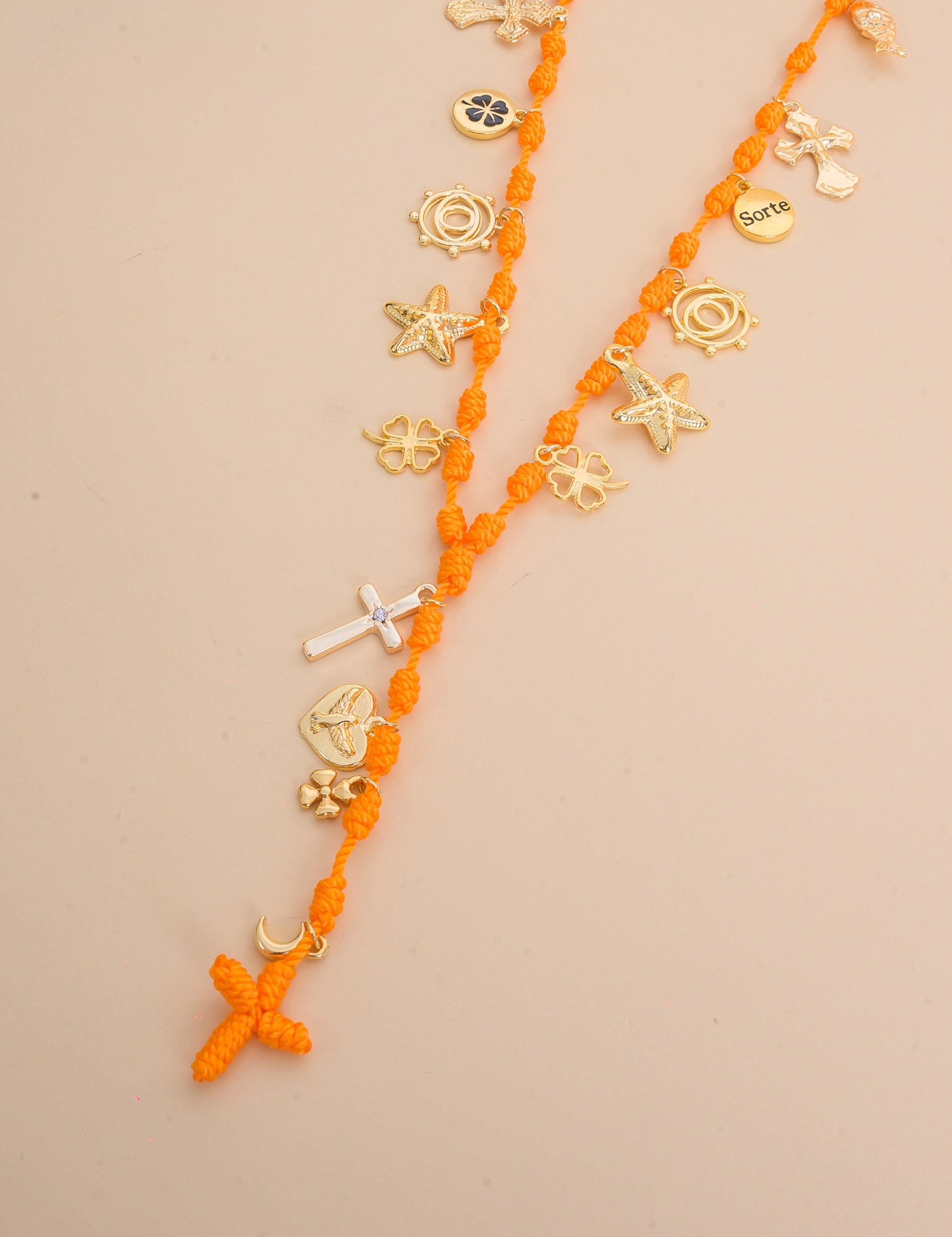 Colar laranja com diversos pingentes dourados, moderno e cheio de charme para realçar qualquer look.