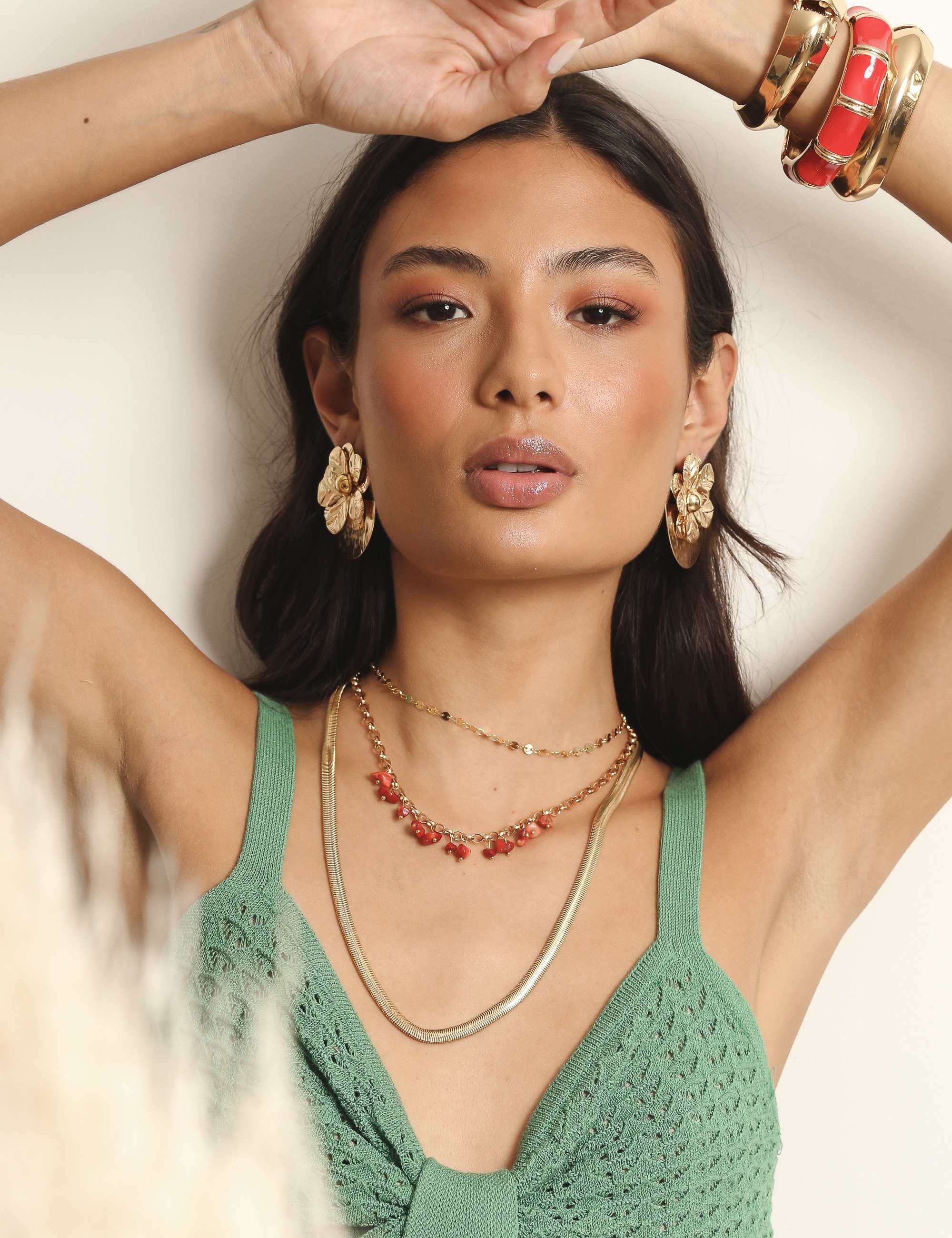 Todos os nossos metais são banhados a ouro, possuem camada protetiva para bijuterias finas e também possuem camada de metal precioso em sua composição. As bijuterias precisam de cuidados, limpe-as com flanela seca e macia, evite contato direto com cosméticos, areia, praia e piscina.