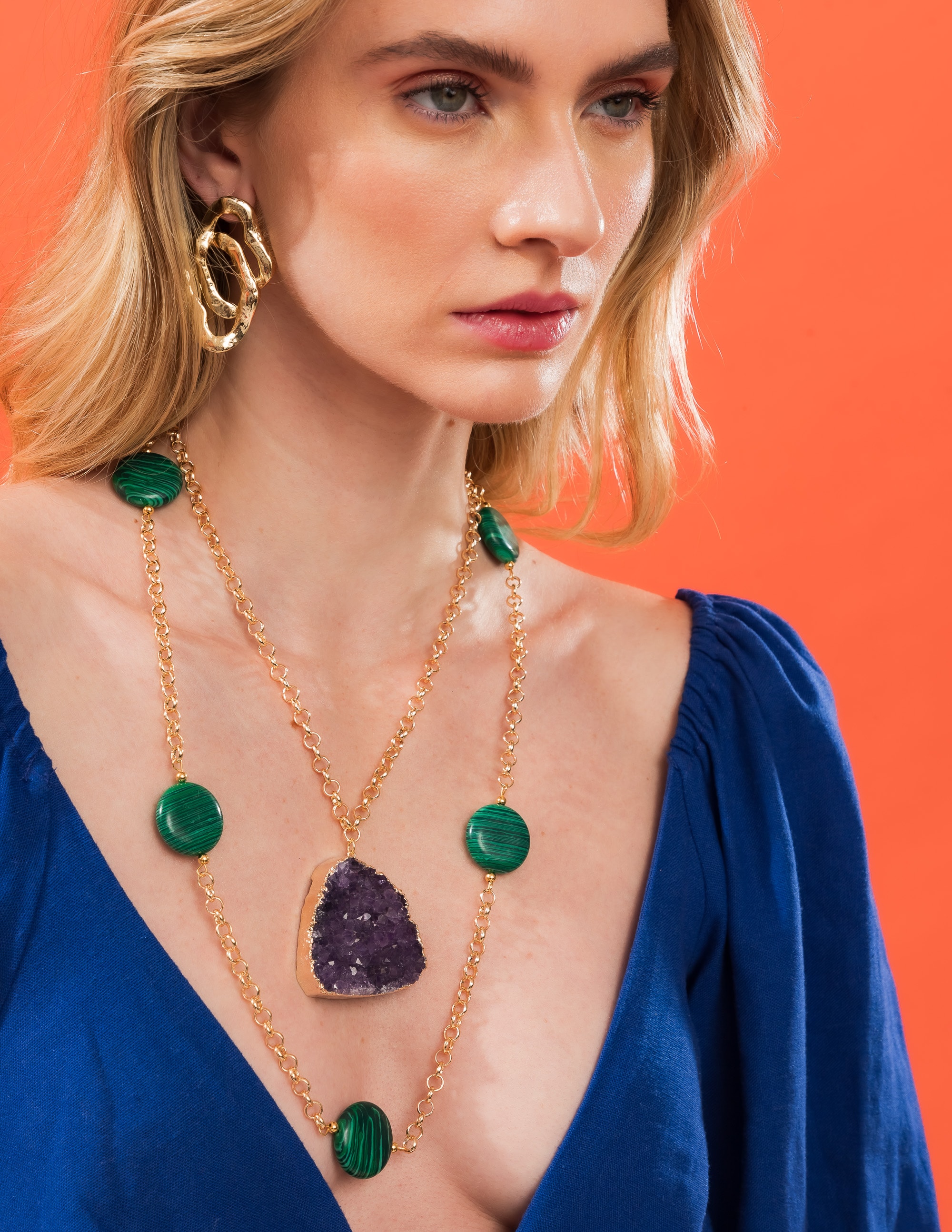 Todos os nossos metais são banhados a ouro, possuem camada protetiva para bijuterias finas e também possuem camada de metal precioso em sua composição. As bijuterias precisam de cuidados, limpe-as com flanela seca e macia, evite contato direto com cosméticos, areia, praia e piscina.