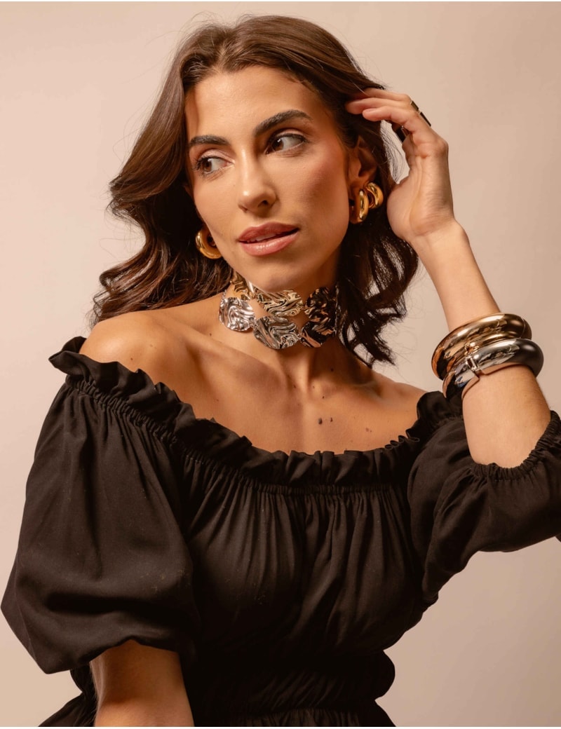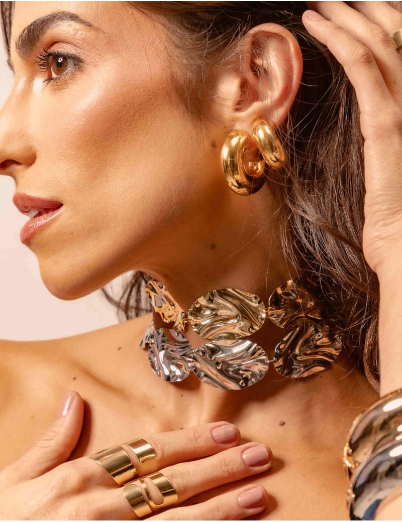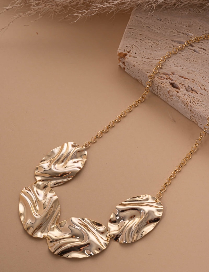 Colar em metal com chapa em acabamento dourado, peça moderna e versátil que agrega estilo e presença ao visual.