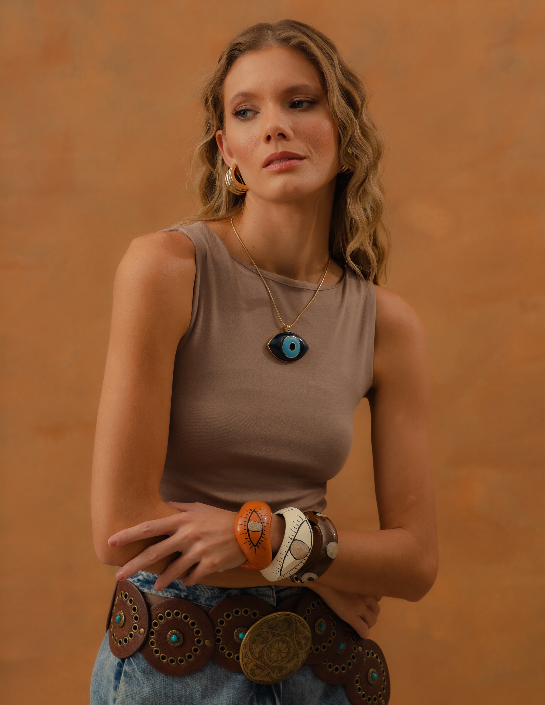 Todos os nossos metais são banhados a ouro, possuem camada protetiva para bijuterias finas e também possuem camada de metal precioso em sua composição. As bijuterias precisam de cuidados, limpe-as com flanela seca e macia, evite contato direto com cosméticos, areia, praia e piscina.