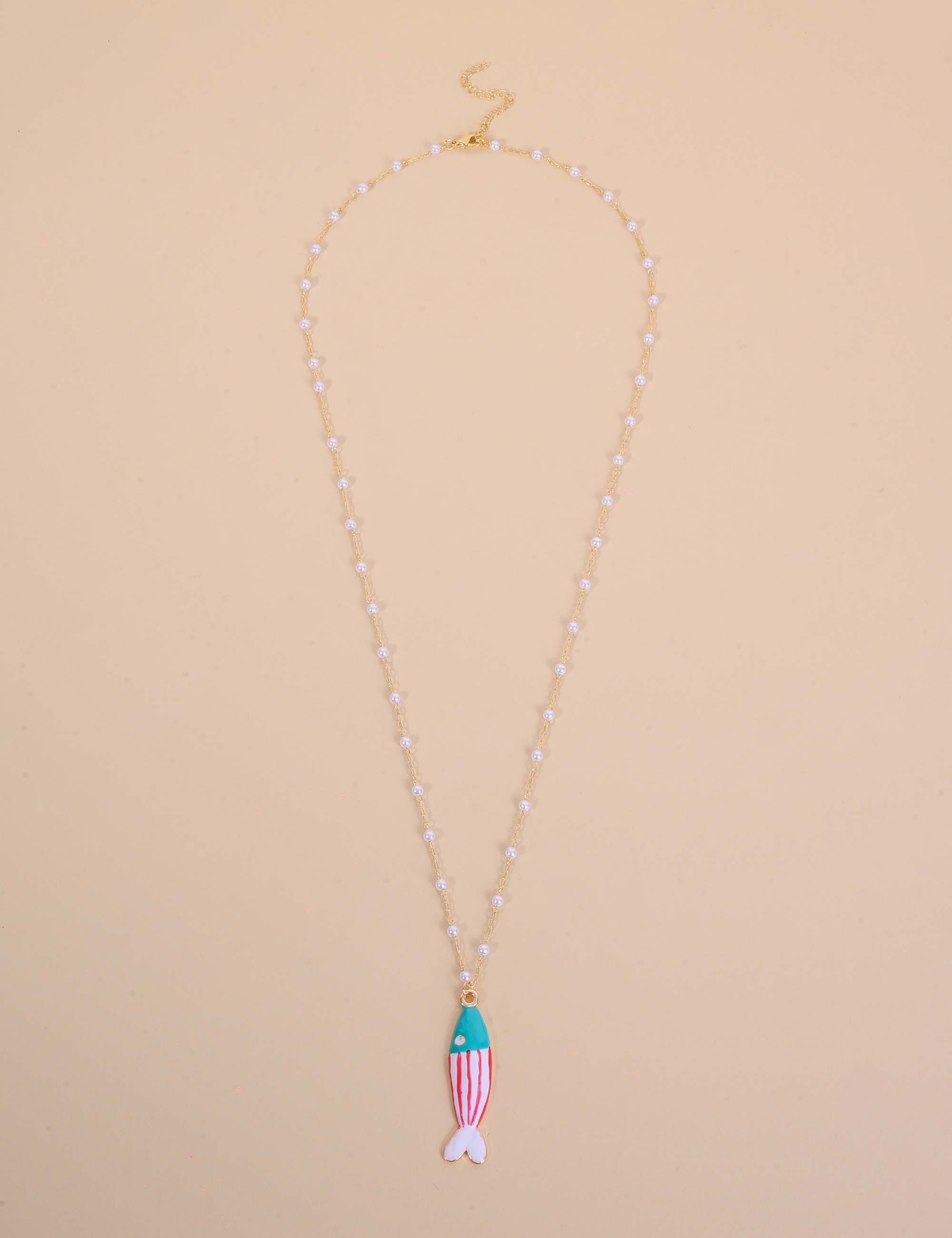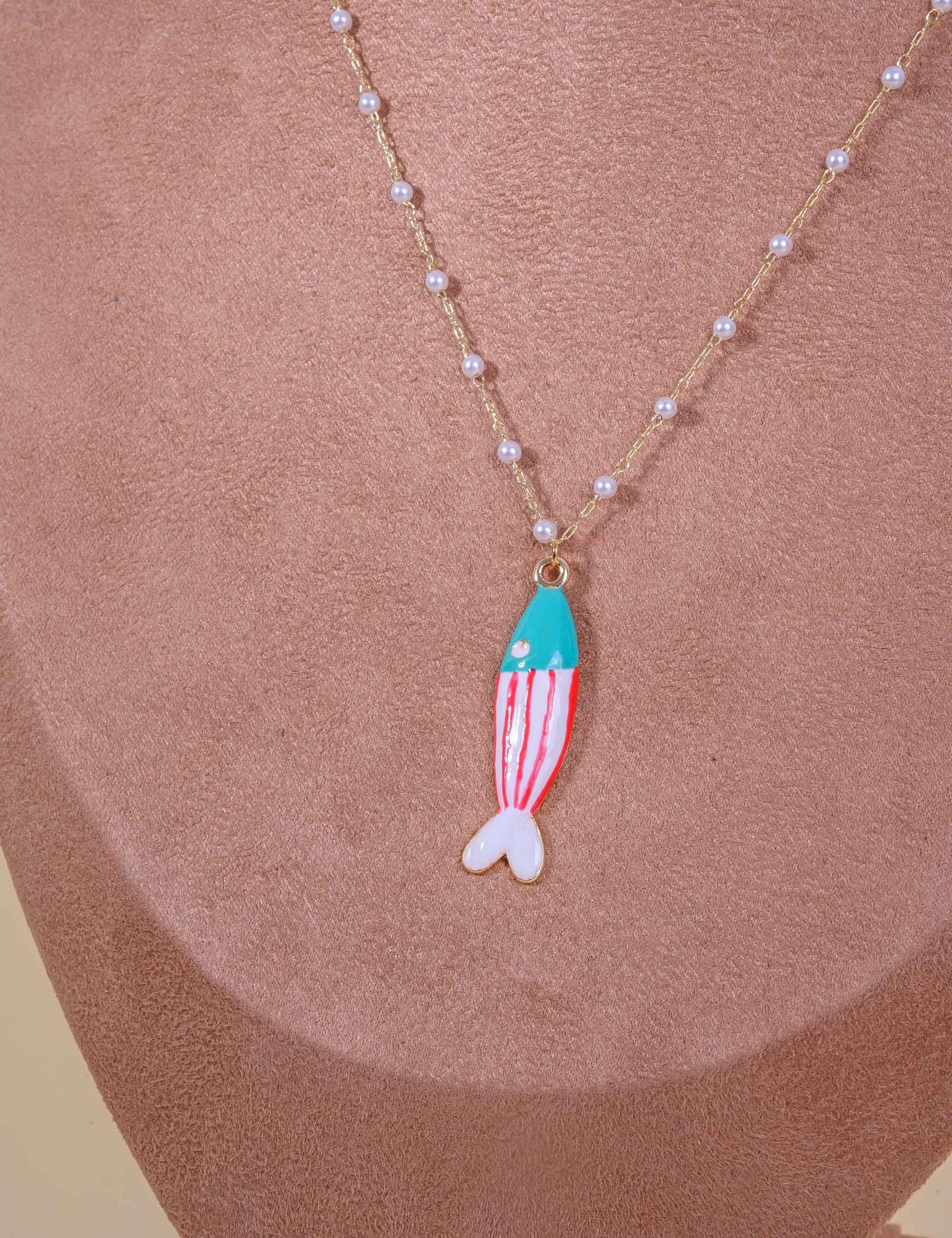 Colar banhado a Ouro com pérolas delicadas e pingente de peixe, unindo elegância e leveza em uma peça cheia de charme.