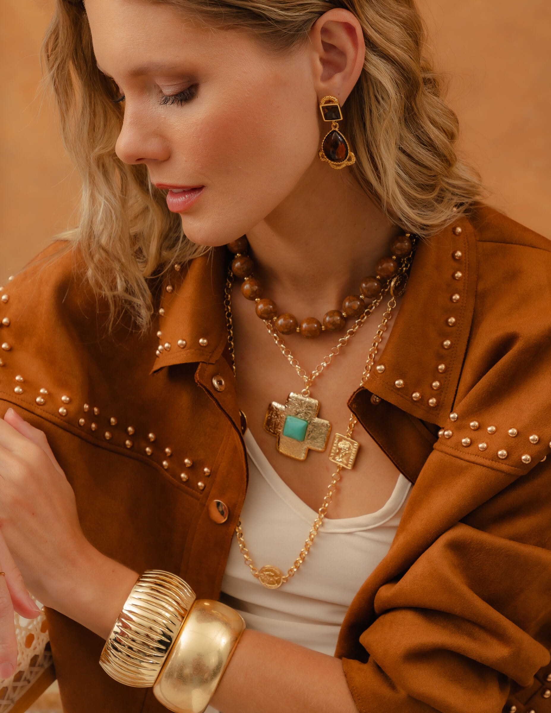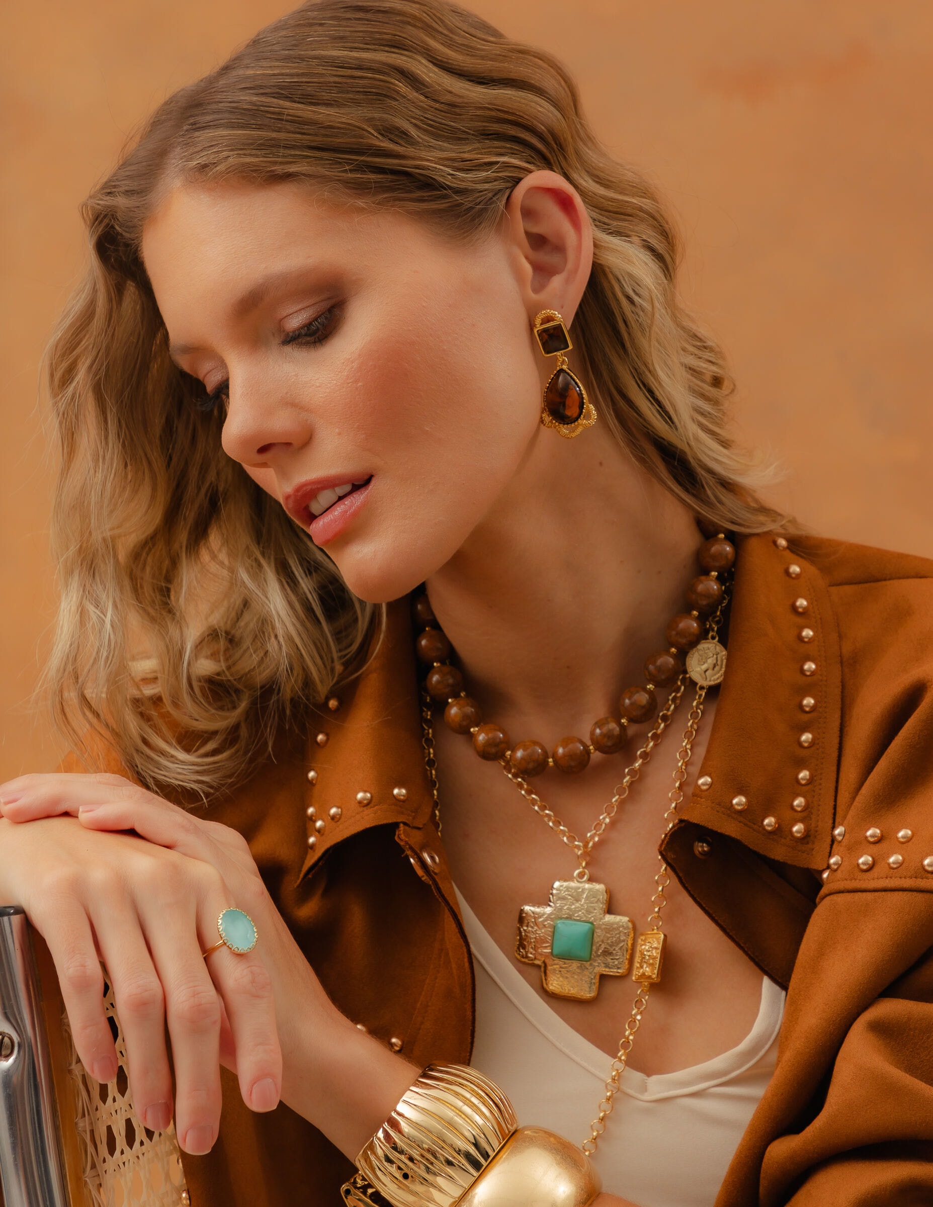 Todos os nossos metais são banhados a ouro, possuem camada protetiva para bijuterias finas e também possuem camada de metal precioso em sua composição. As bijuterias precisam de cuidados, limpe-as com flanela seca e macia, evite contato direto com cosméticos, areia, praia e piscina.