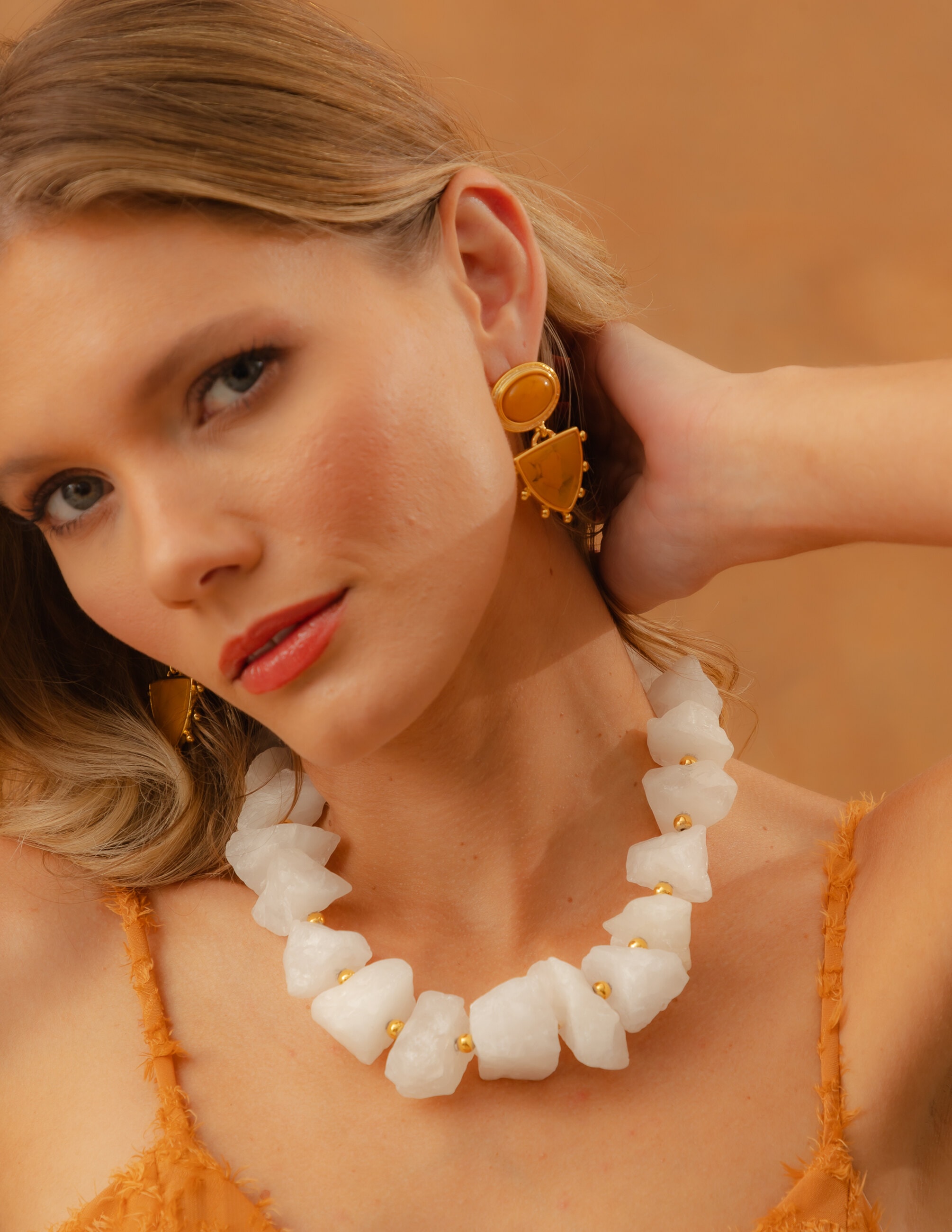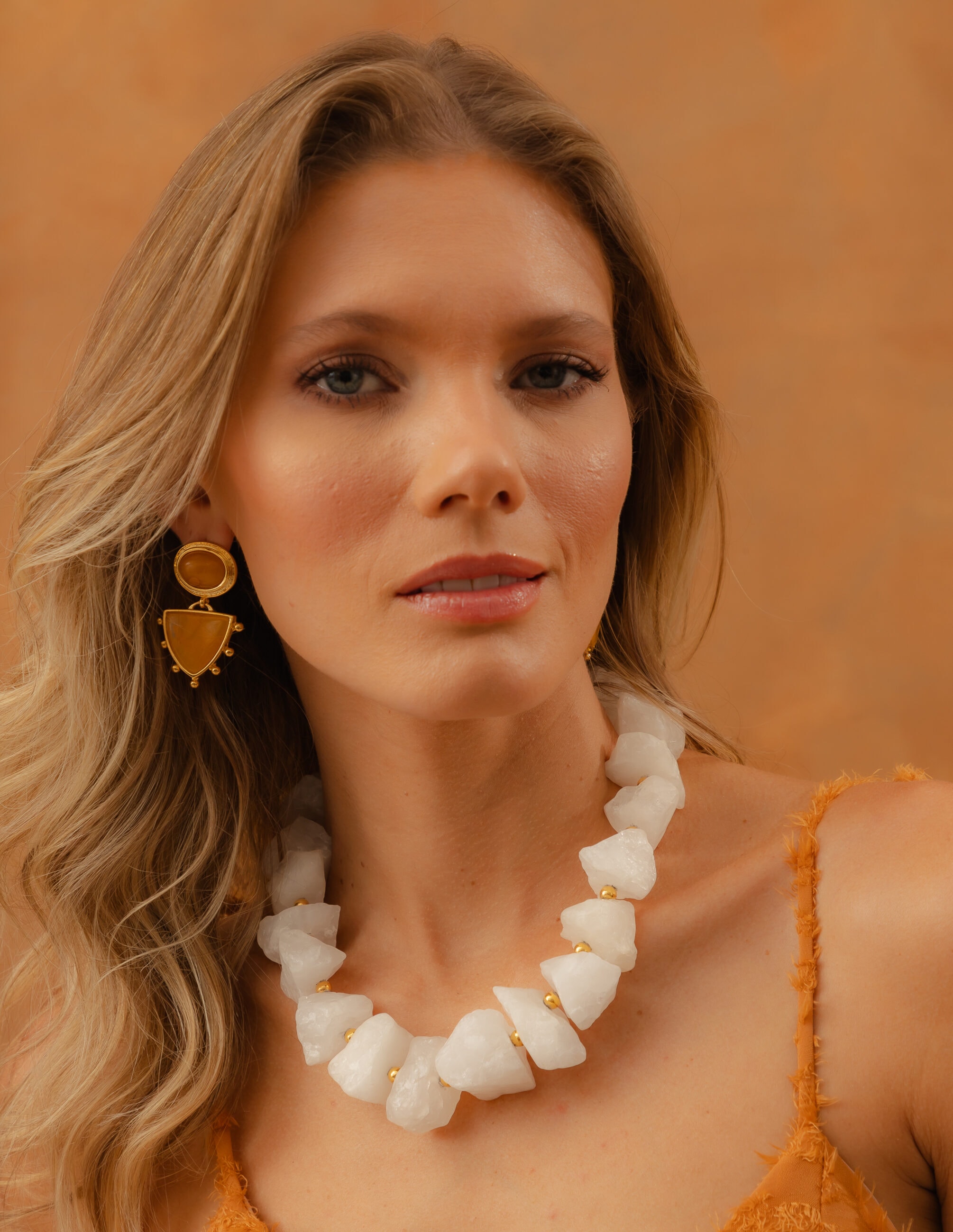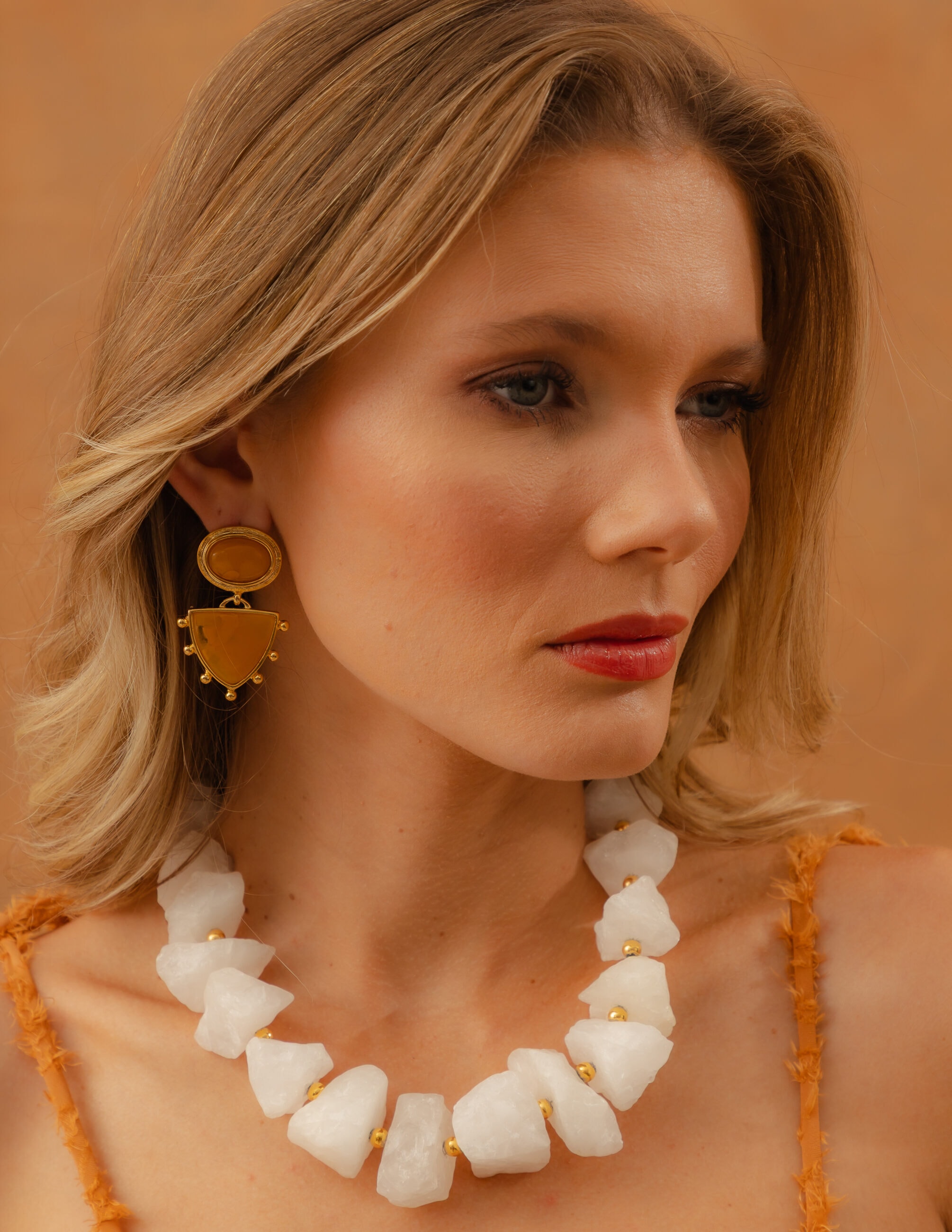 Todos os nossos metais são banhados a ouro, possuem camada protetiva para bijuterias finas e também possuem camada de metal precioso em sua composição. As bijuterias precisam de cuidados, limpe-as com flanela seca e macia, evite contato direto com cosméticos, areia, praia e piscina.
