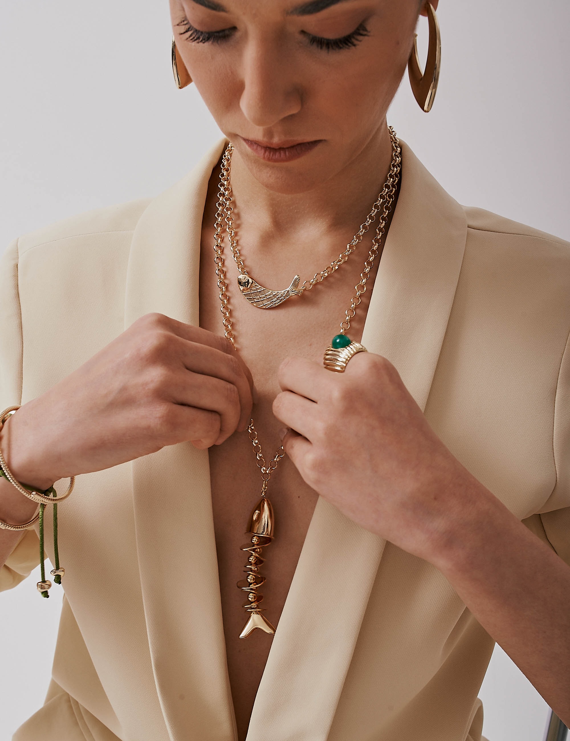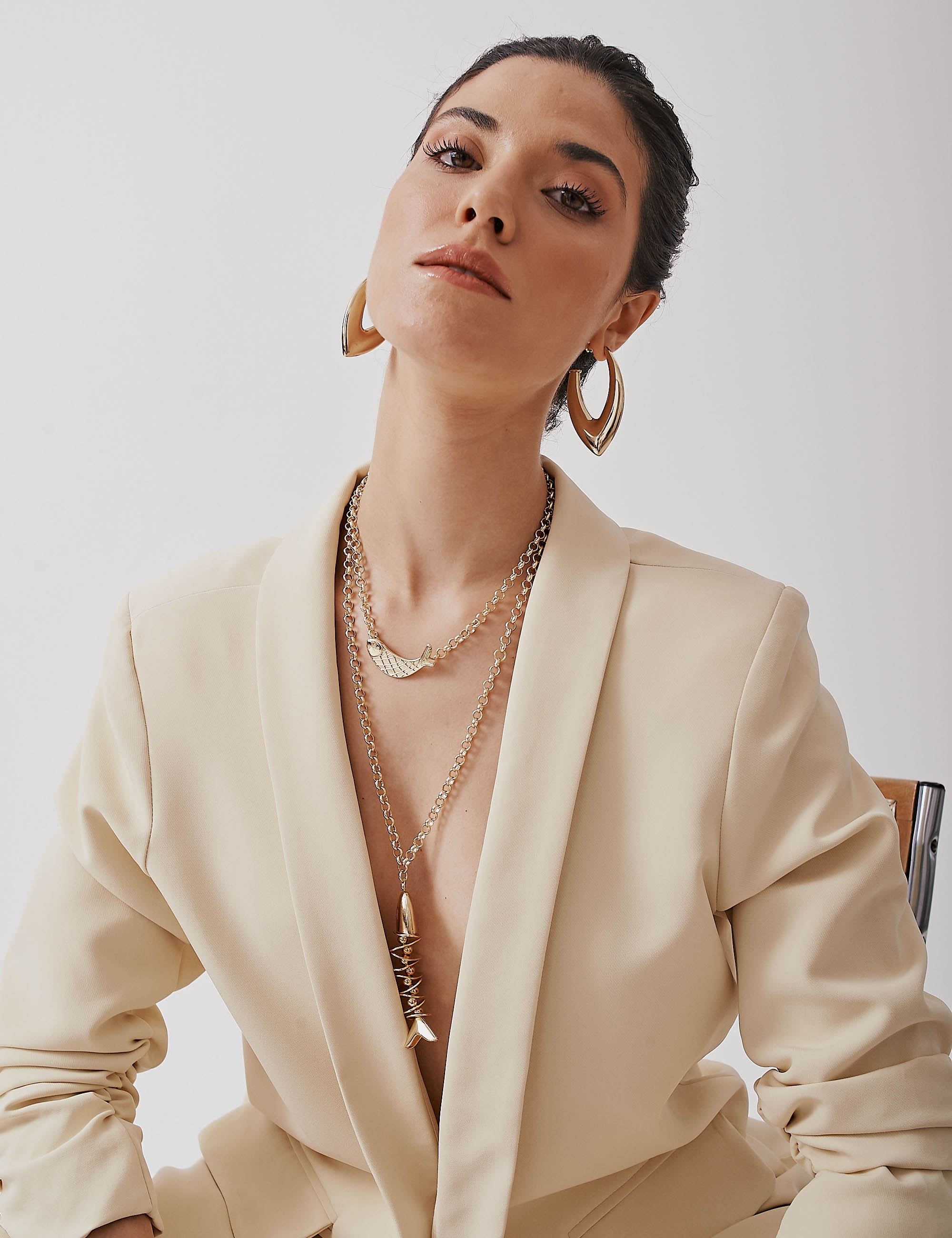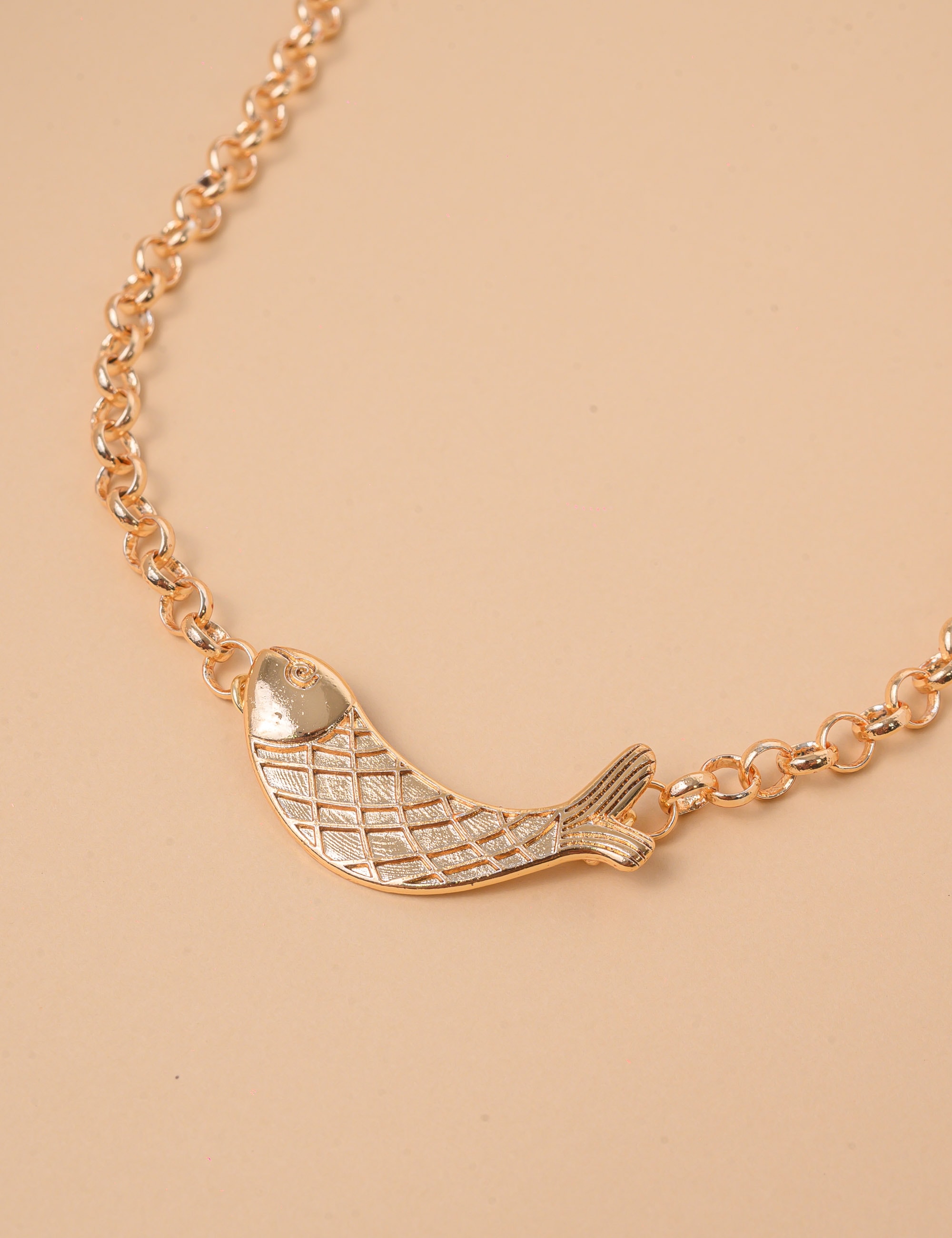 Colar com pingente de peixe e corrente no estilo elo português, banhado em dourado. A corrente com elos arredondados confere um visual clássico e elegante, enquanto o pingente de peixe adiciona um toque simbólico e delicado à peça. Ideal para composições leves ou como destaque em produções mais sofisticadas.