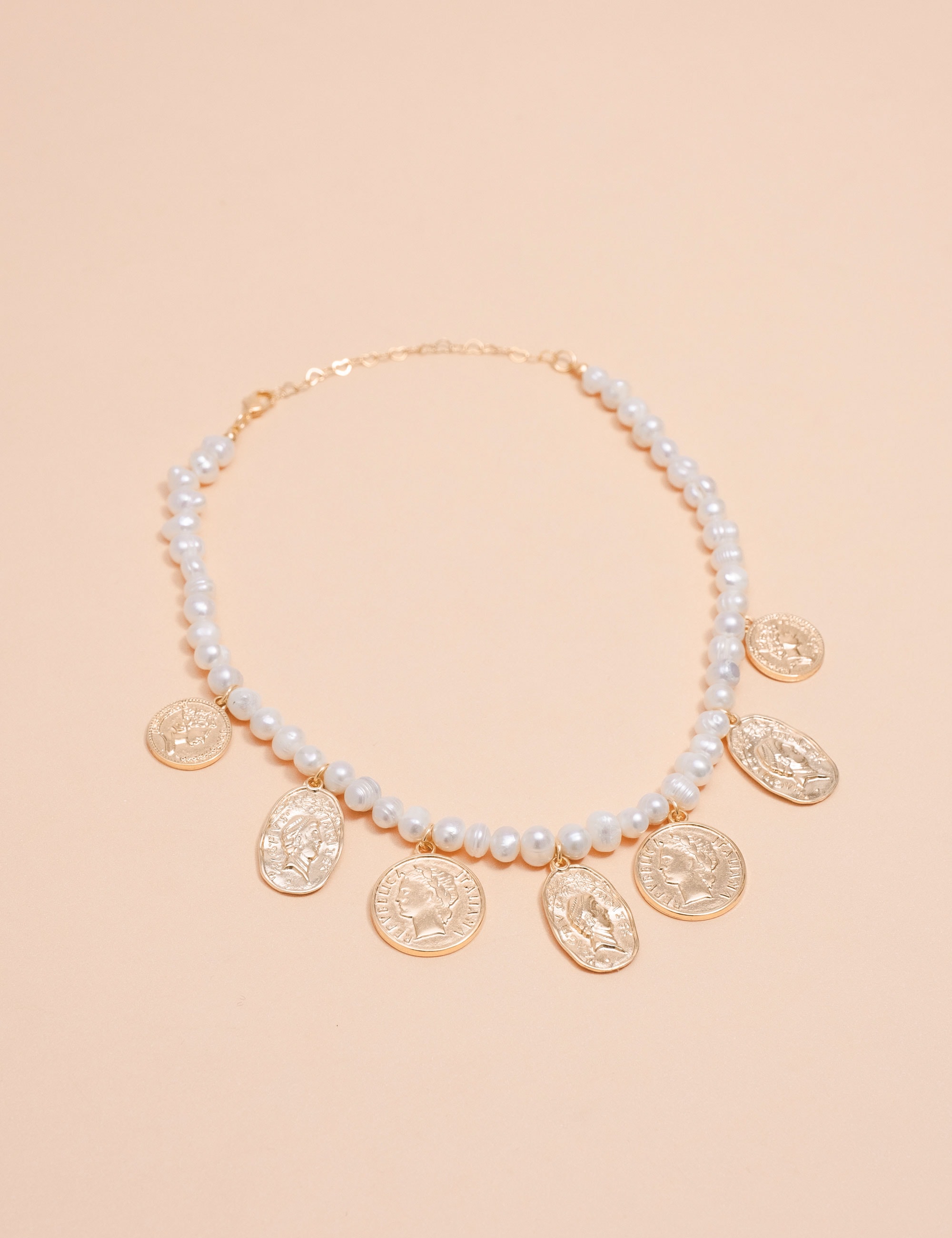 Peça: Colar com pérola resinada e pingente de moedas. Esta peça combina o brilho delicado das pérolas com a atitude sofisticada das moedas, criando um visual elegante e moderno para qualquer ocasião.