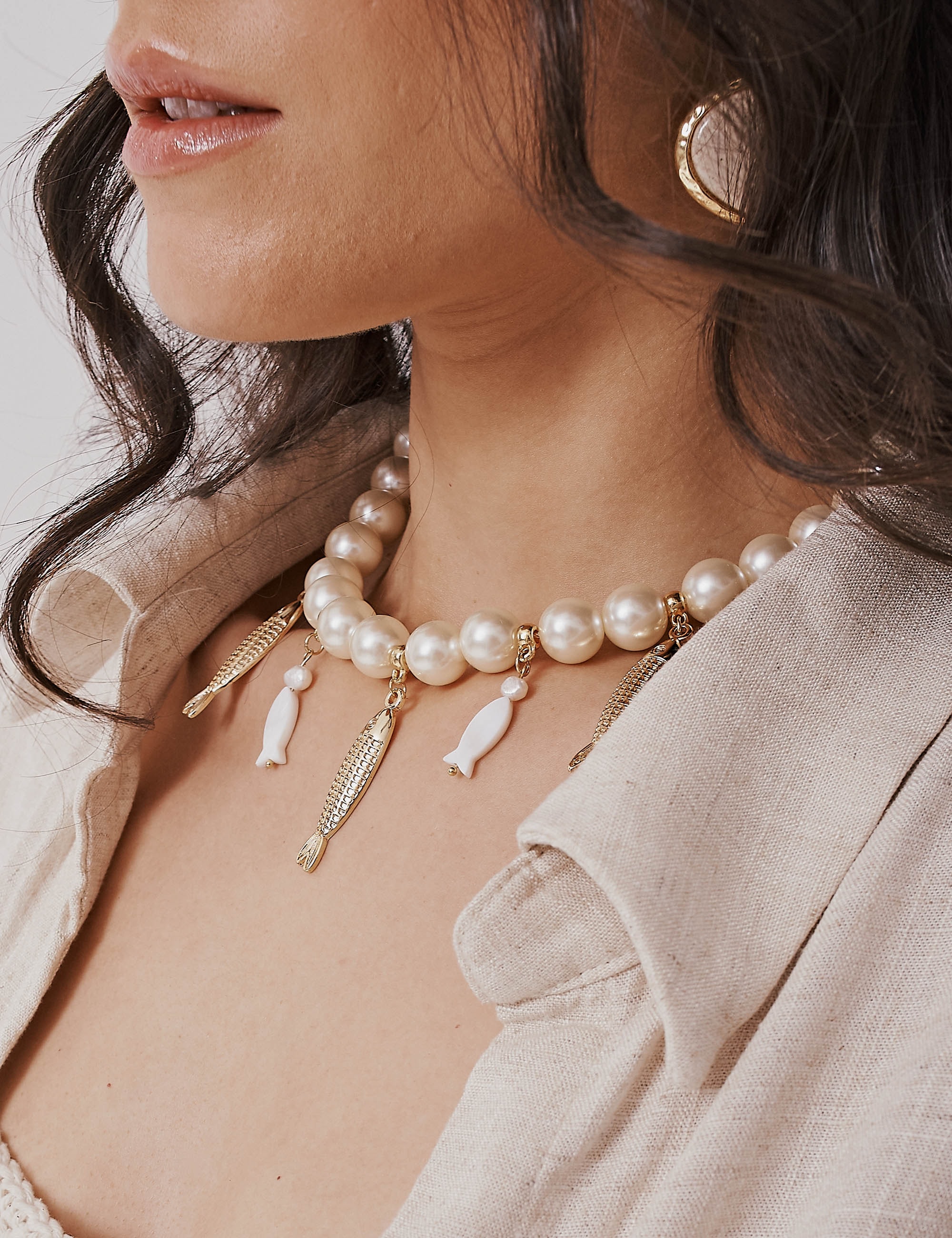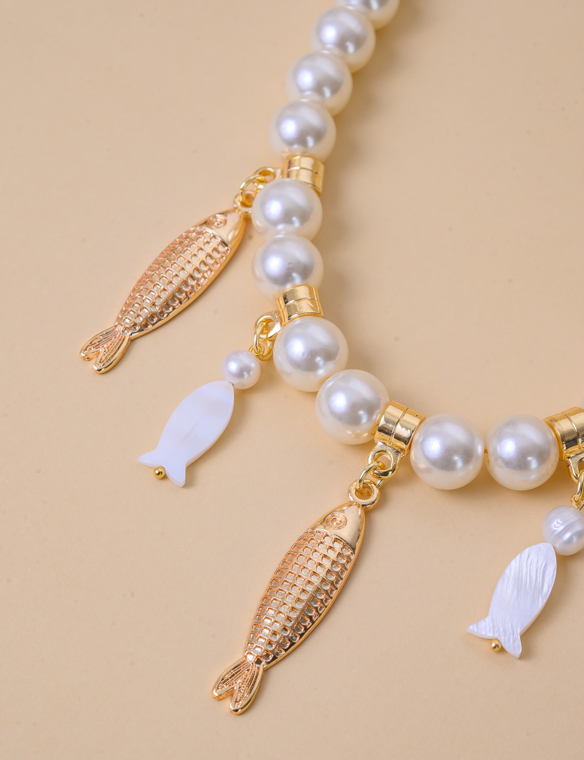 Colar perolado delicado, com pingentes em formato de peixe feitos em madrepérola e detalhes em banho de ouro. Uma peça charmosa e simbólica, que une leveza, brilho natural e um toque sofisticado. Ideal para compor looks elegantes com um ar místico e atemporal.