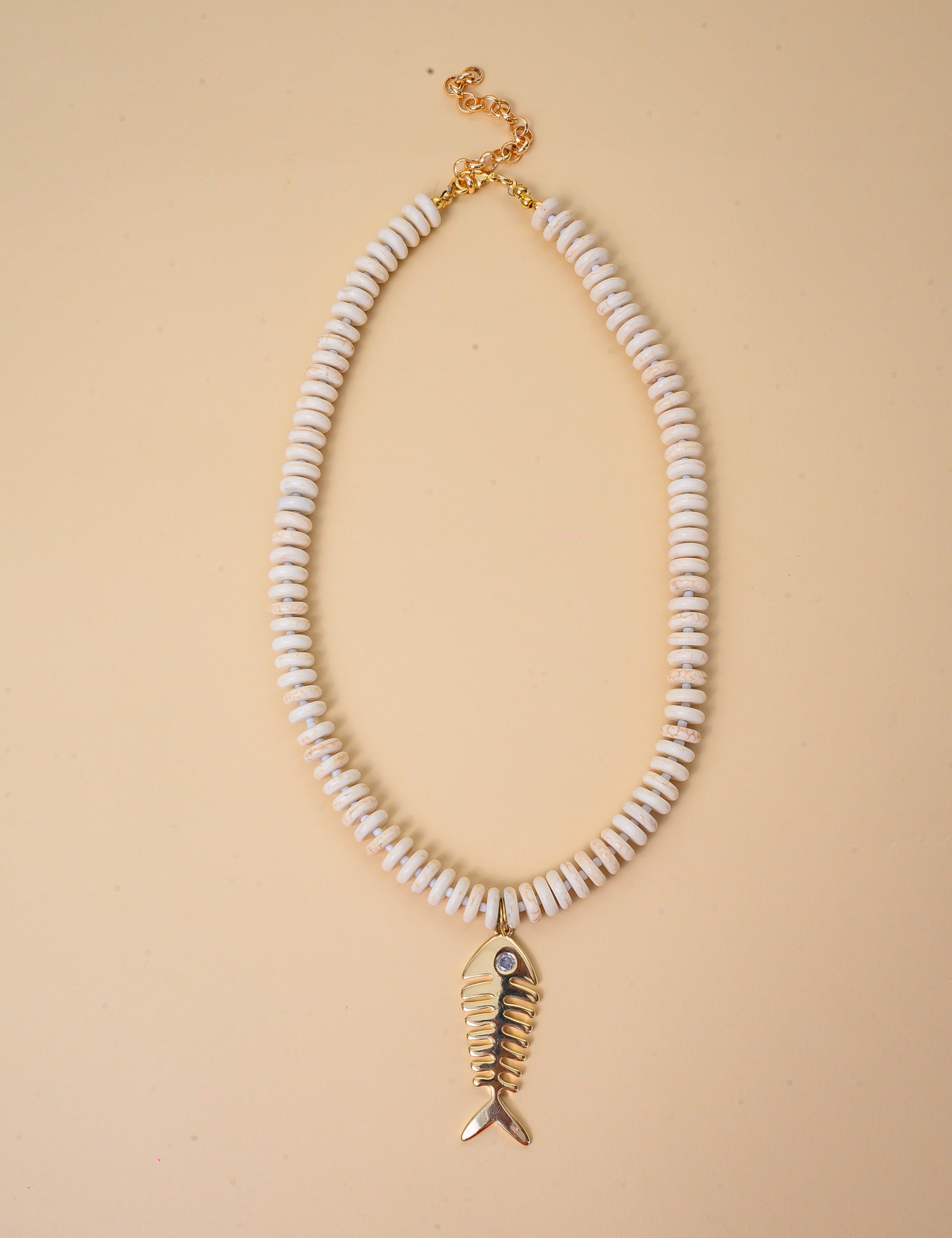 Colar com contas em tom off white e pingente dourado em formato de espinha de peixe, trazendo um toque moderno e descontraído ao visual. O detalhe em pedra cristal adiciona brilho sutil, equilibrando elegância e leveza. Uma peça perfeita para composições praianas ou looks com personalidade e estilo.