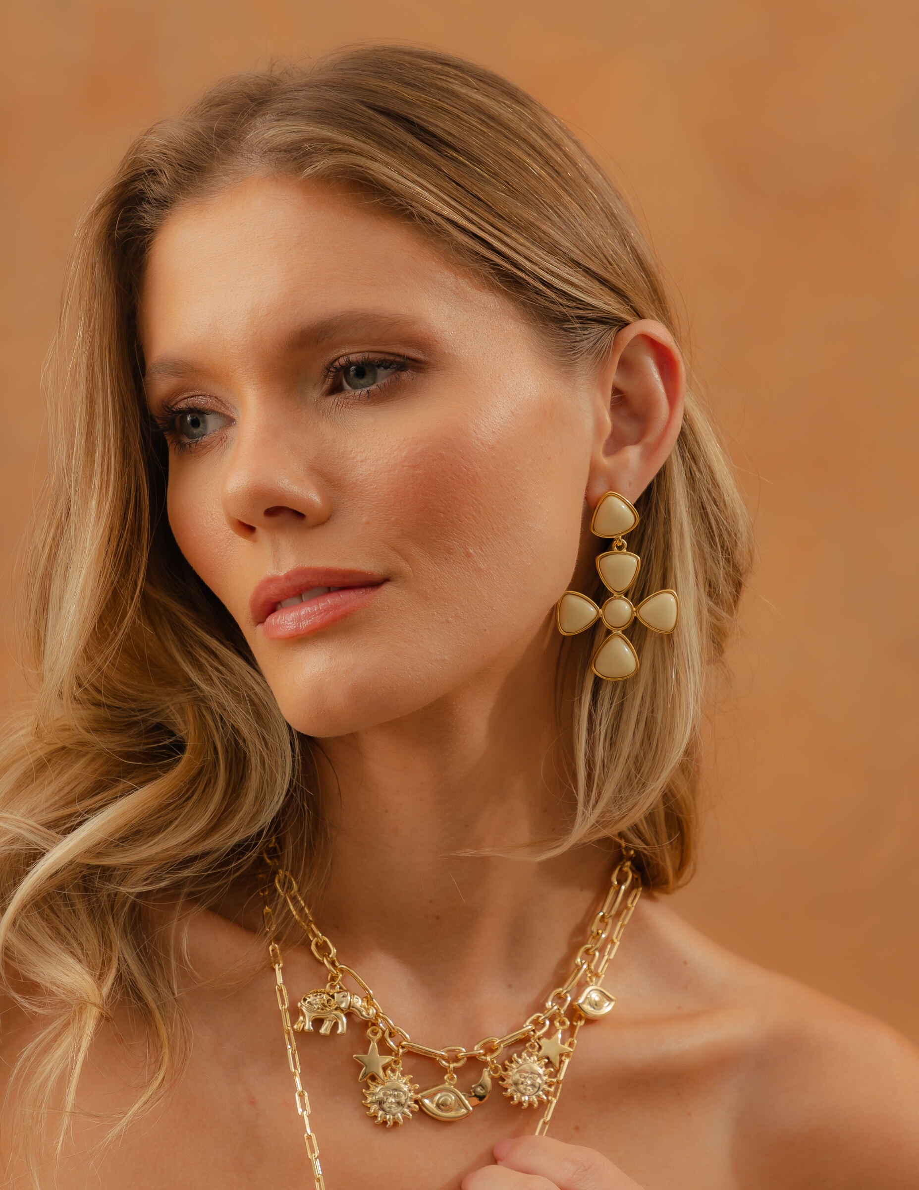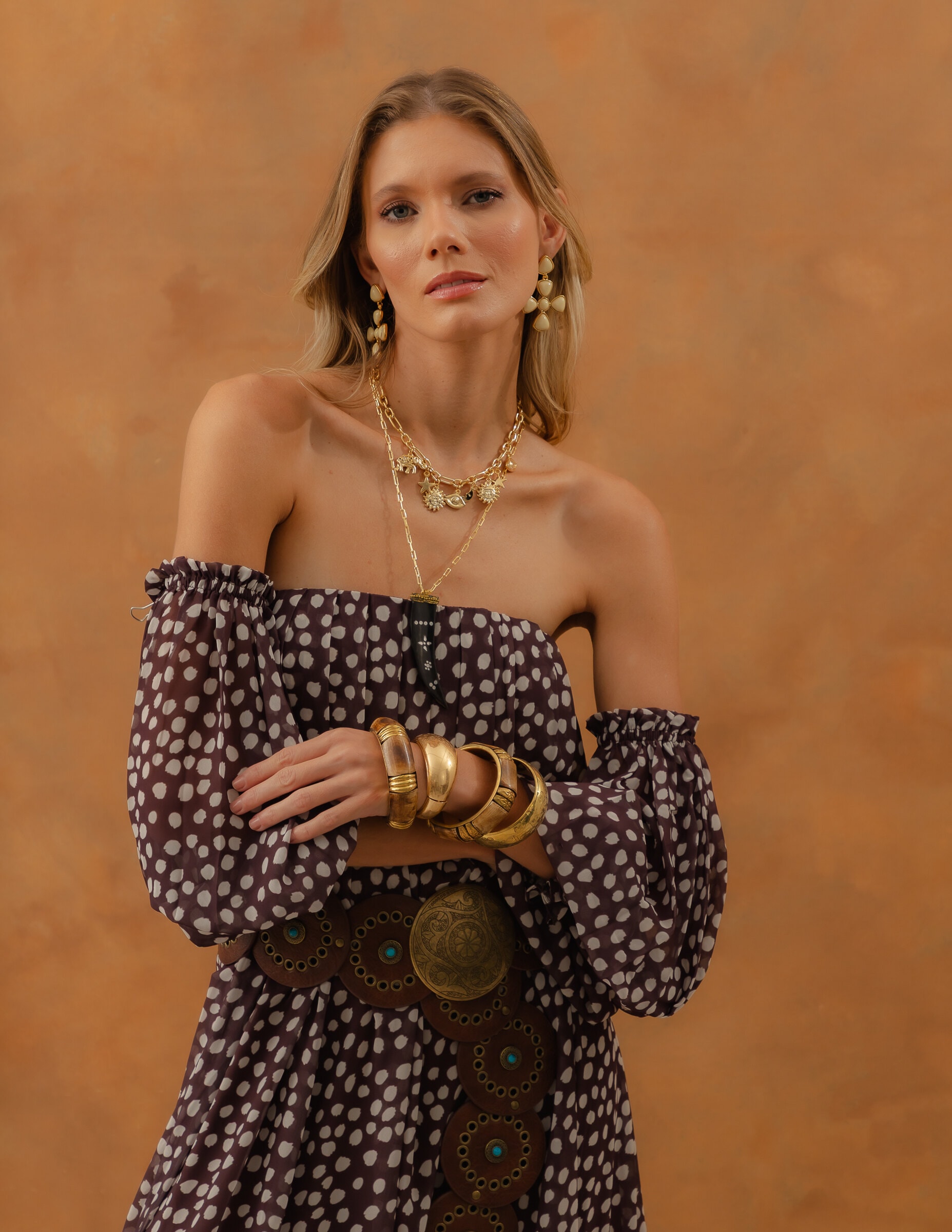 Todos os nossos metais são banhados a ouro, possuem camada protetiva para bijuterias finas e também possuem camada de metal precioso em sua composição. As bijuterias precisam de cuidados, limpe-as com flanela seca e macia, evite contato direto com cosméticos, areia, praia e piscina.