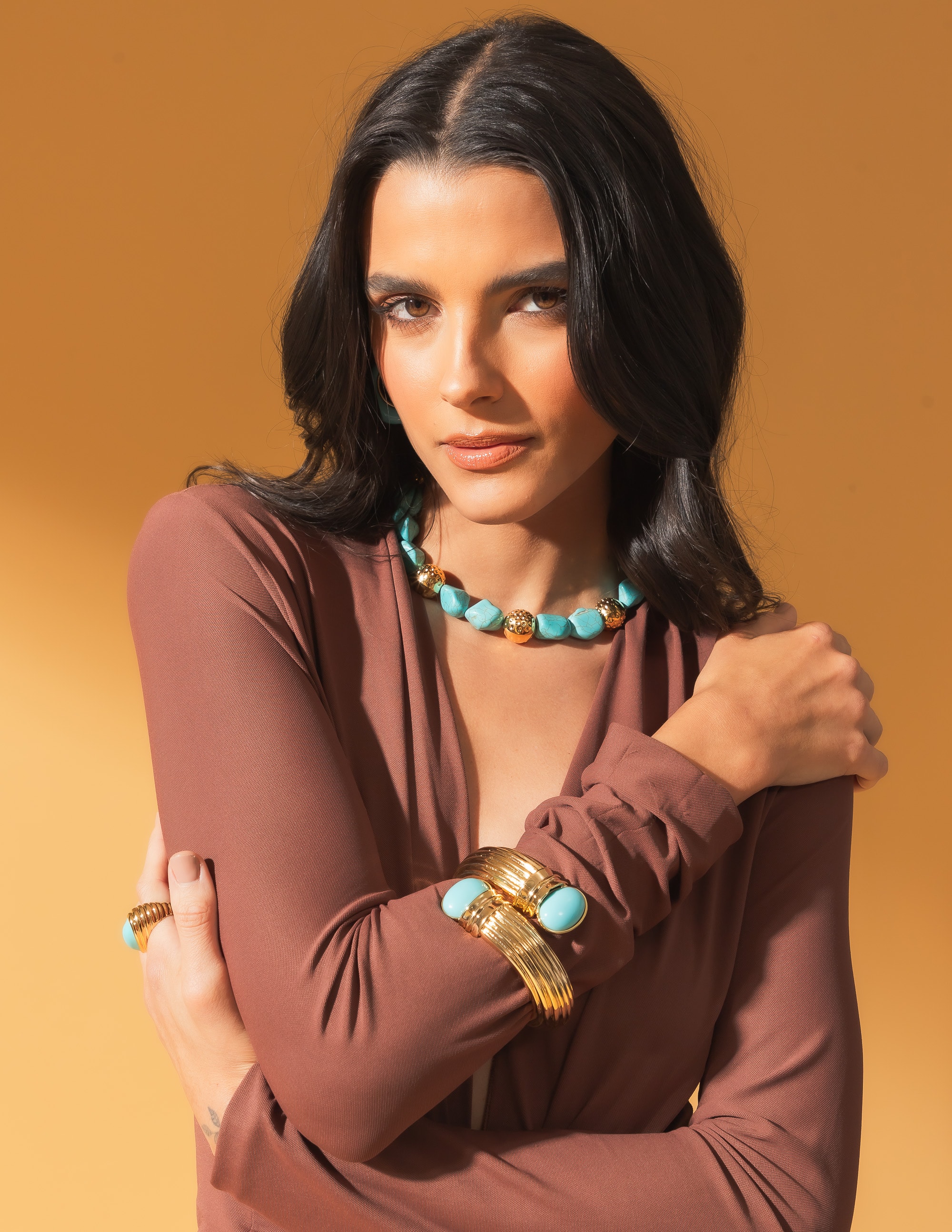 Todos os nossos metais são banhados a ouro, possuem camada protetiva para bijuterias finas e também possuem camada de metal precioso em sua composição. As bijuterias precisam de cuidados, limpe-as com flanela seca e macia, evite contato direto com cosméticos, areia, praia e piscina.