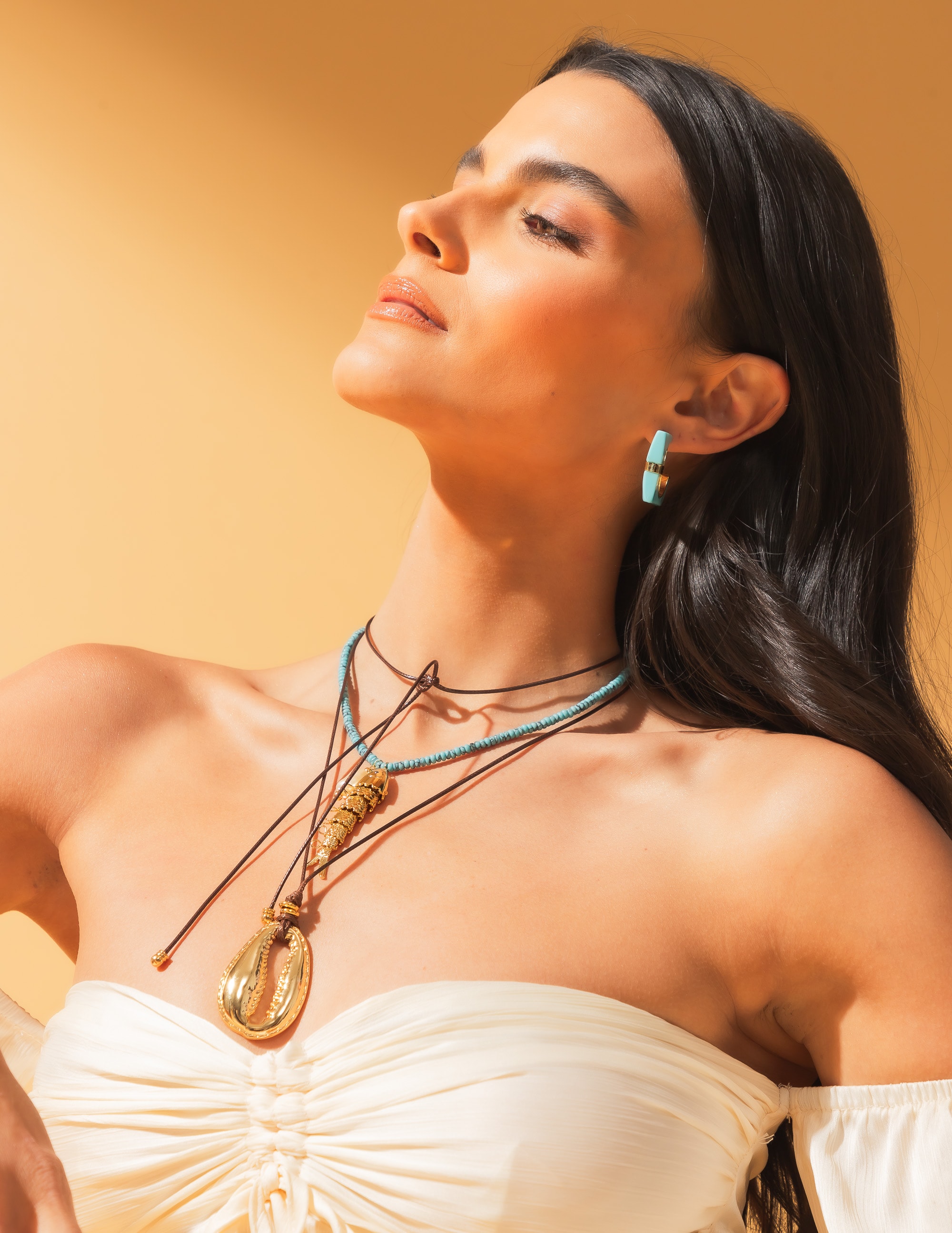 Todos os nossos metais são banhados a ouro, possuem camada protetiva para bijuterias finas e também possuem camada de metal precioso em sua composição. As bijuterias precisam de cuidados, limpe-as com flanela seca e macia, evite contato direto com cosméticos, areia, praia e piscina.