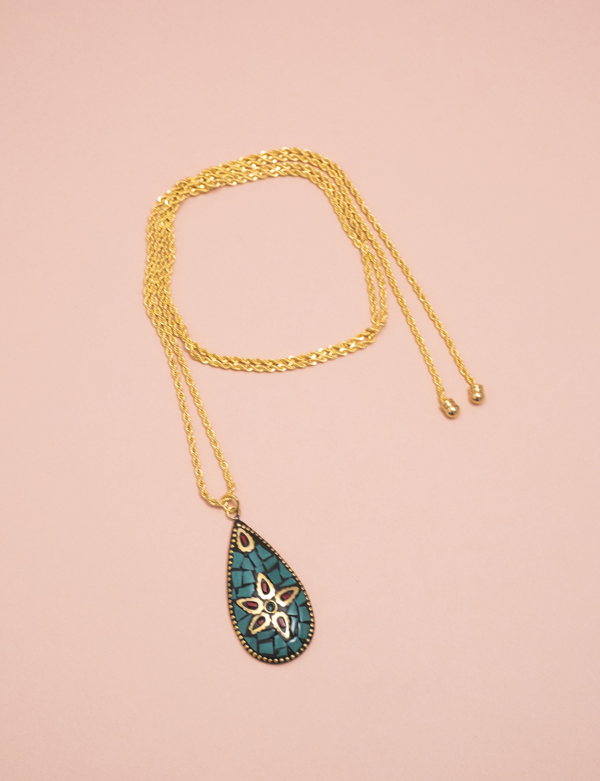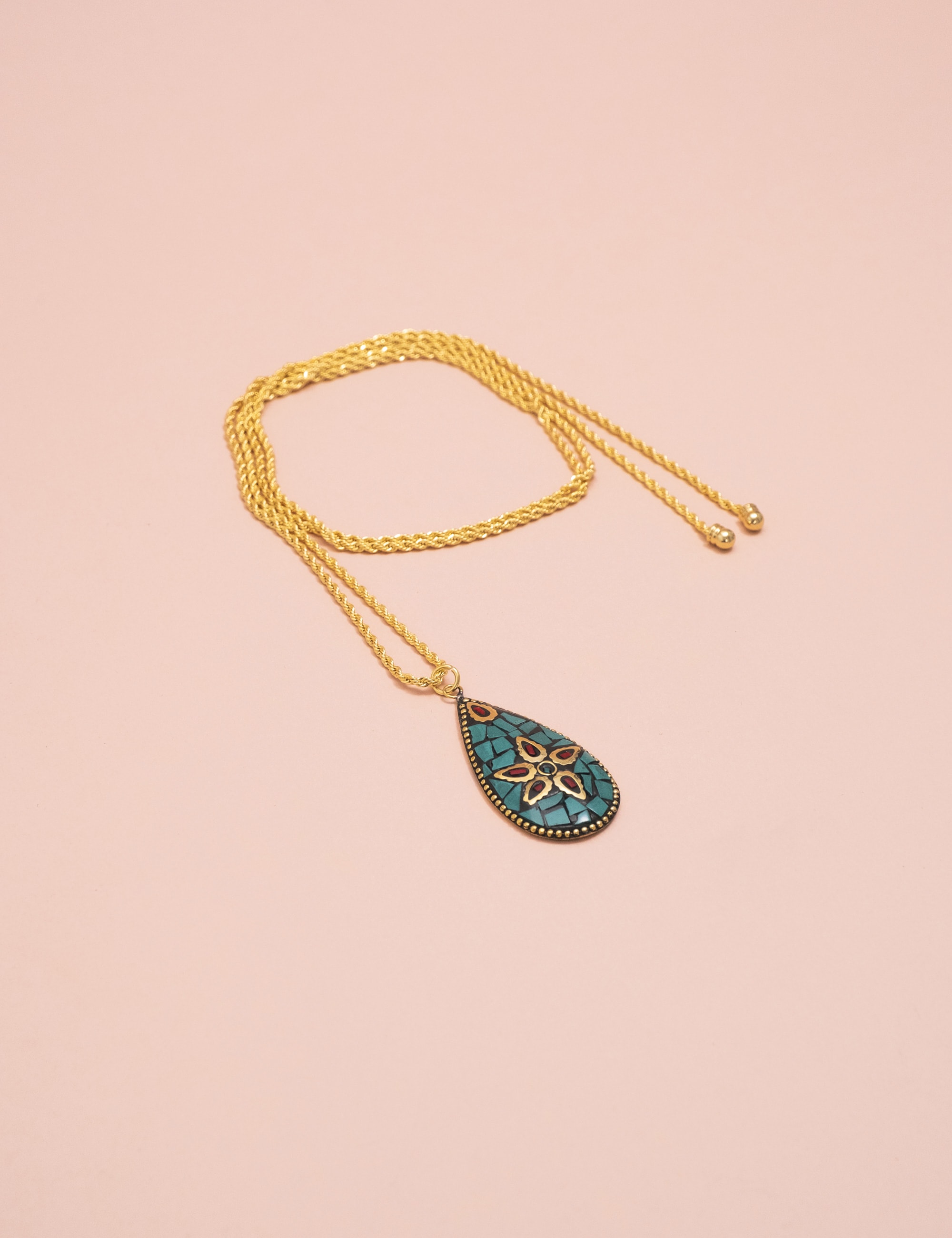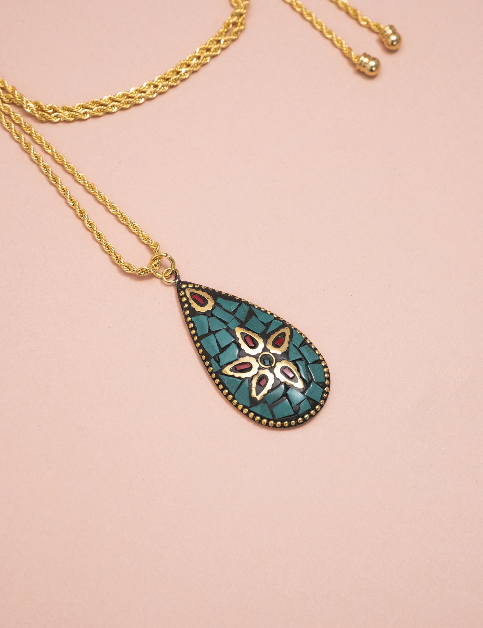 Pingente tibetano com detalhes em moisaco de pedra natural, malaquita e howlita e banho ouro vintage.