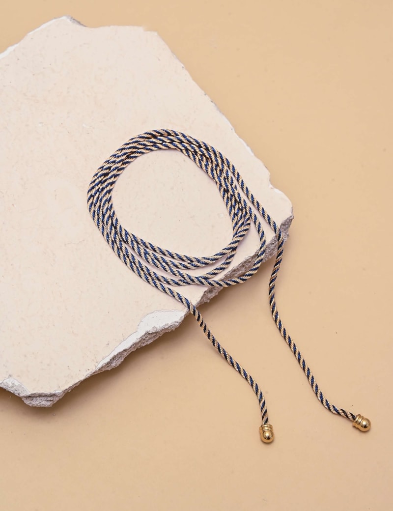 Cordão marroquino azul escuro, com trama marcante e brilho sofisticado, perfeito para destacar qualquer look com elegância. Uma peça versátil, moderna e cheia de presença para o dia a dia ou ocasiões especiais.