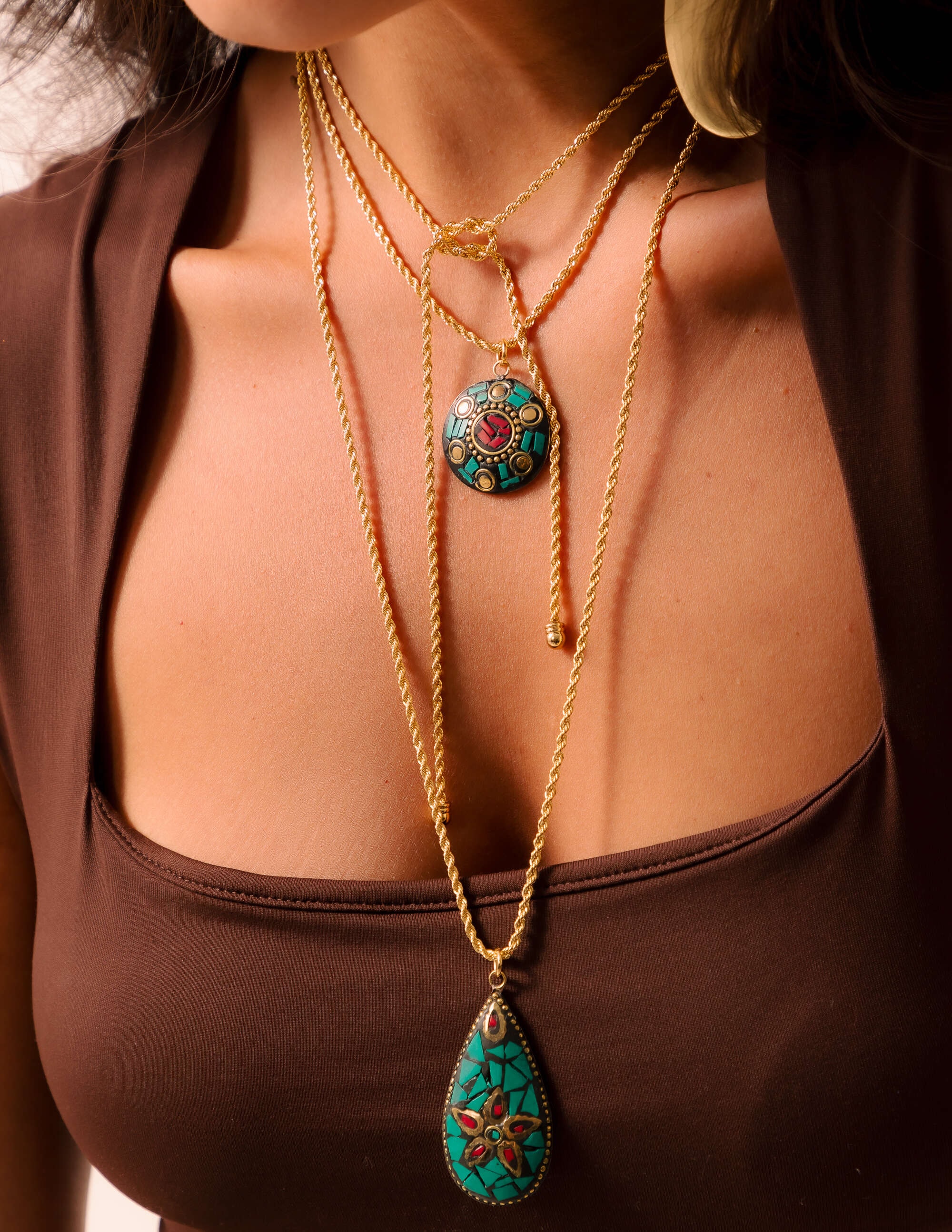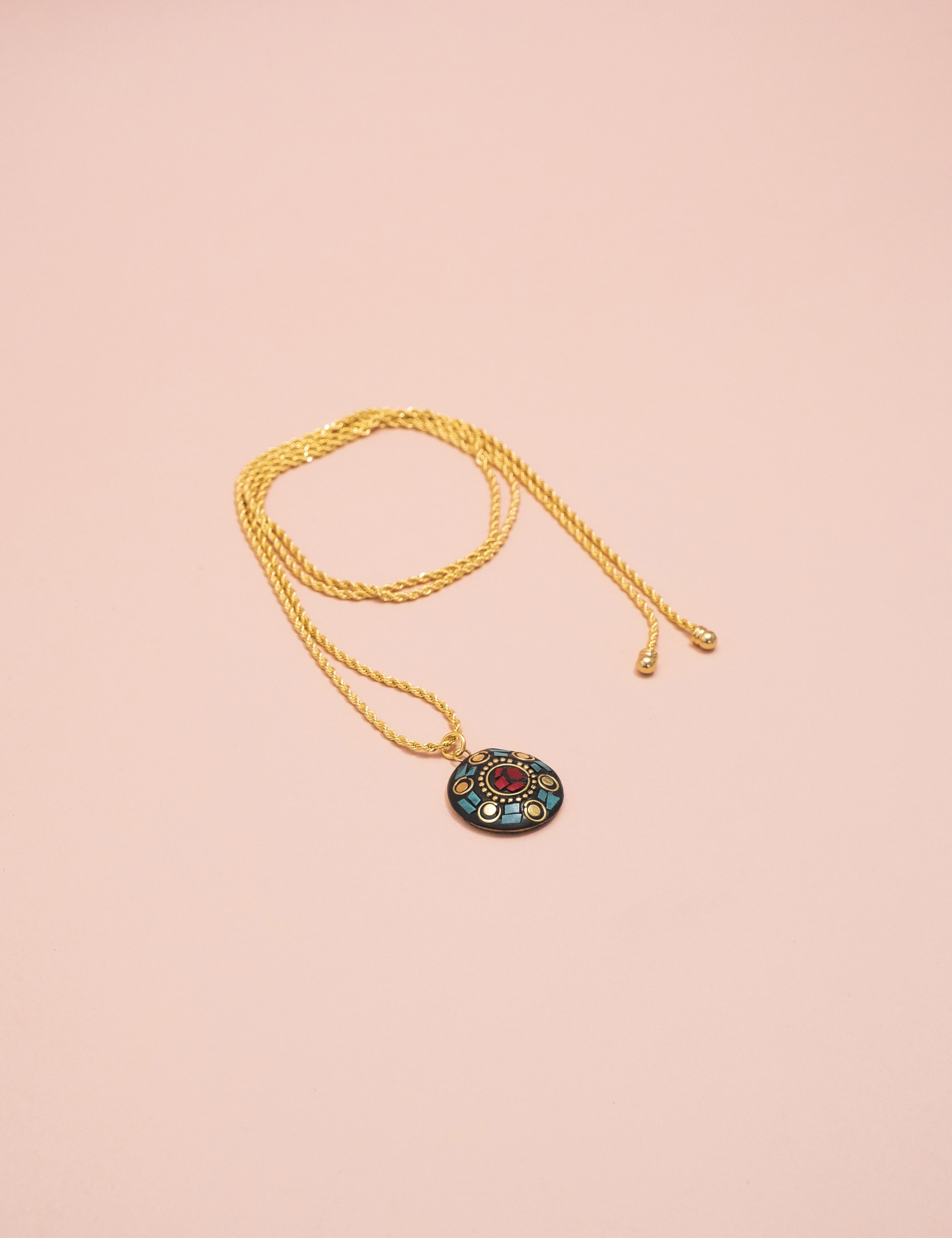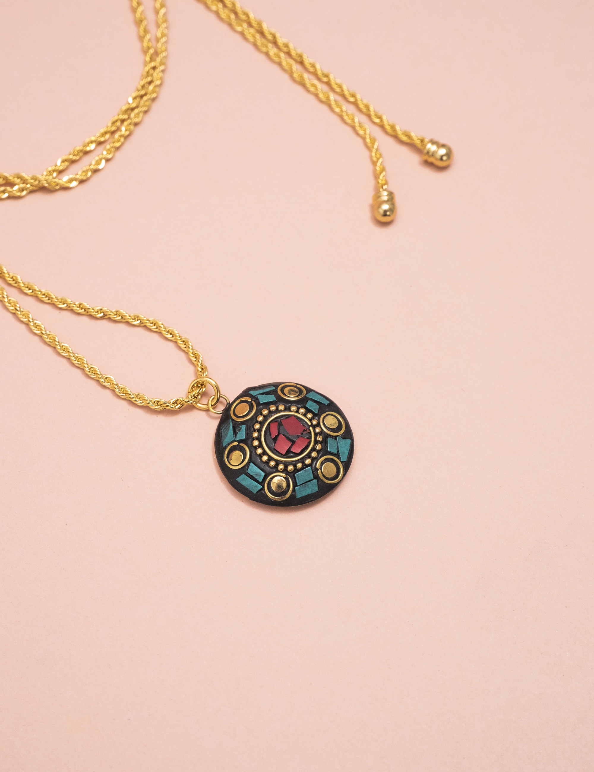 Pingente tibetano com detalhes em moisaco de pedra natural, malaquita e howlita e banho ouro vintage.