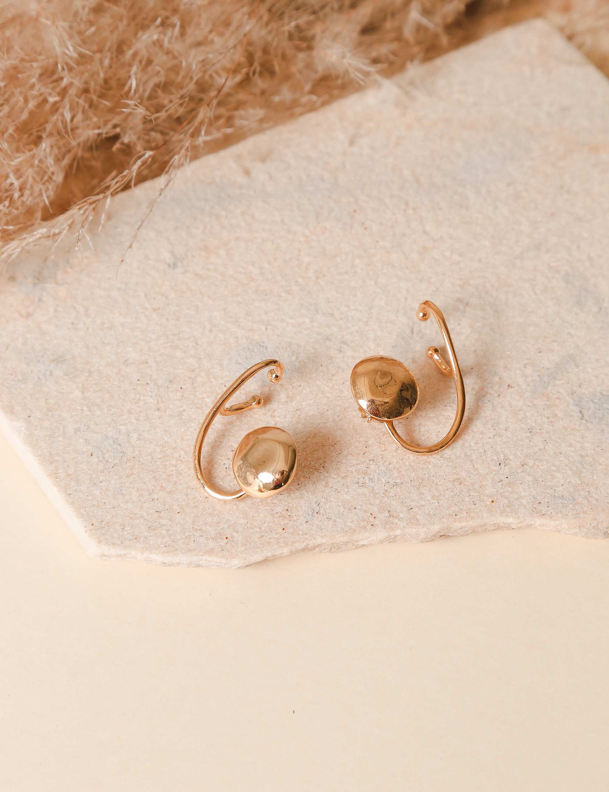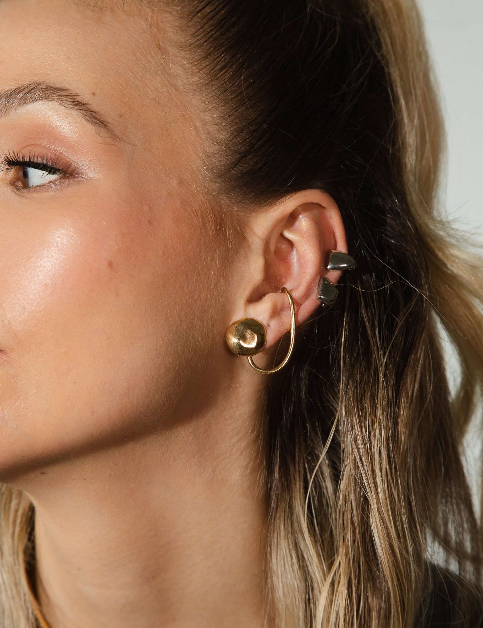 Brinco de encaixe com formato de esfera achatado e fio de encaixe. Peça de latão, banhado no ouro, verniz e antialérgico. Os brincos cada vez mais bem ganhando espaço e destaque no mundo dos acessórios, cada vez mais estilosos e imponentes para traduzir o lado imponente que a mulher traz em sua feminilidade.