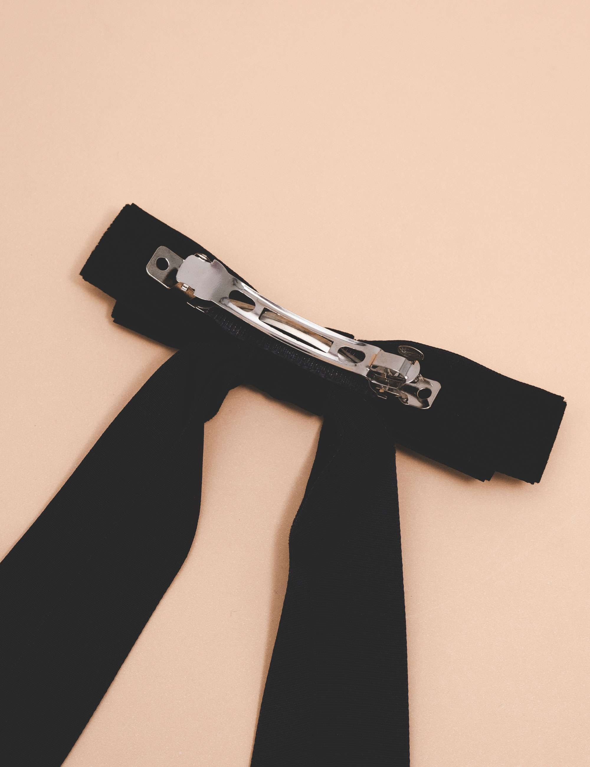 Peça: Um laço preto de veludo, adornado com uma presilha elegante e detalhes sofisticados, perfeito para realçar qualquer penteado com estilo e charme irresistível.