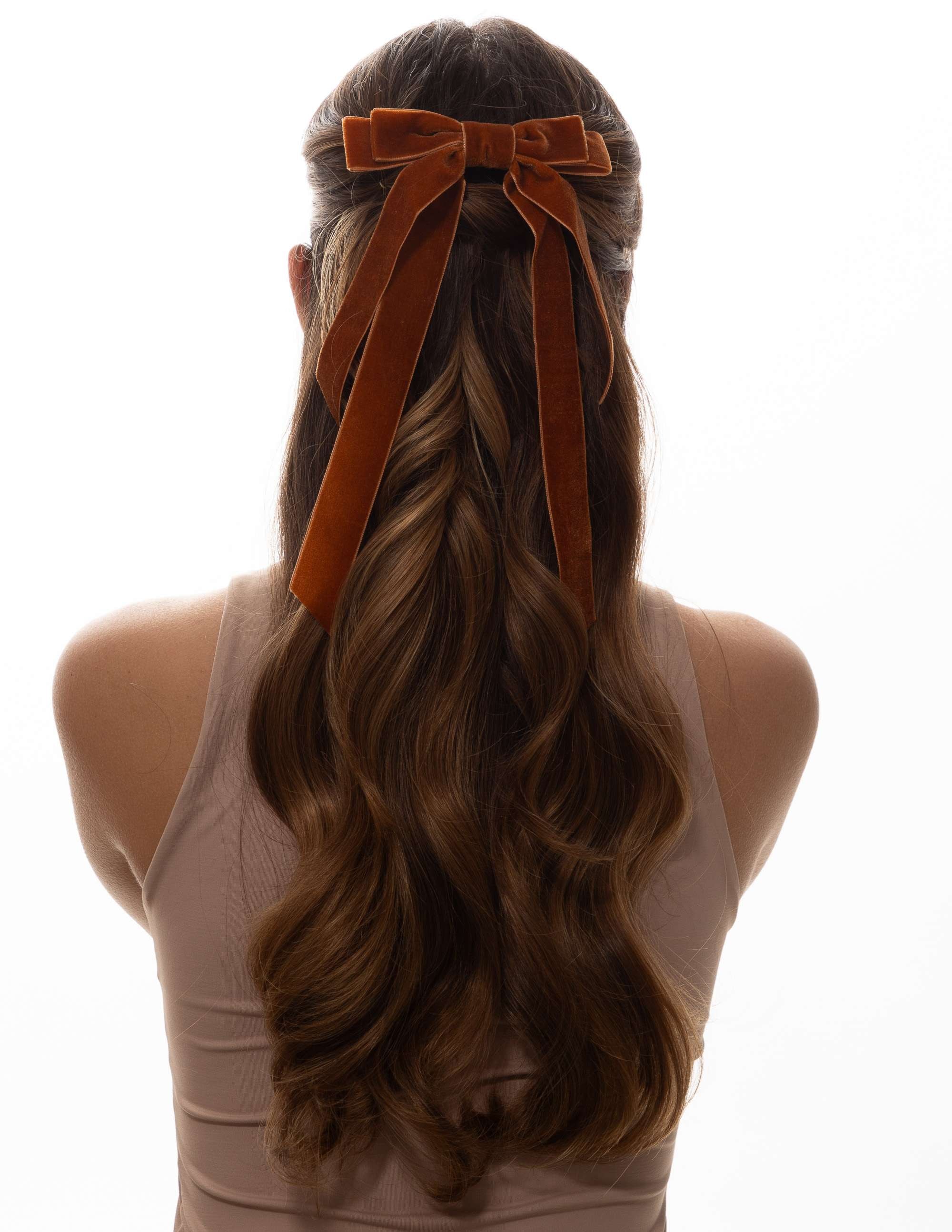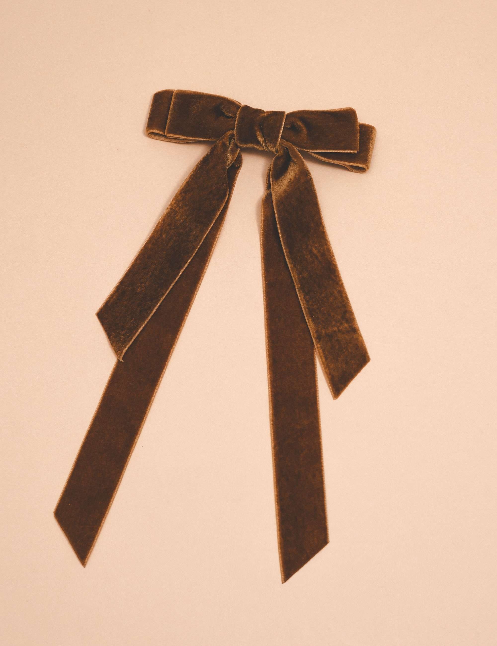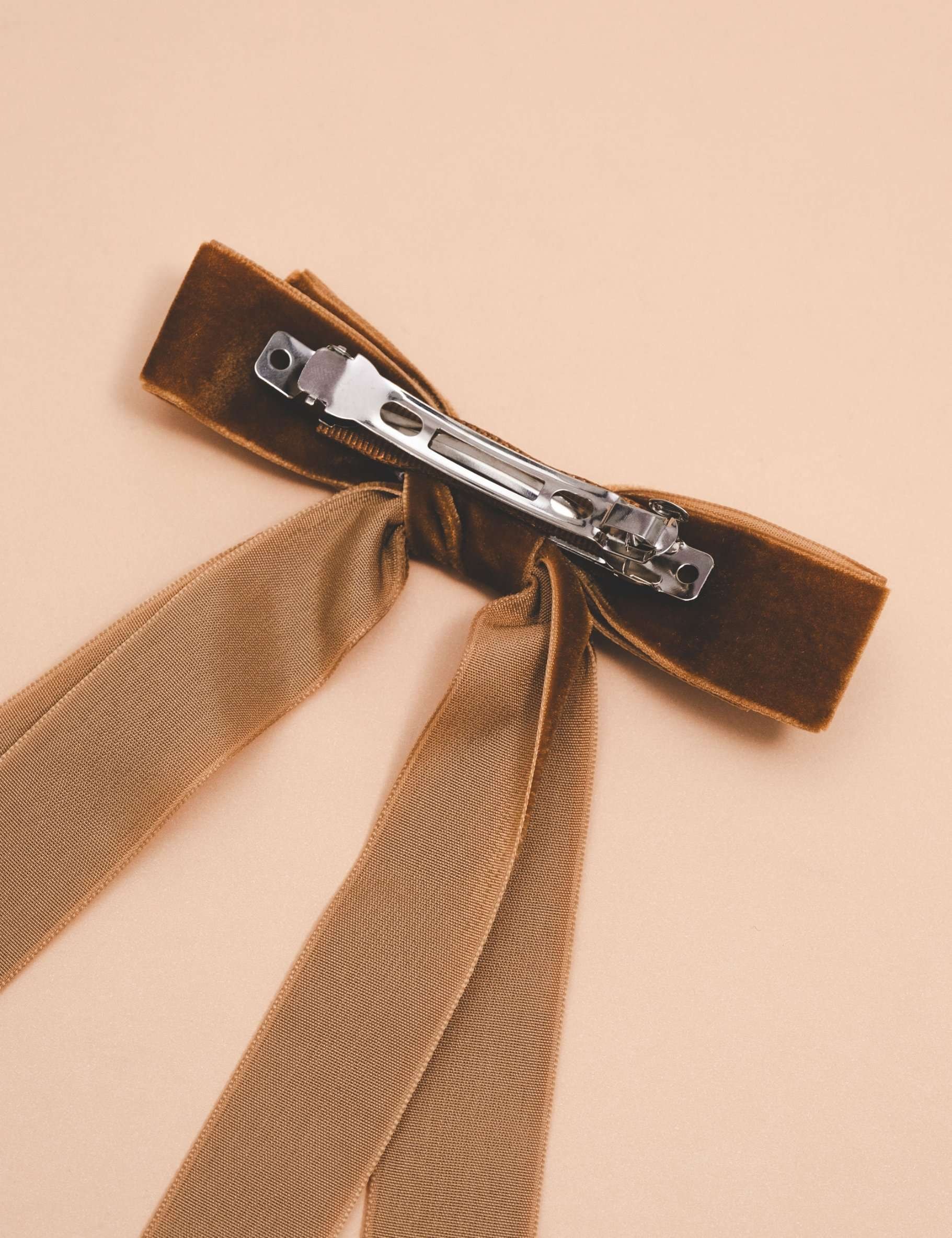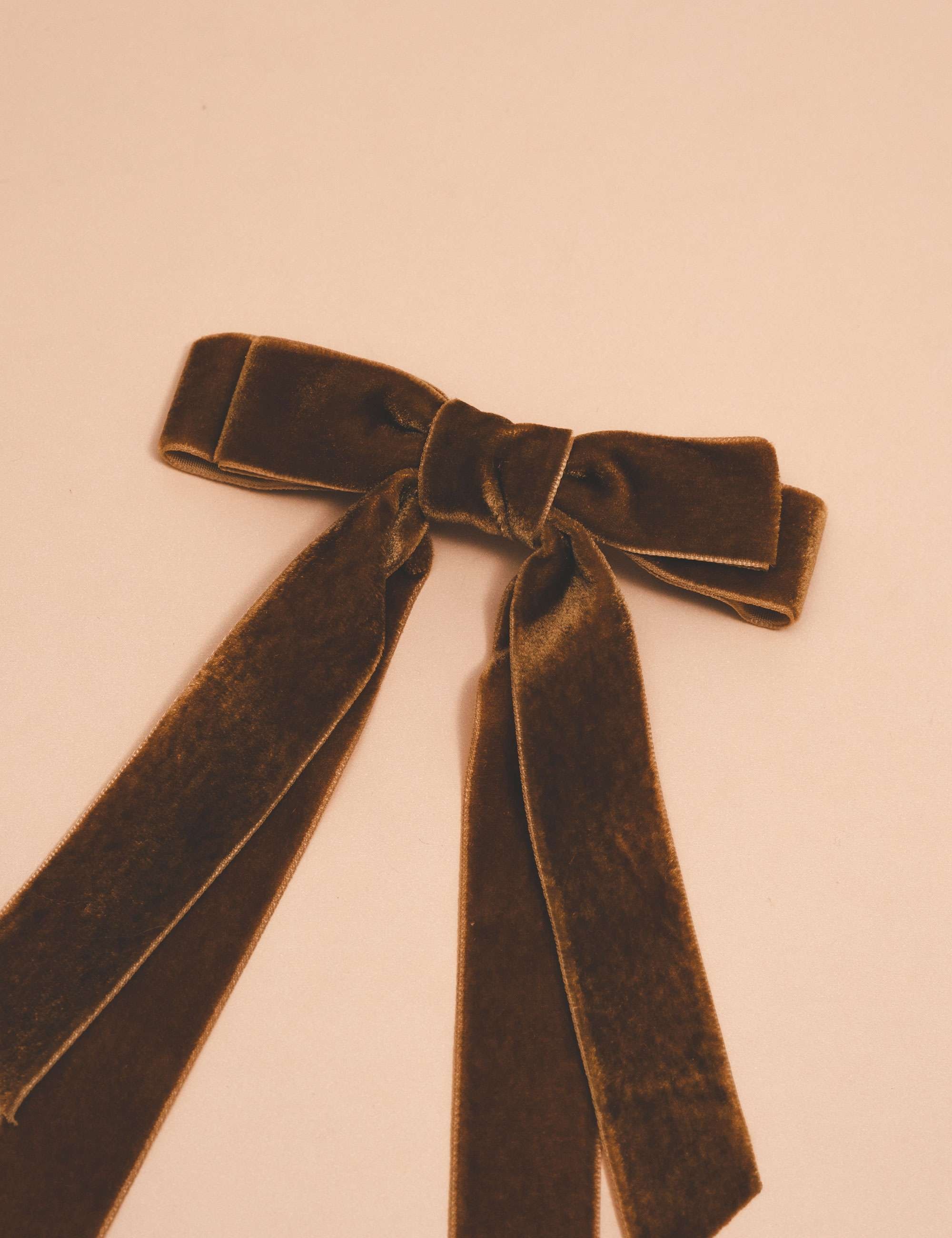Peça: Um laço marrom de veludo, adornado com uma presilha elegante e detalhes sofisticados, perfeito para realçar qualquer penteado com estilo e charme irresistível.