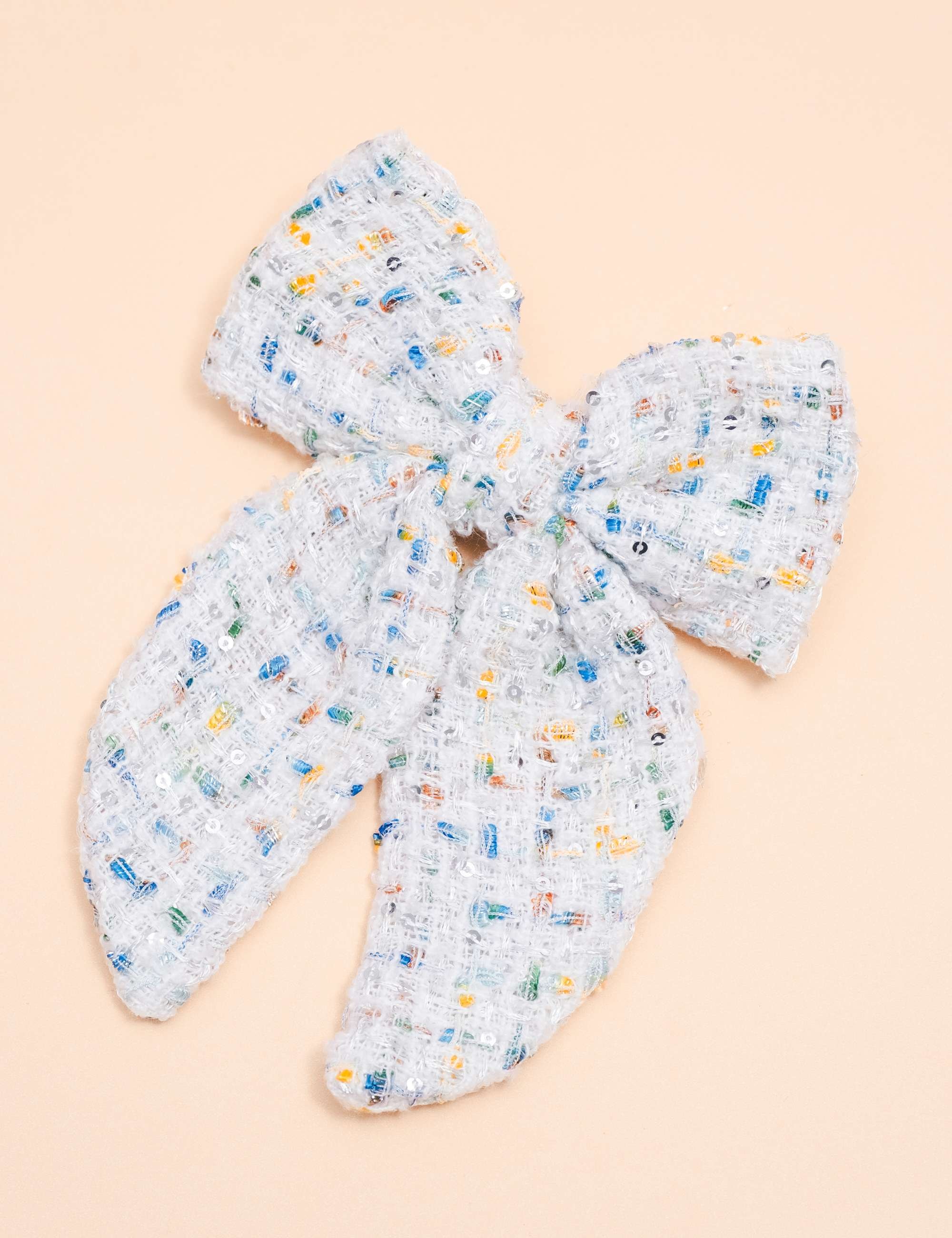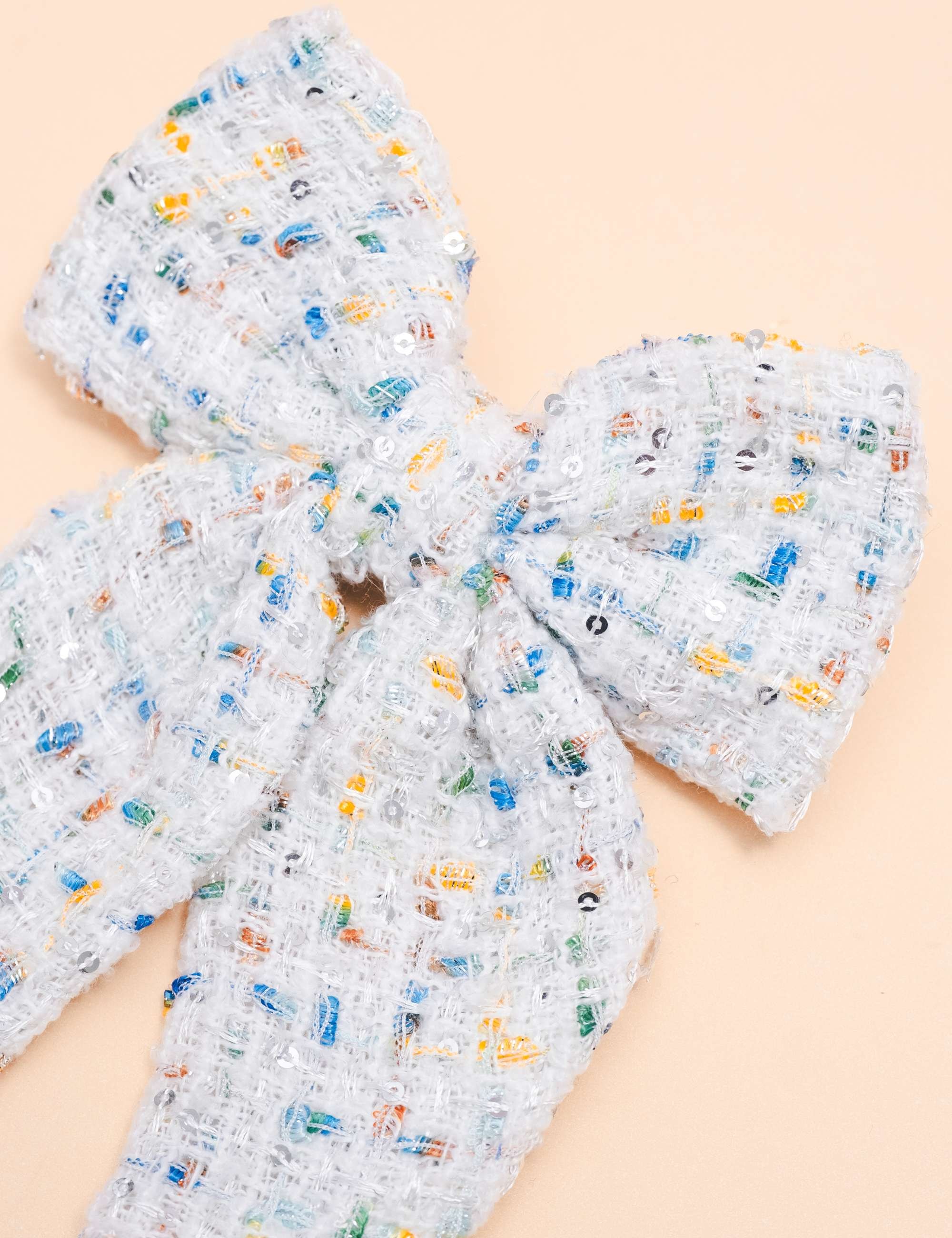 Peça: Presilha tweed, com formato de laço e base off com detalhes coloridos.