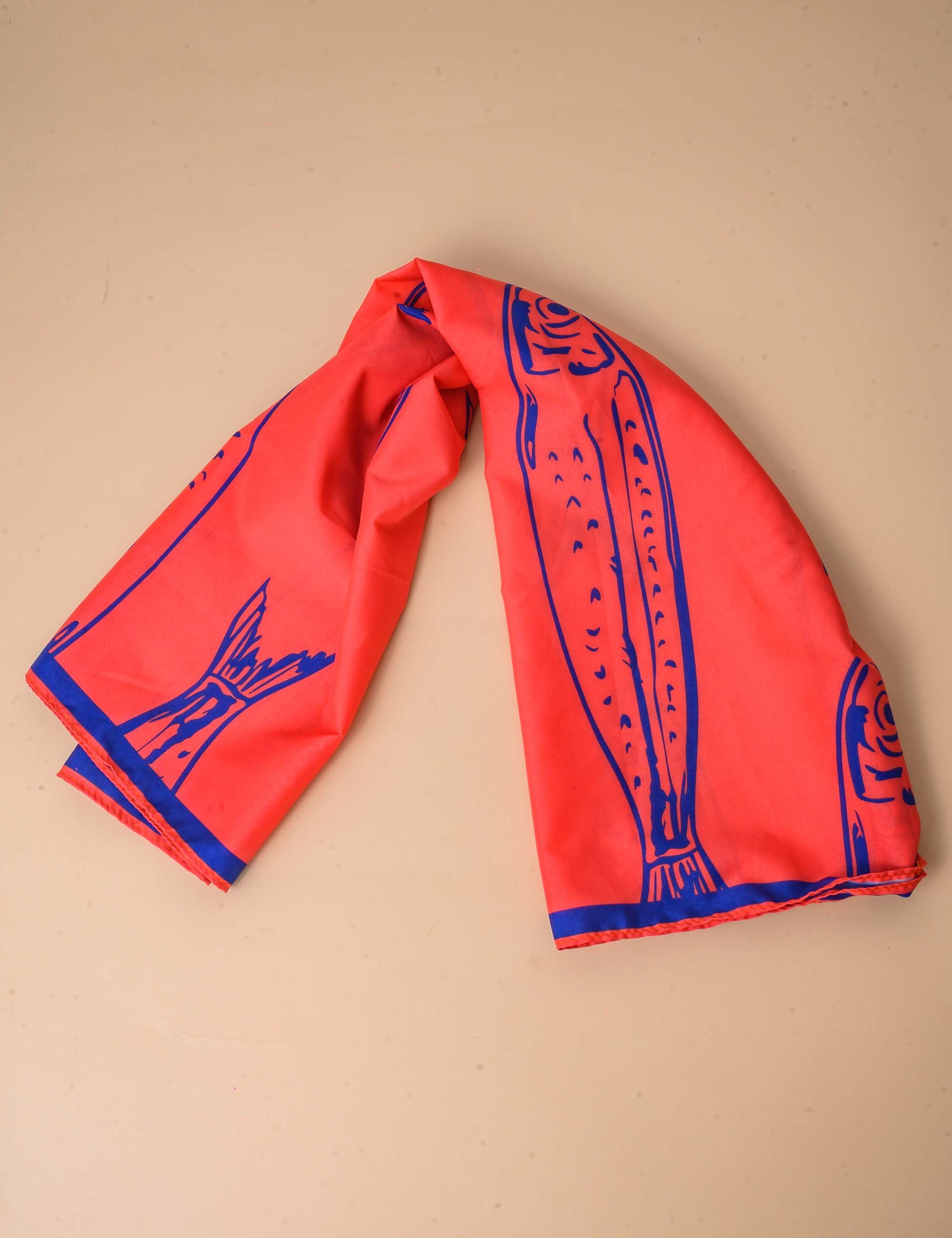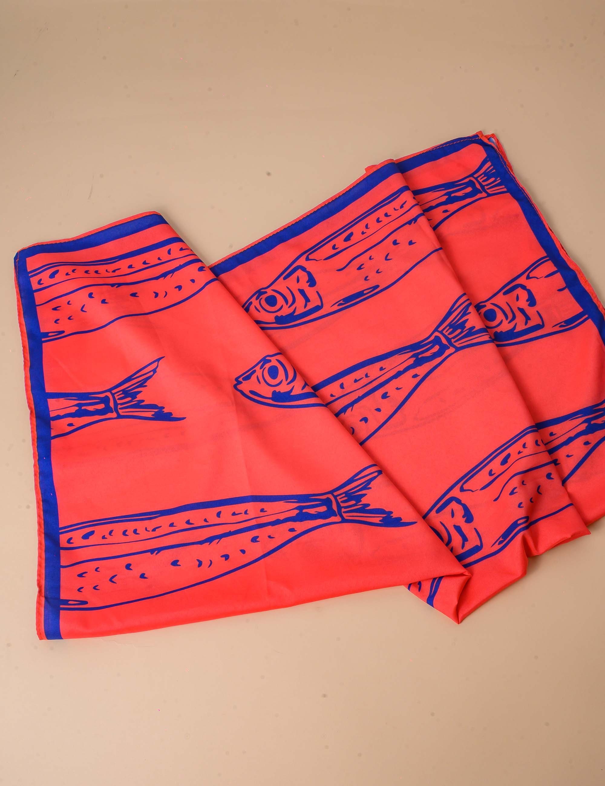 Com design autêntico e cores marcantes, este lenço traz uma estampa de peixes em azul sobre fundo laranja avermelhado vibrante. Produzido em tecido leve e macio, é um acessório versátil que pode ser usado de diferentes formas — no pescoço, cabelo, bolsa ou como detalhe em looks criativos. Uma peça moderna que une estilo e descontração.