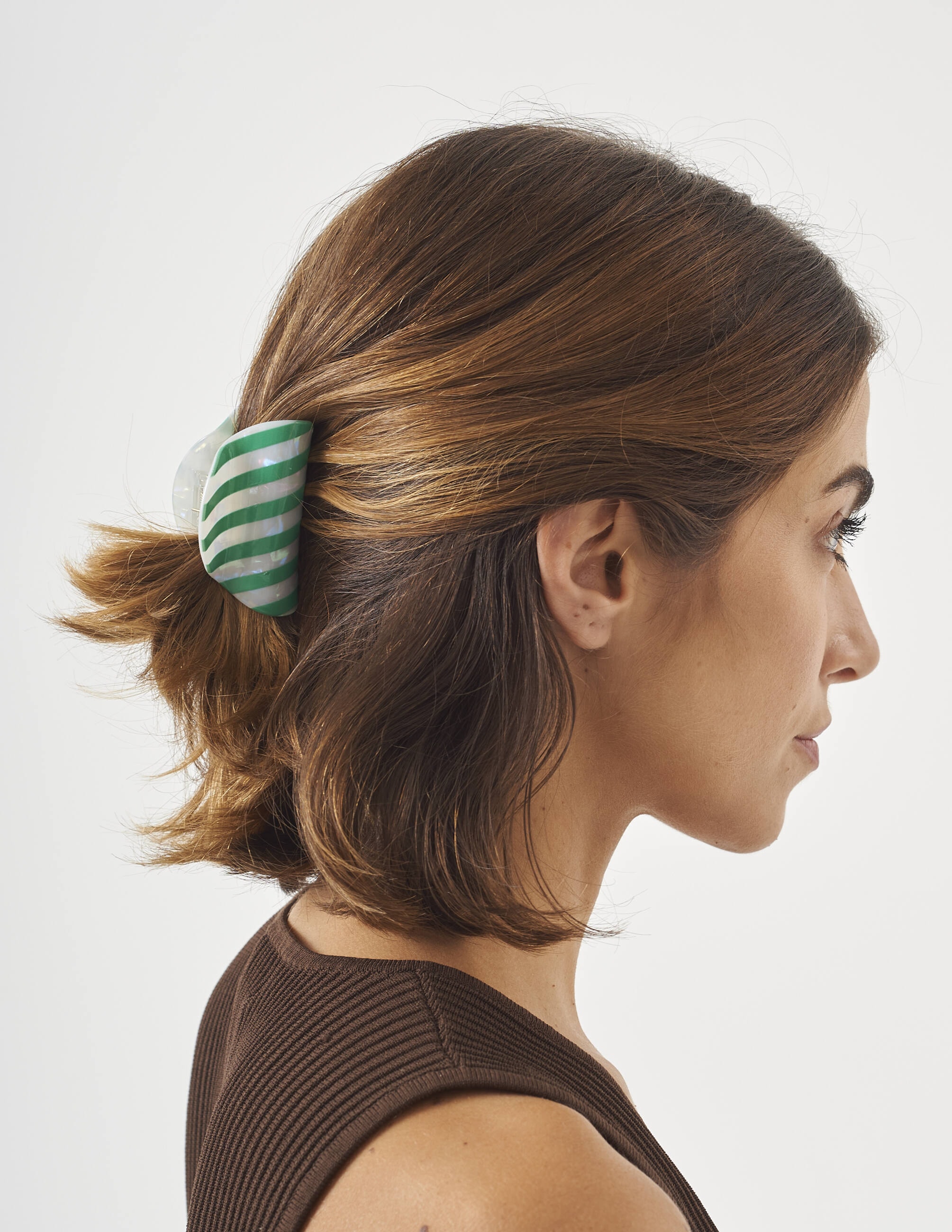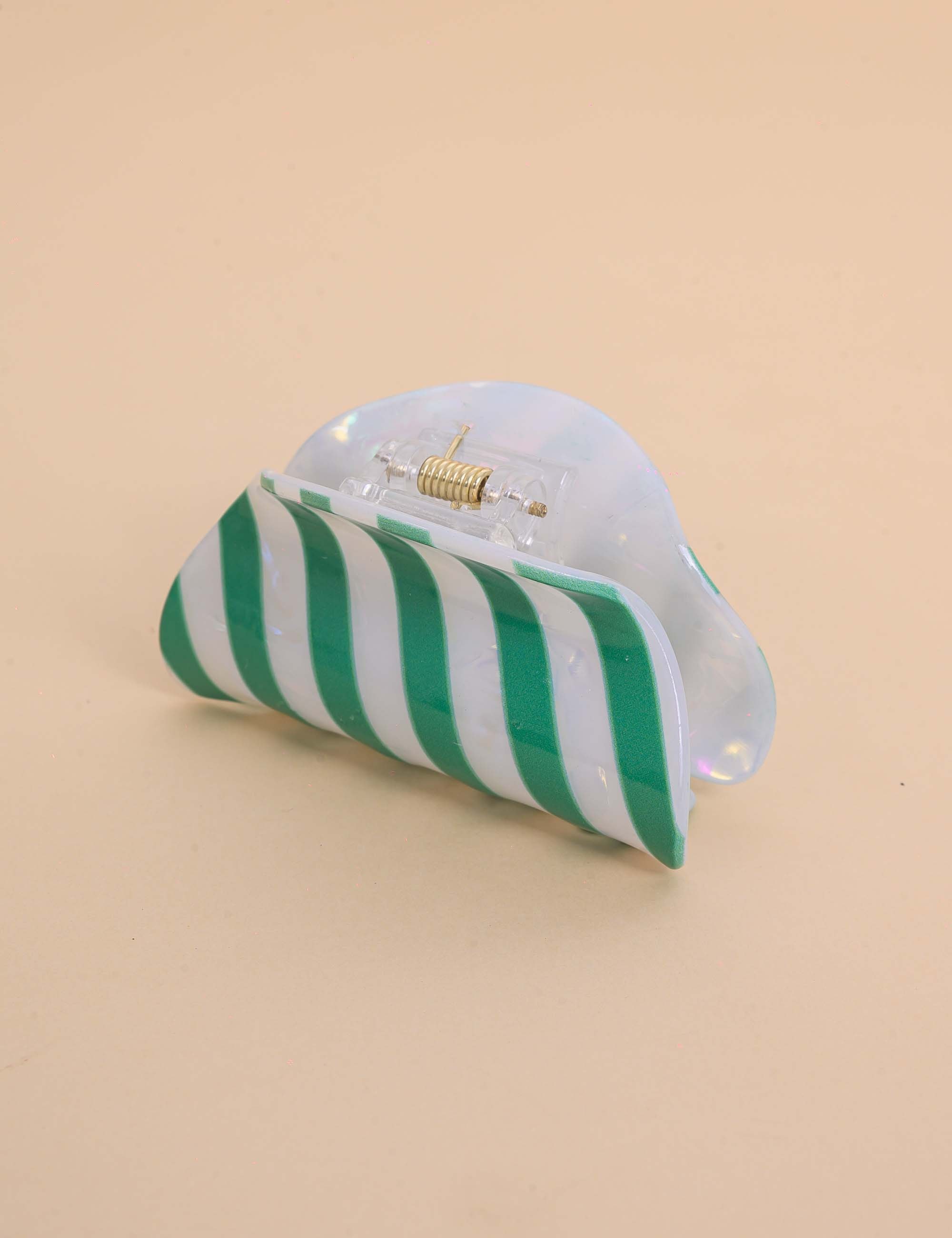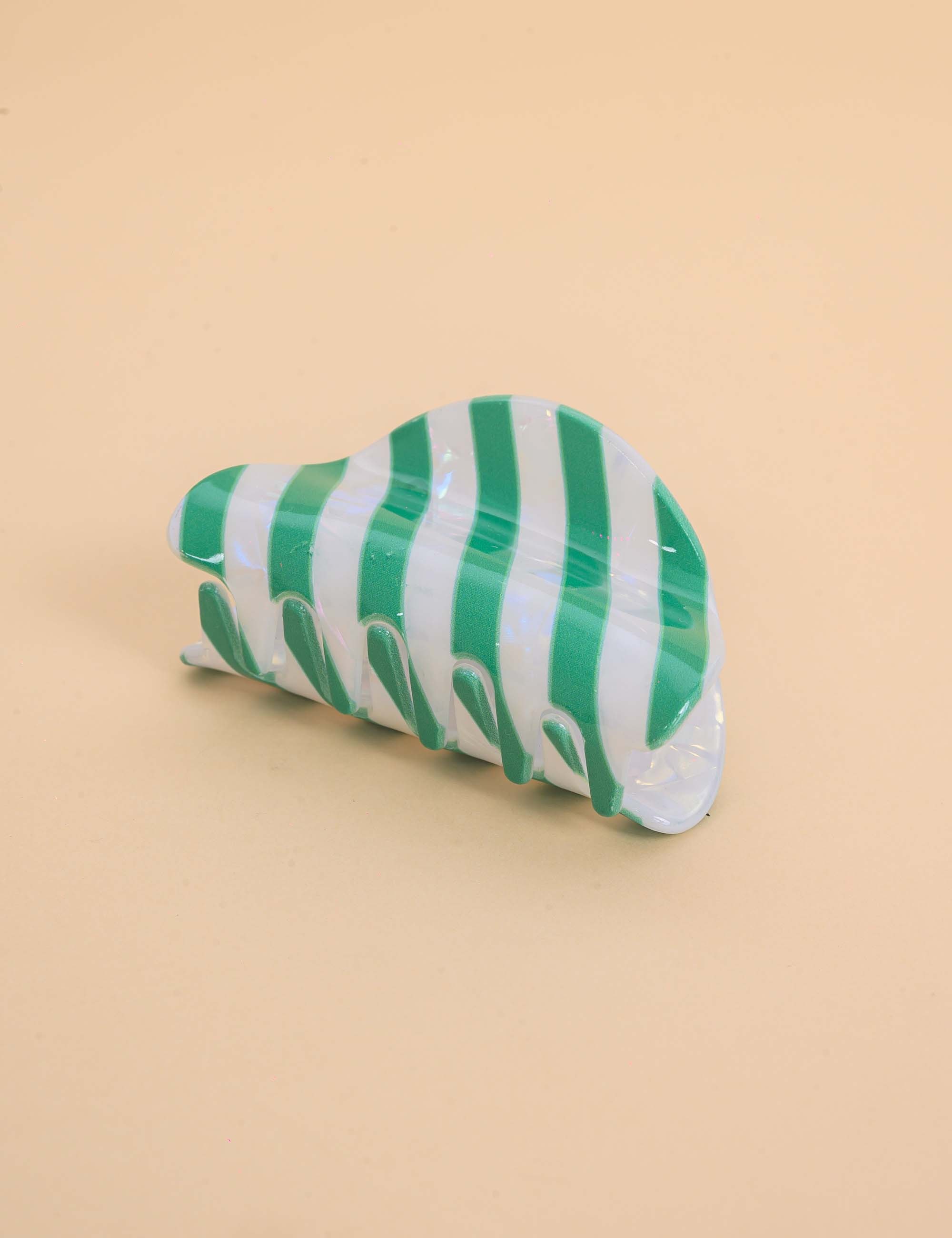 Presilha de resina, com acabamento brilhante e listras verdes. Perfeita para dar um charme extra ao look.