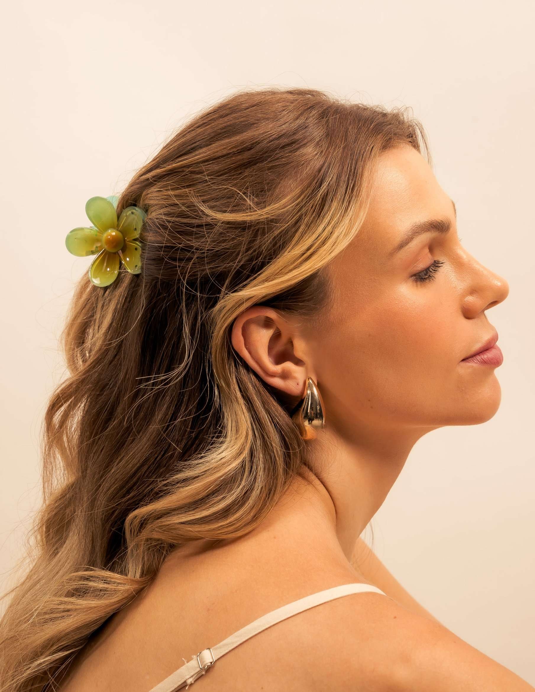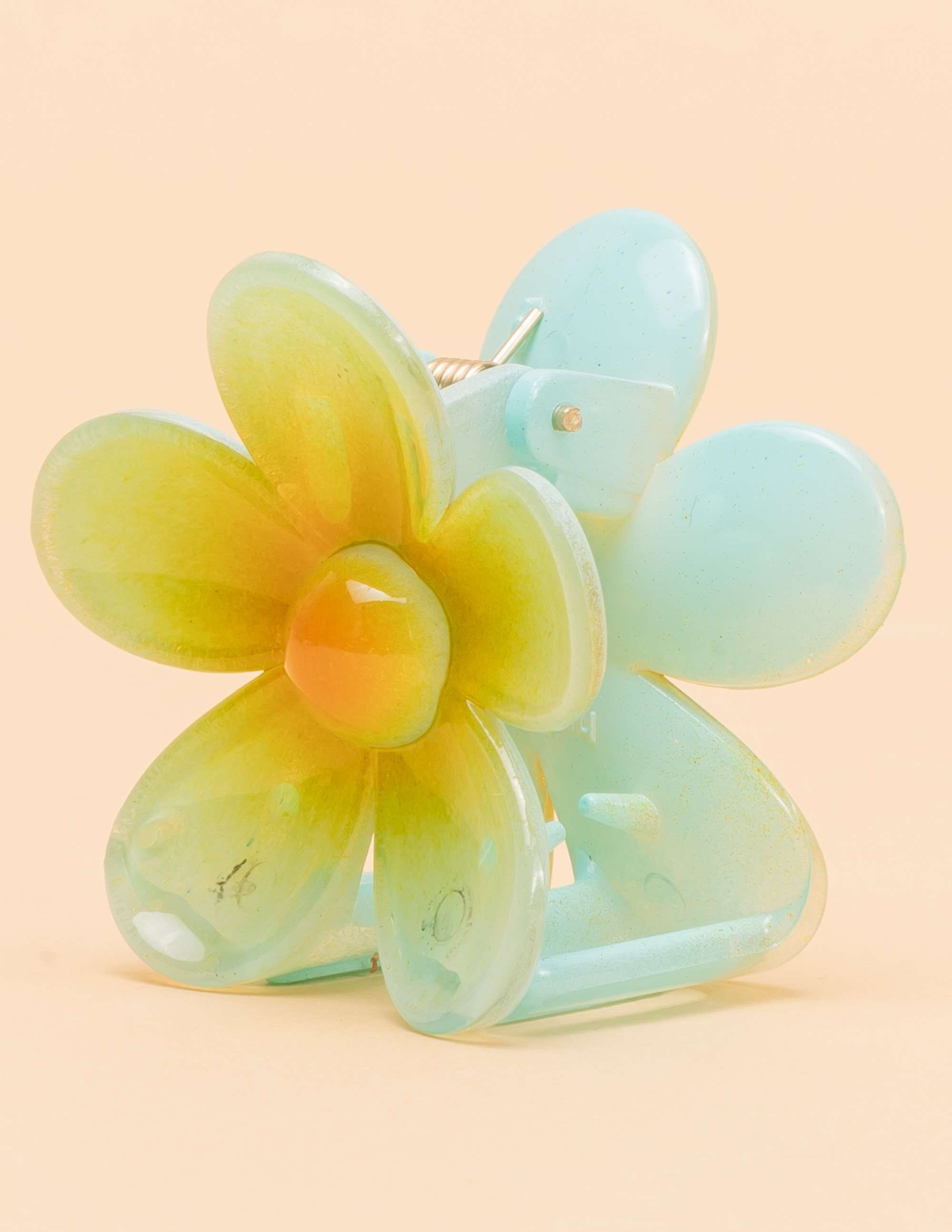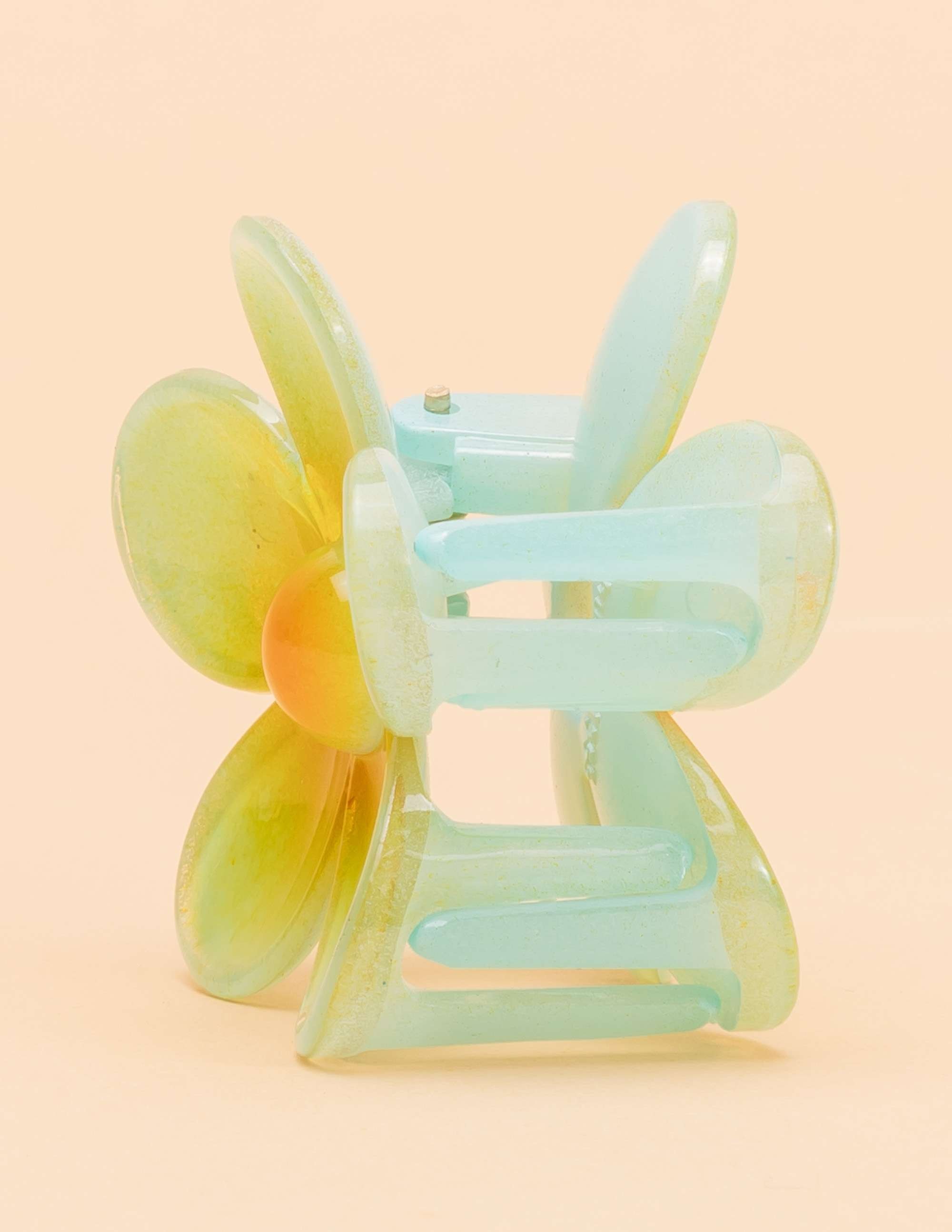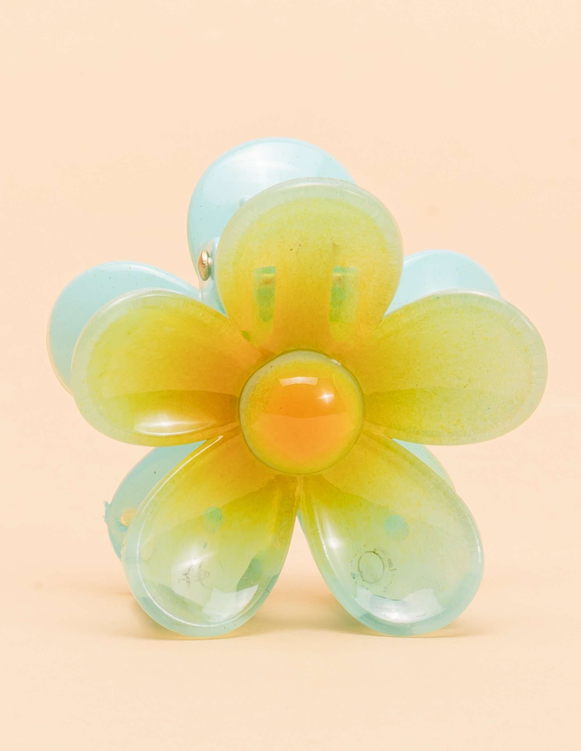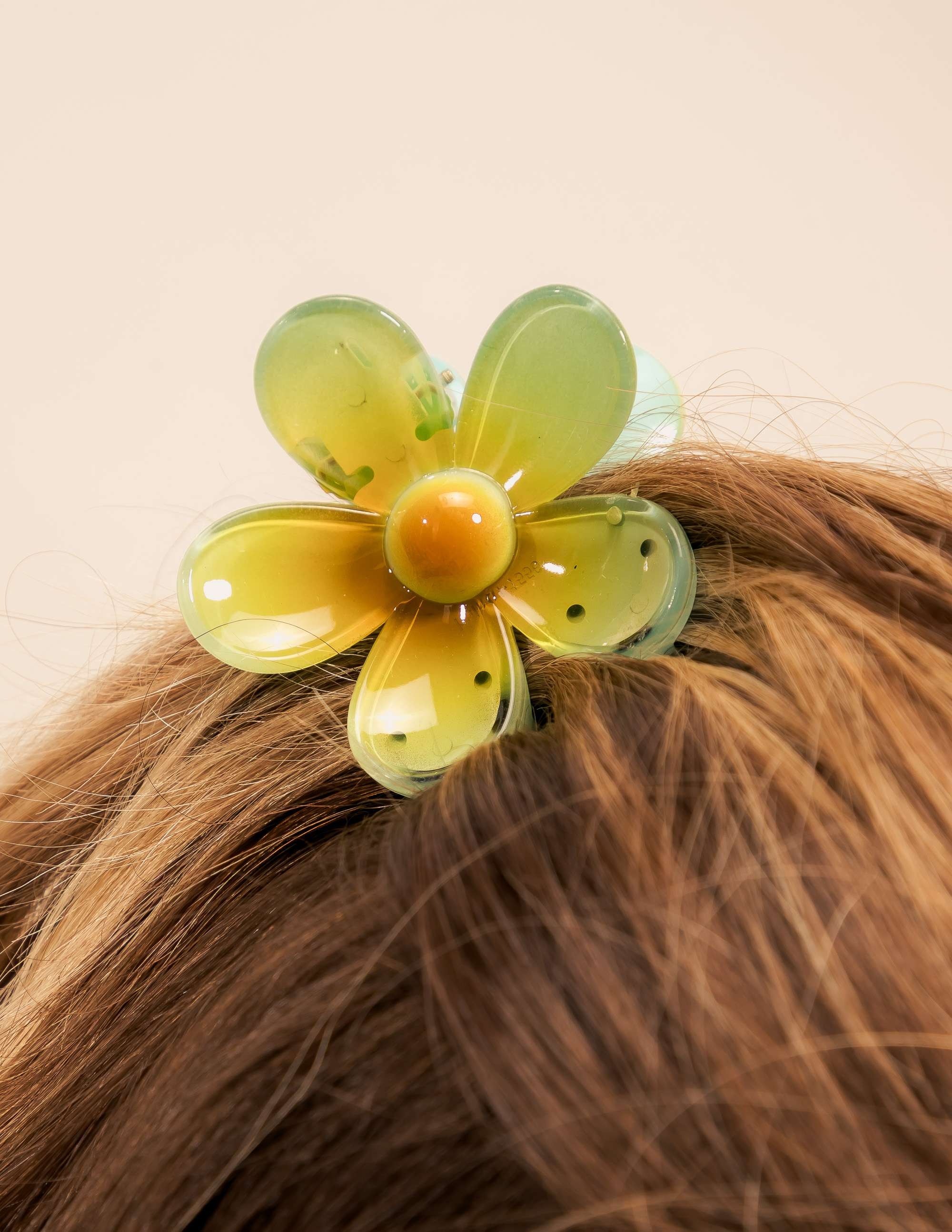 Peça: Presilha resina acrílica em formato de flor e com detalhe no meio na cor amarelo.