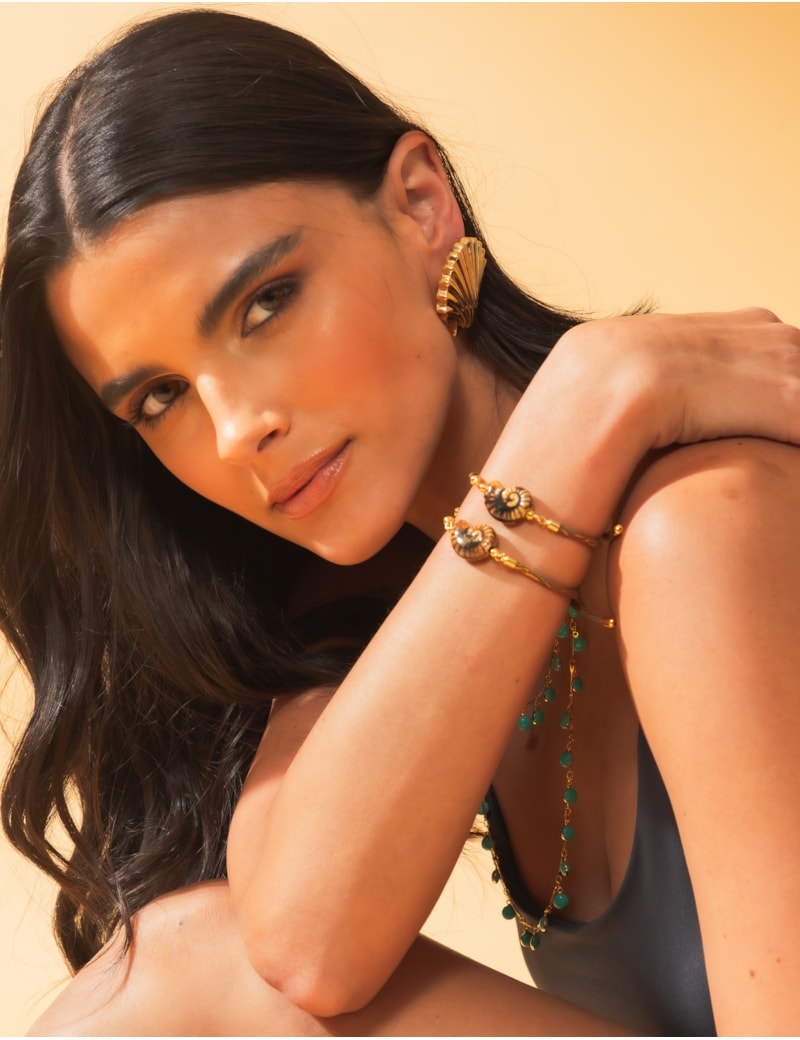 Todos os nossos metais são banhados a ouro, possuem camada protetiva para bijuterias finas e também possuem camada de metal precioso em sua composição. As bijuterias precisam de cuidados, limpe-as com flanela seca e macia, evite contato direto com cosméticos, areia, praia e piscina.