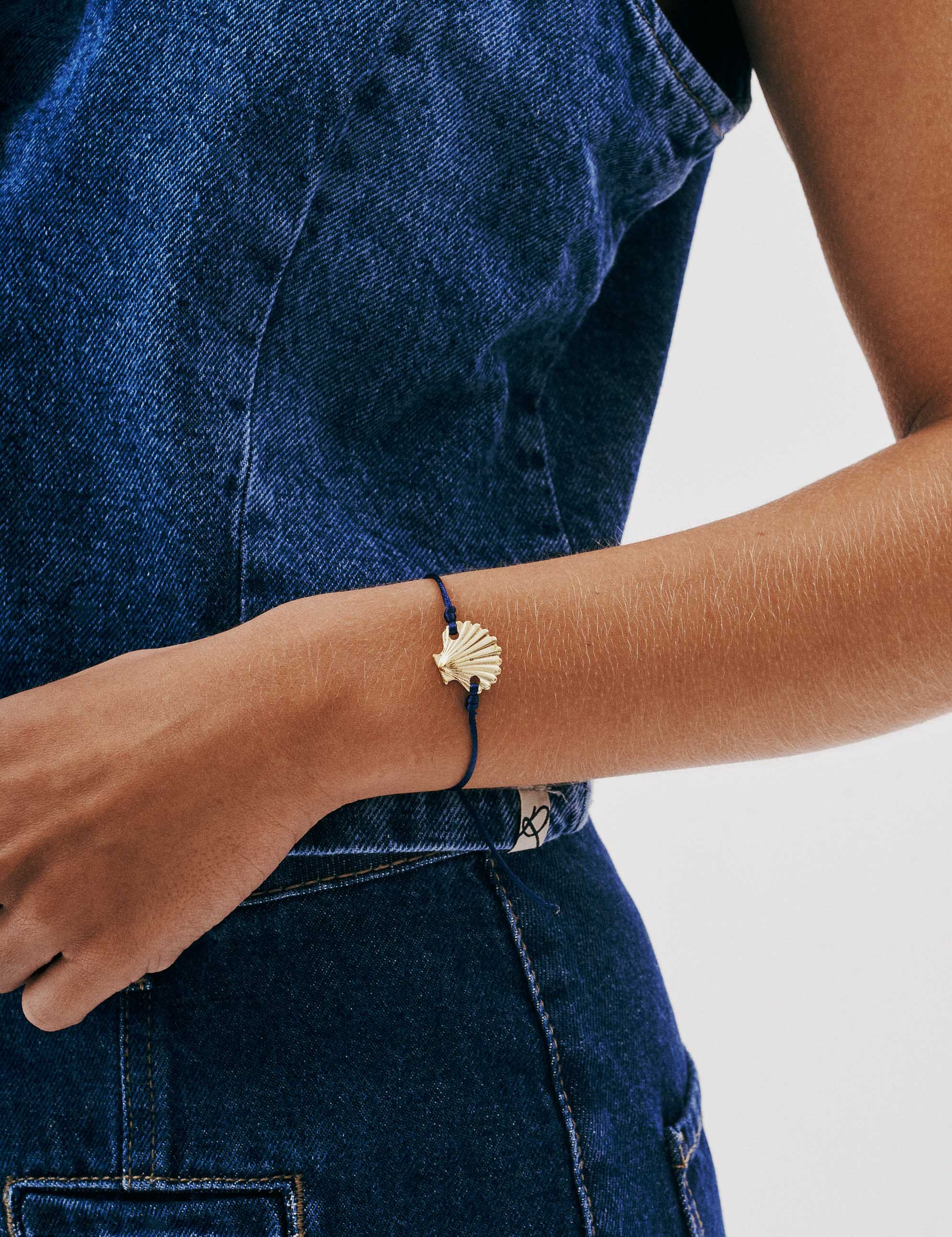 Pulseira com cordão azul e pingente de concha, delicada e charmosa. Perfeita para compor looks leves com um toque praiano.