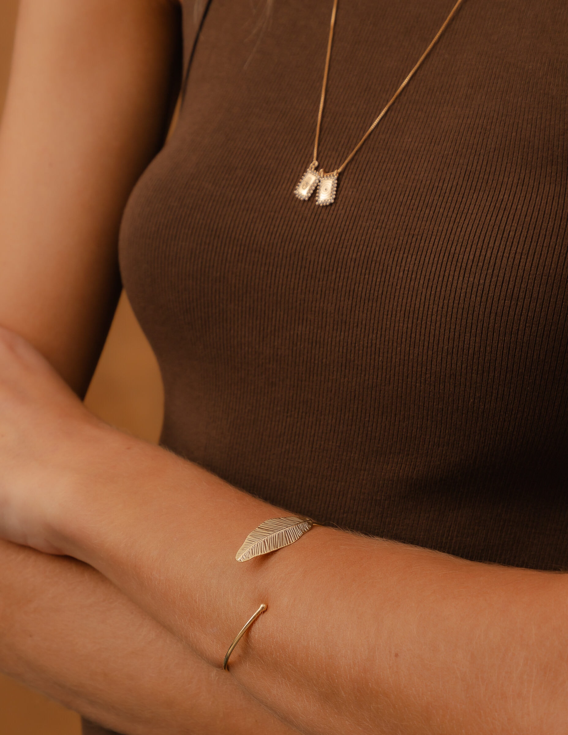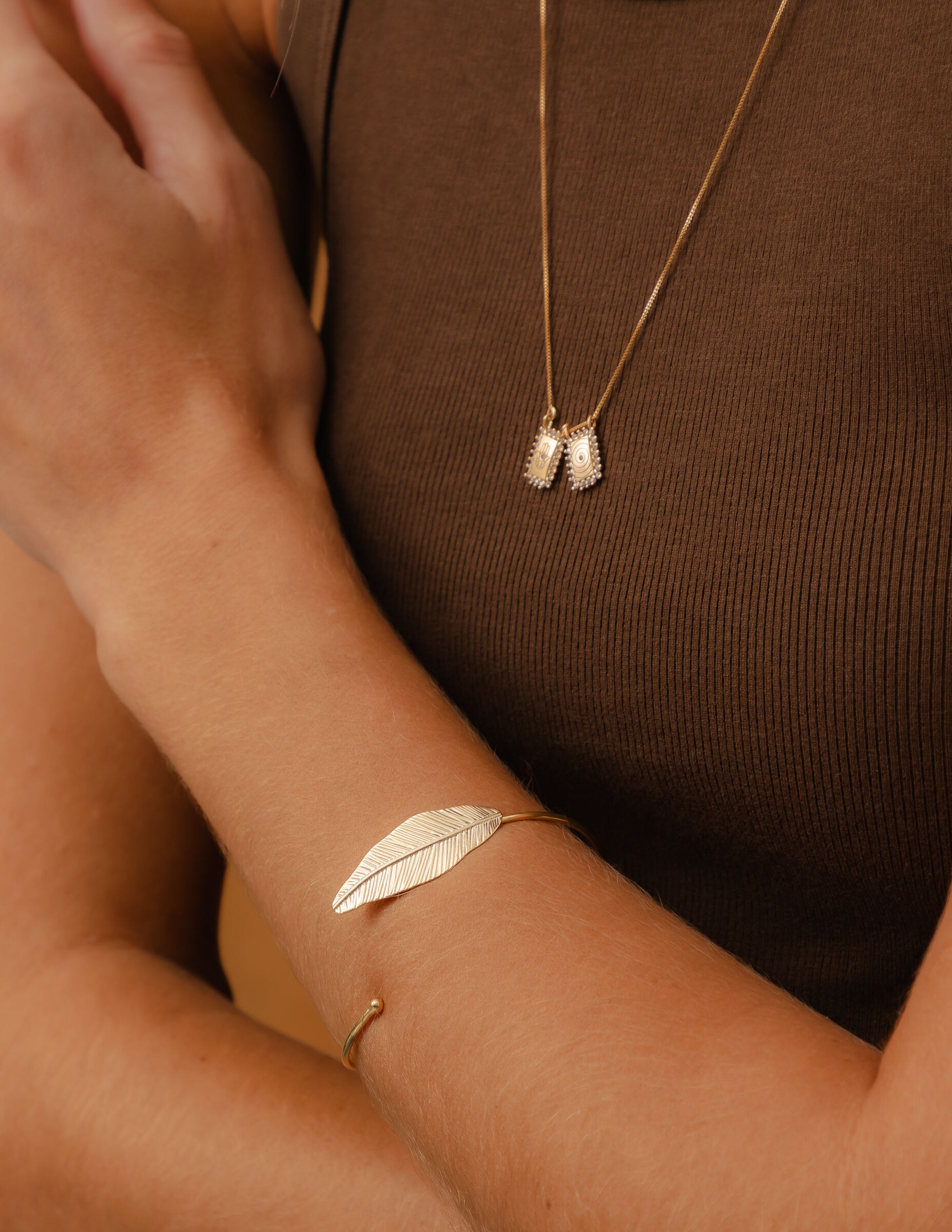 Todos os nossos metais são banhados a ouro, possuem camada protetiva para bijuterias finas e também possuem camada de metal precioso em sua composição. As bijuterias precisam de cuidados, limpe-as com flanela seca e macia, evite contato direto com cosméticos, areia, praia e piscina.