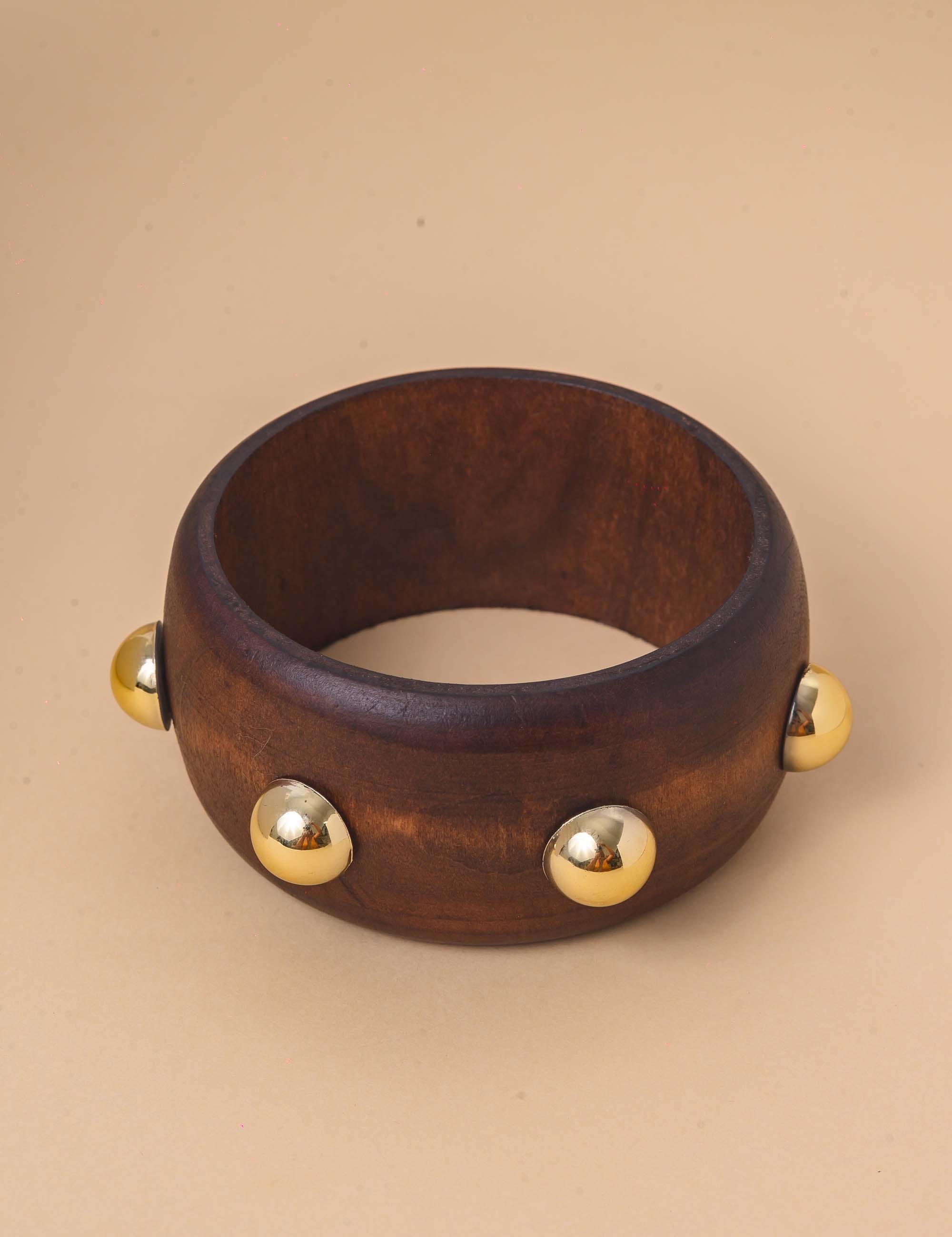 Design rústico com toque sofisticado: bracelete em madeira natural com esferas em banho de ouro. Elegante, leve e perfeito para compor um visual moderno e orgânico.