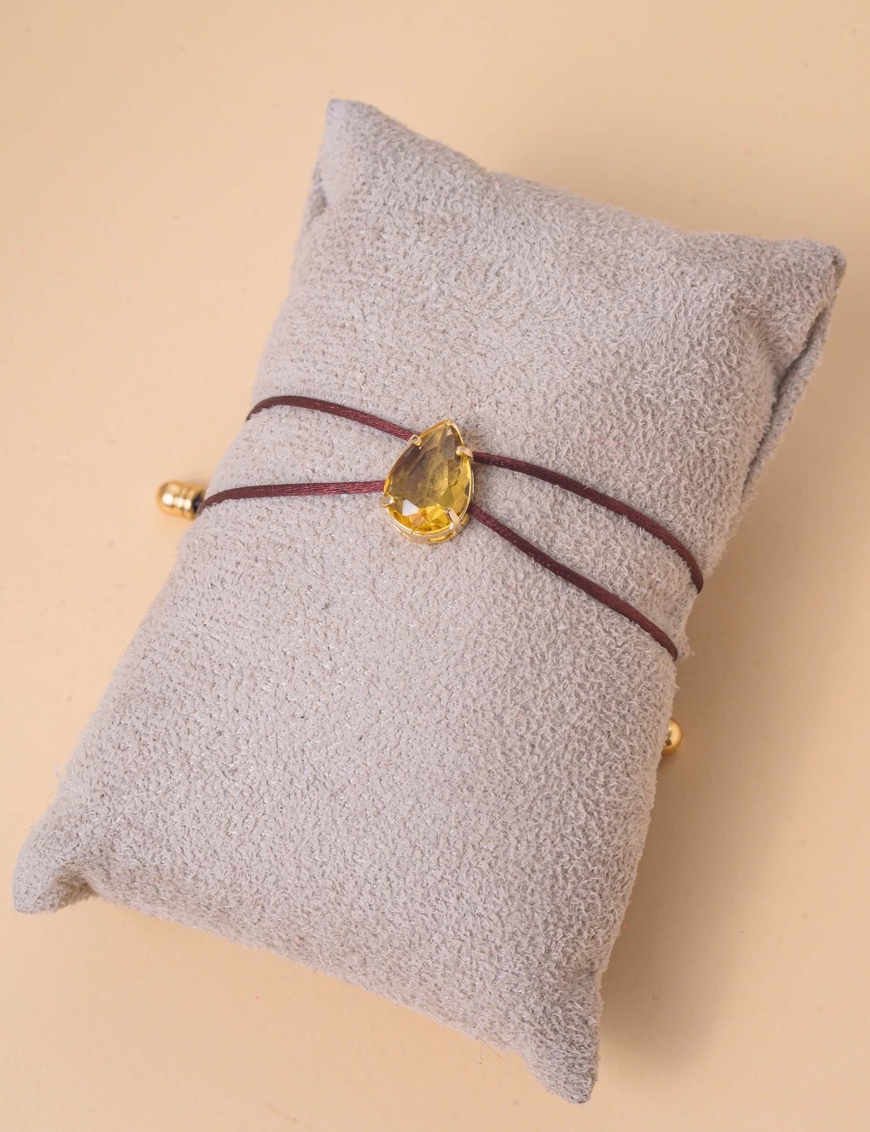 Pulseira moderna em tom marrom, destacada pelo pingente de cristal amarelo que traz brilho e elegância ao visual.