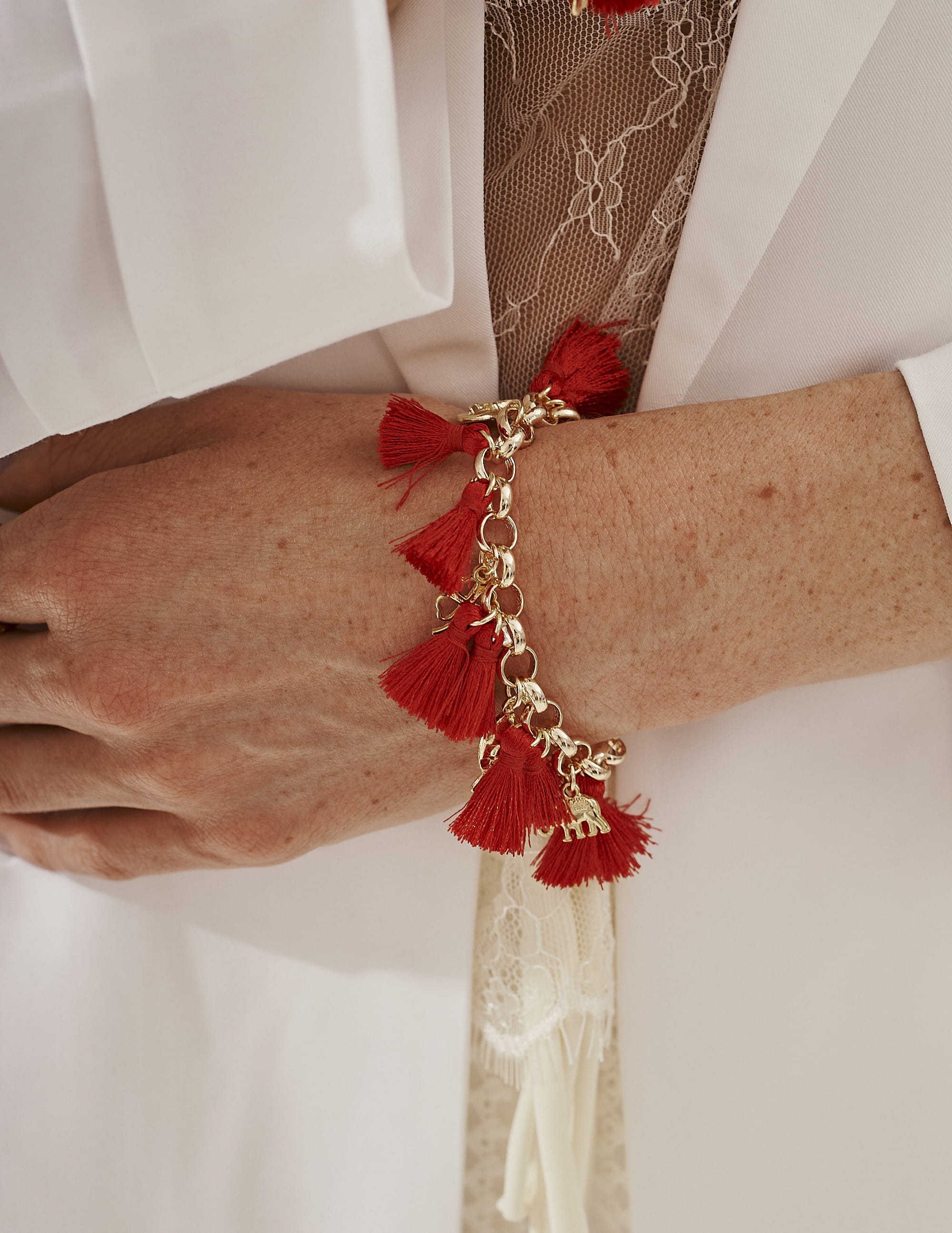 Pulseira dourada com tassels vermelhos e pingentes temáticos, trazendo um toque leve e cheio de charme. O mix de símbolos deixa a peça divertida e moderna, perfeita para destacar qualquer look com um detalhe único e estiloso.